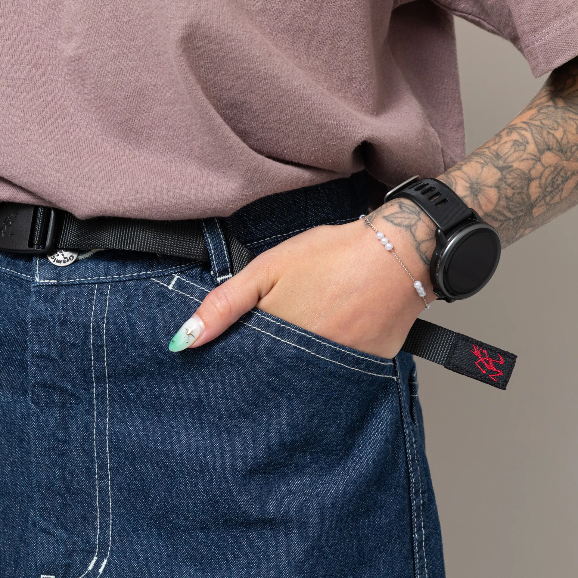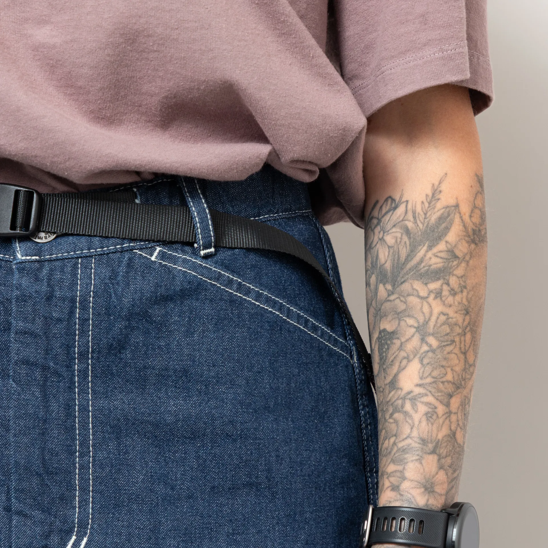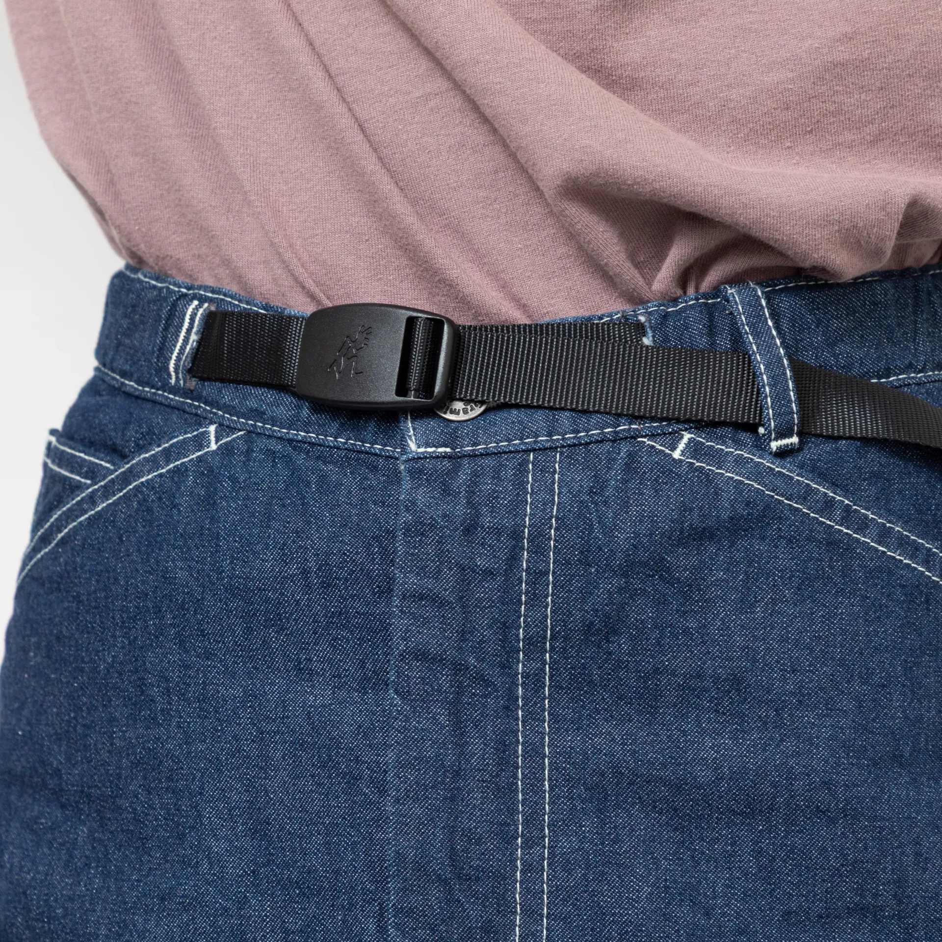 A functional utility skirt from Gramicci's womenswear collection, constructed from 11oz eco cotton denim and designed to sit around ankle length. It has a zip and button fly, leading to an elatsicated waistband with the signature integrated belt to adjust, three pockets at the front, two to the back and white contrast stitching throughout. The design is finished with a split at the back for freedom of movement and a cool Gramicci patch to the back waistband.
