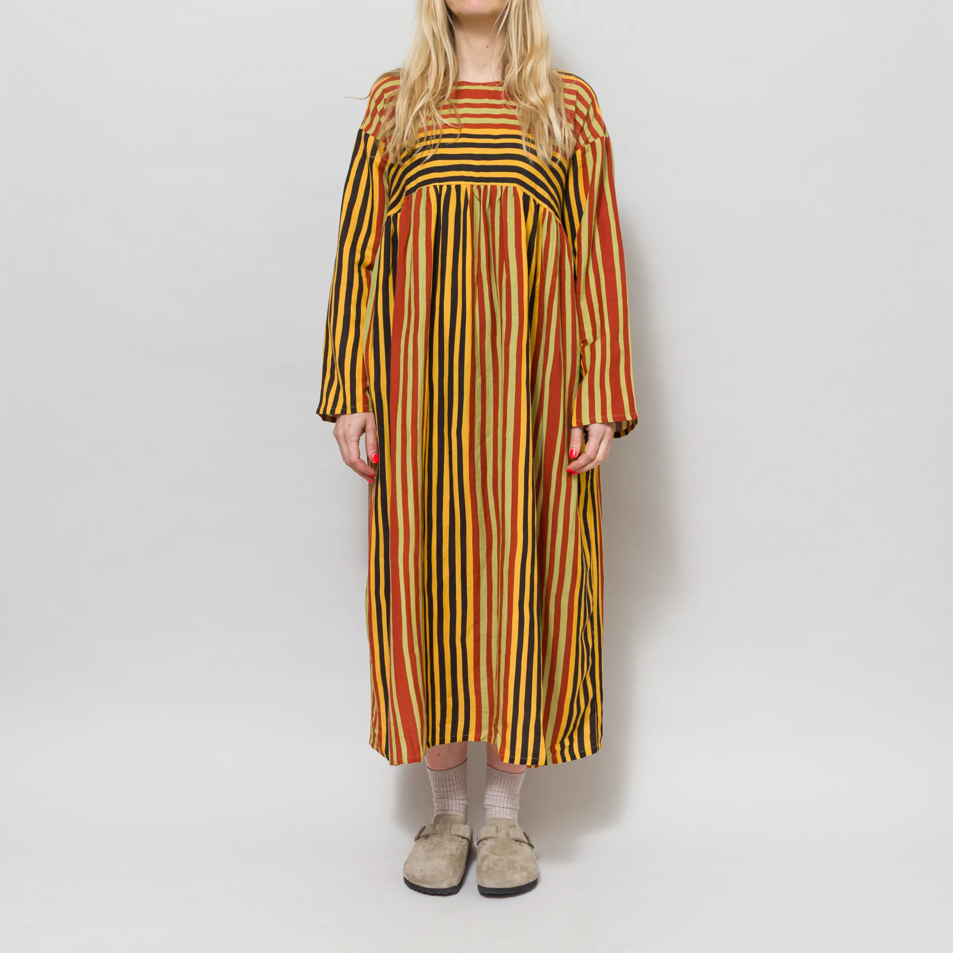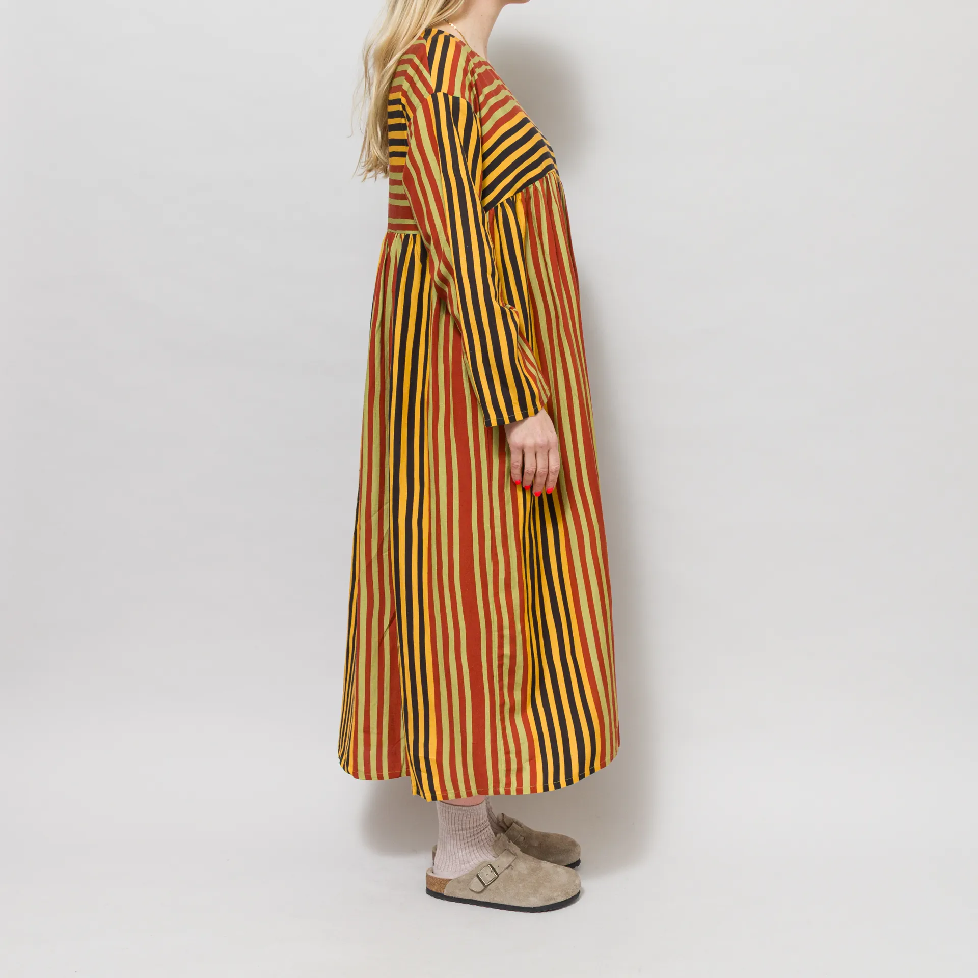 A midi-length dress from L.F. Markey, constructed from a soft linen-rayon blend with a striking all-over striped design. It's been cut in a spacious, relaxed fit for a casual silhouette and has a round neckline fastened with a zip at the back. It features an empire waistline gathered below the bust, adding volume to the skirt, with longsleeves and side seam pockets.