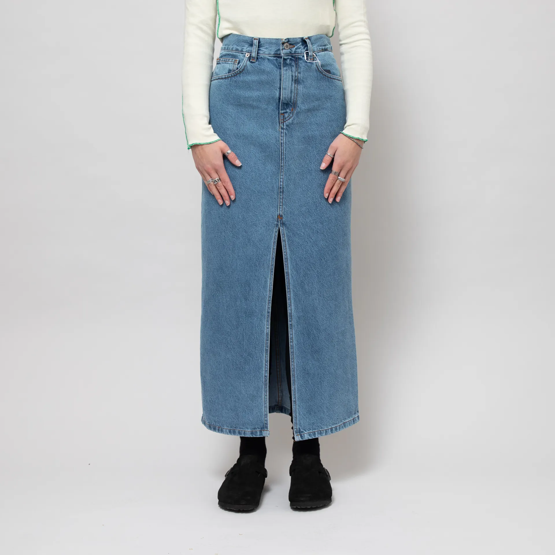 The Moliere Skirt from Rita Row has been cut in a regular fit for everyday comfort and is constructed from soft cotton/recycled cotton denim. It features a zip and button fly, leading up to a classic belt loop waist, with a five-pocket design and a single slit down the centre front.