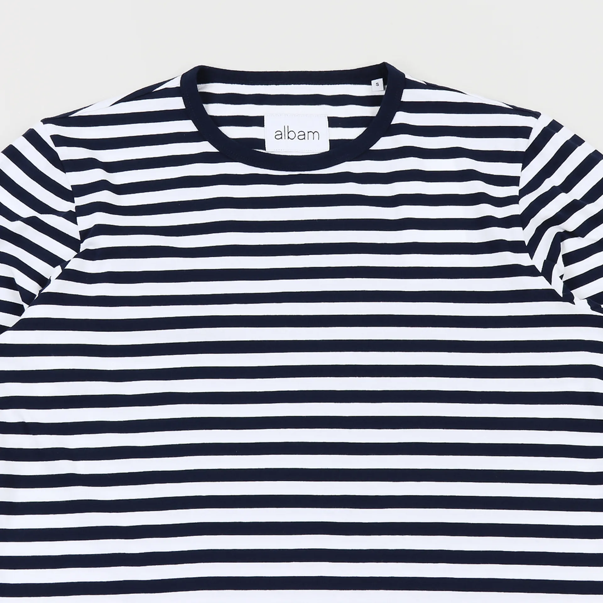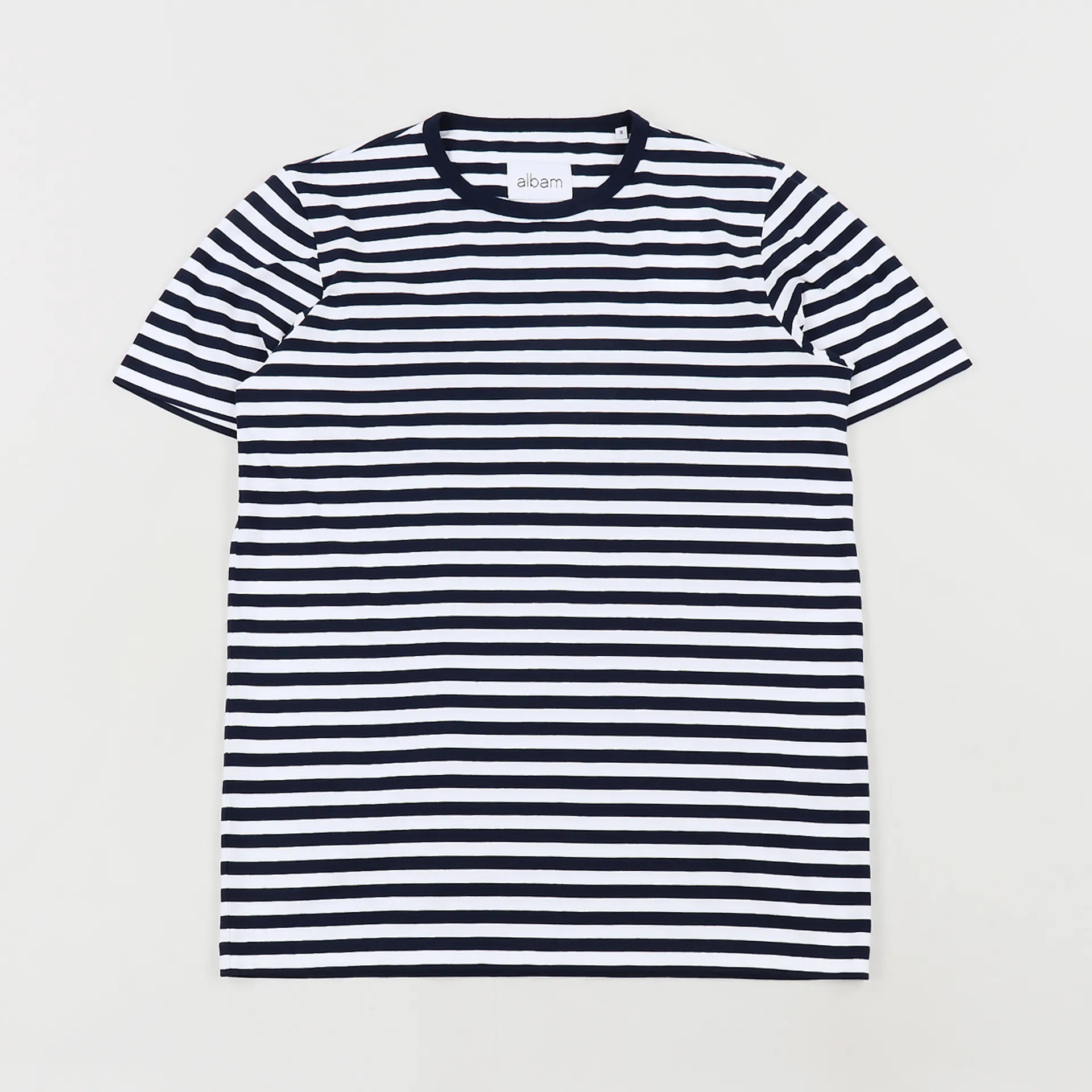 Albam was founded in 2006, and reels inspiration from numerous ponds, coming together to produce contemporary menswear that combines timeless utilitarian ideals, such as quality production and construction, with a blend of modern and retro silhouettes and styles. This tee is made from 100% cotton in an extremely soft and comfortable single jersey which was made in Portugal. It has a ribbed crew neck and the simple stripe pattern.