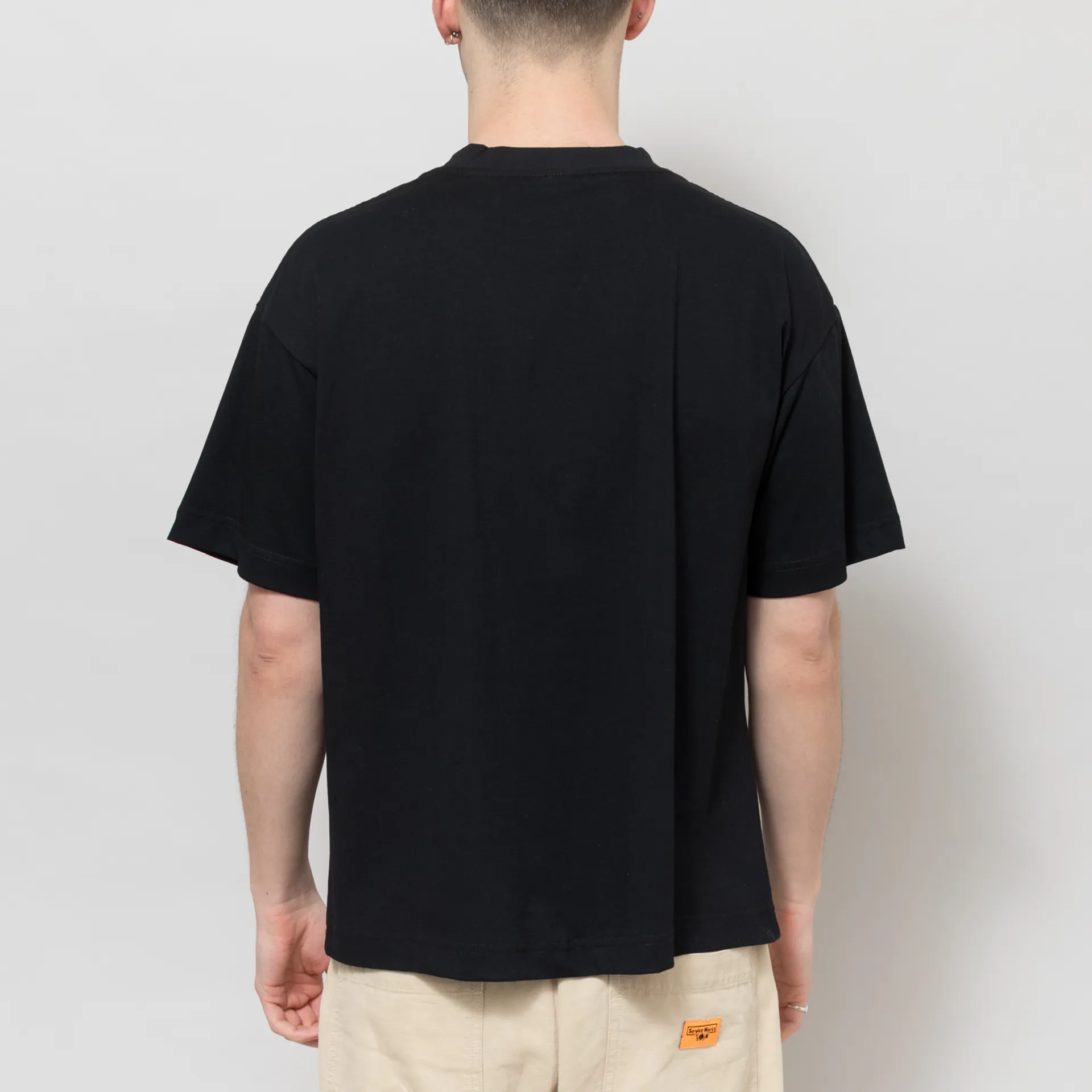 This is a loose, boxy fit - expect your usual size to be loose over the chest and shoulders, with a shorter hem.