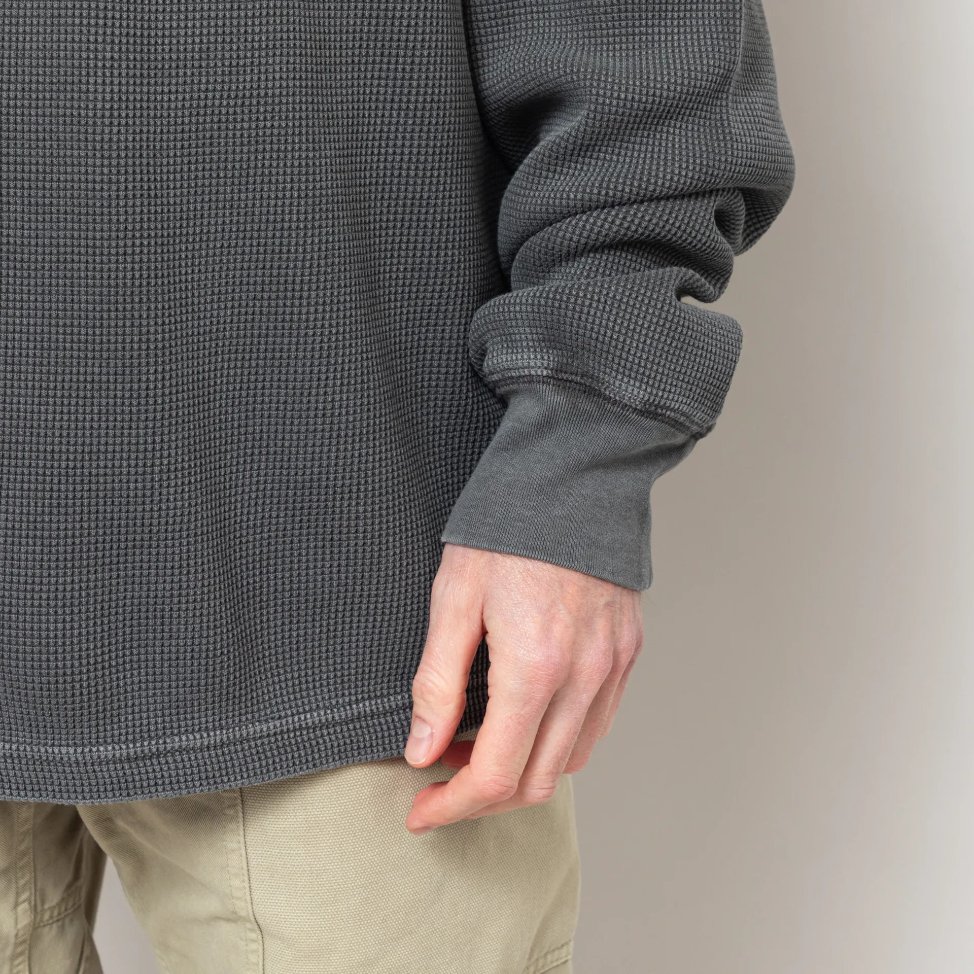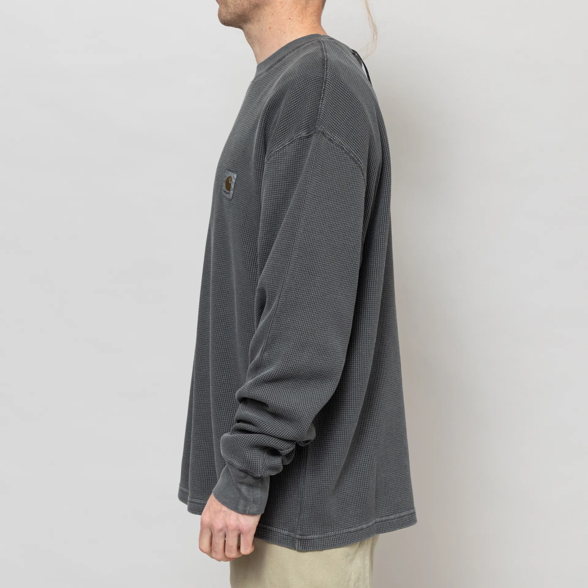 A long-sleeve waffle tee from Carhartt WIP, cut in a loose fit for a laidback silhouette and constructed from heavyweight cotton waffle fabric. It's been garment-dyed for a softer feel and more complex colour configuration. Featuring a ribbed crewneck and cuffs, a straight hem and a woven Square label to the chest.