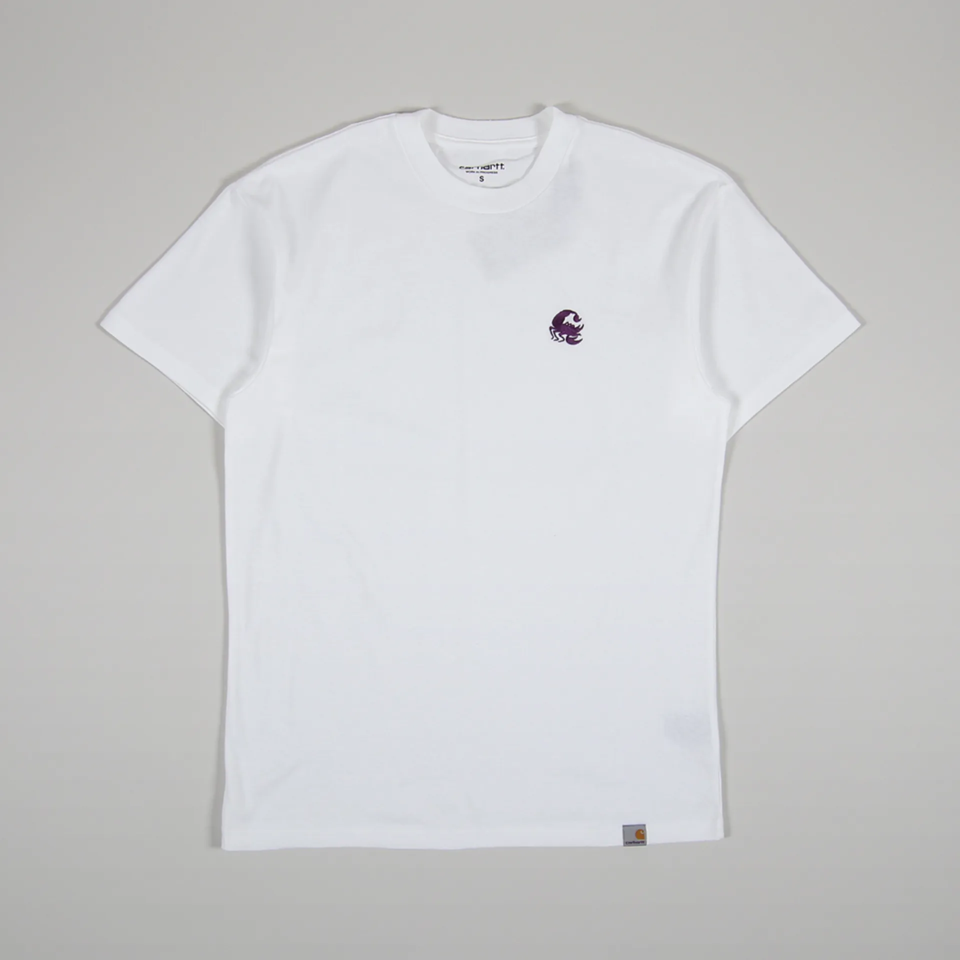 A short sleeve tee from Carhartt WIP made from a super soft and comfortable single jersey of 100% cotton with a ribbed crew neck, a woven logo patch to the hem and an embroidered Scorptions C design to the chest.