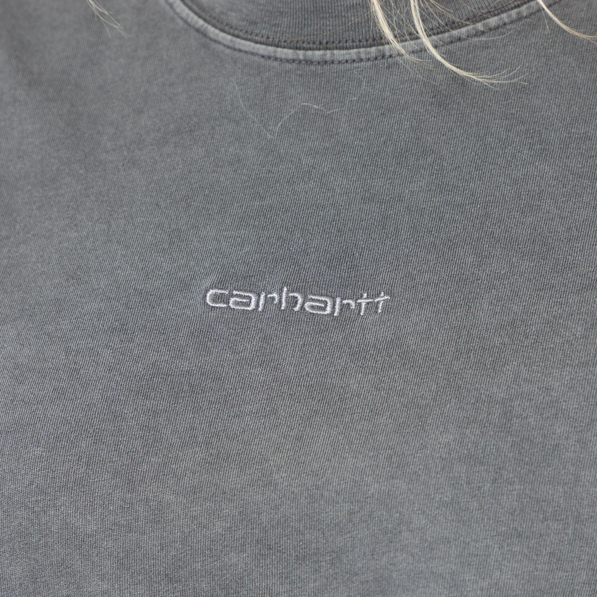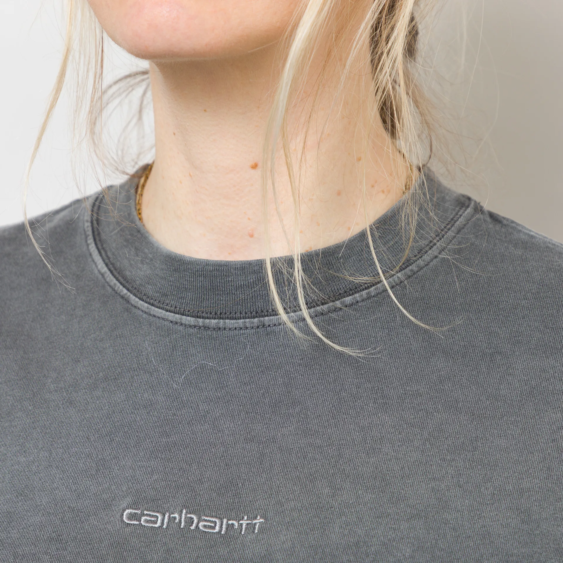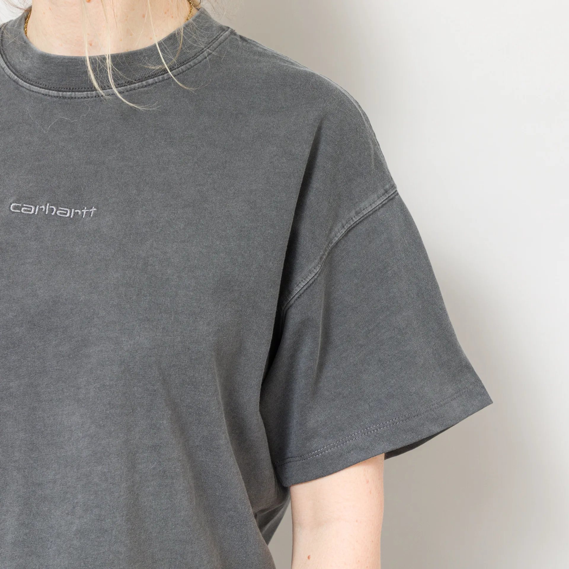 A loose, cropped tee from Carhartt WIP's womenswear collection, constructed from midweight organic cotton jersey, garment-dyed for a softer feel and more complex colour configuration. It has a ribbed crewneck, dropped shoulders and a tonal embroidered script logo at the centre front.