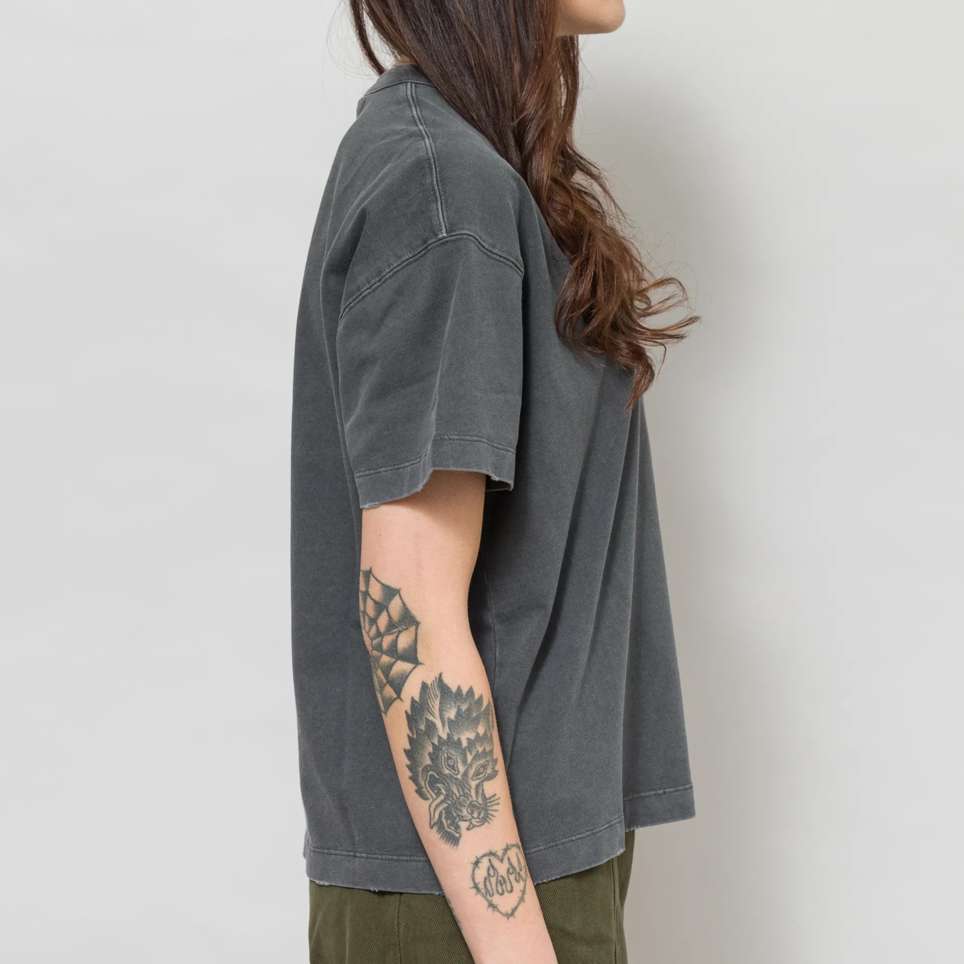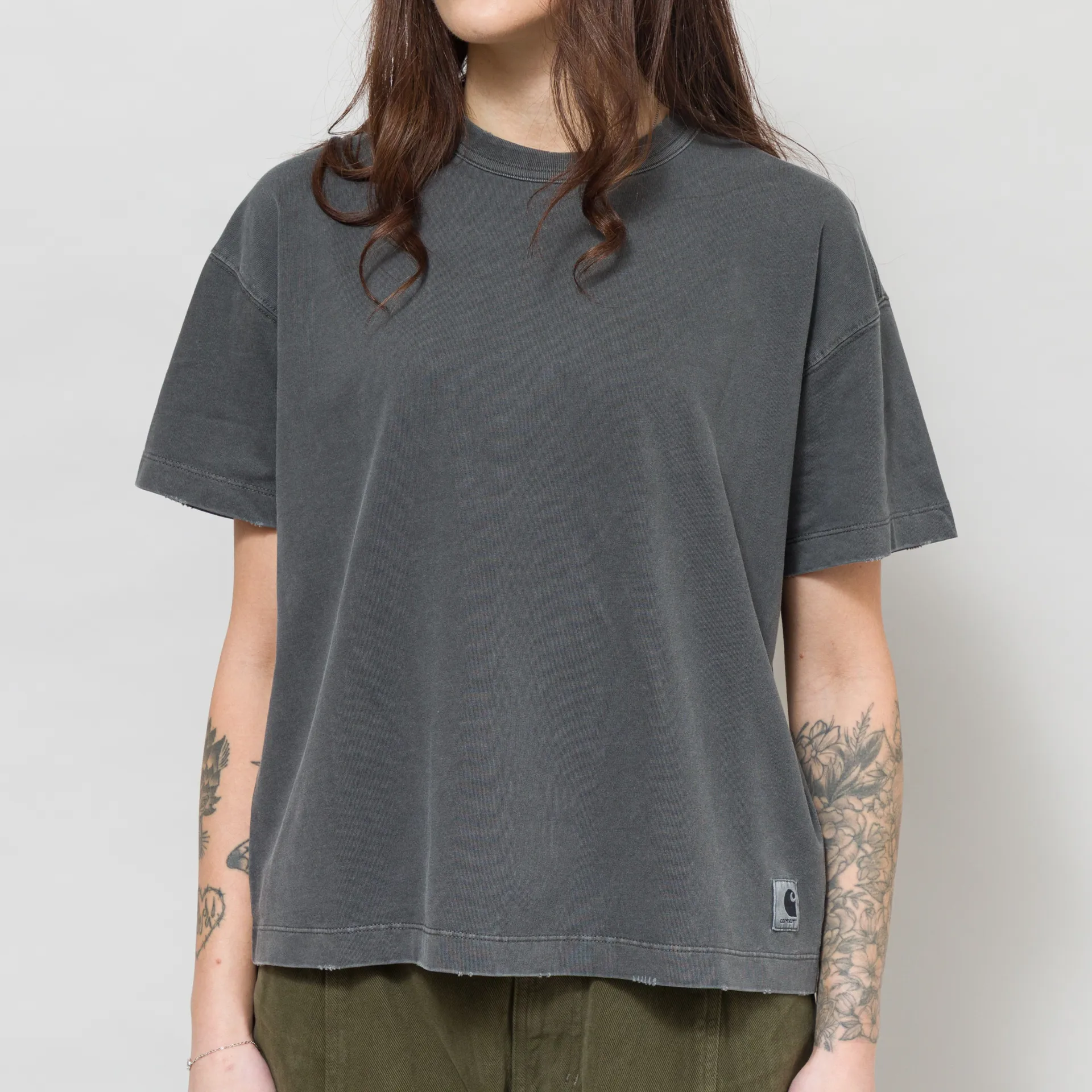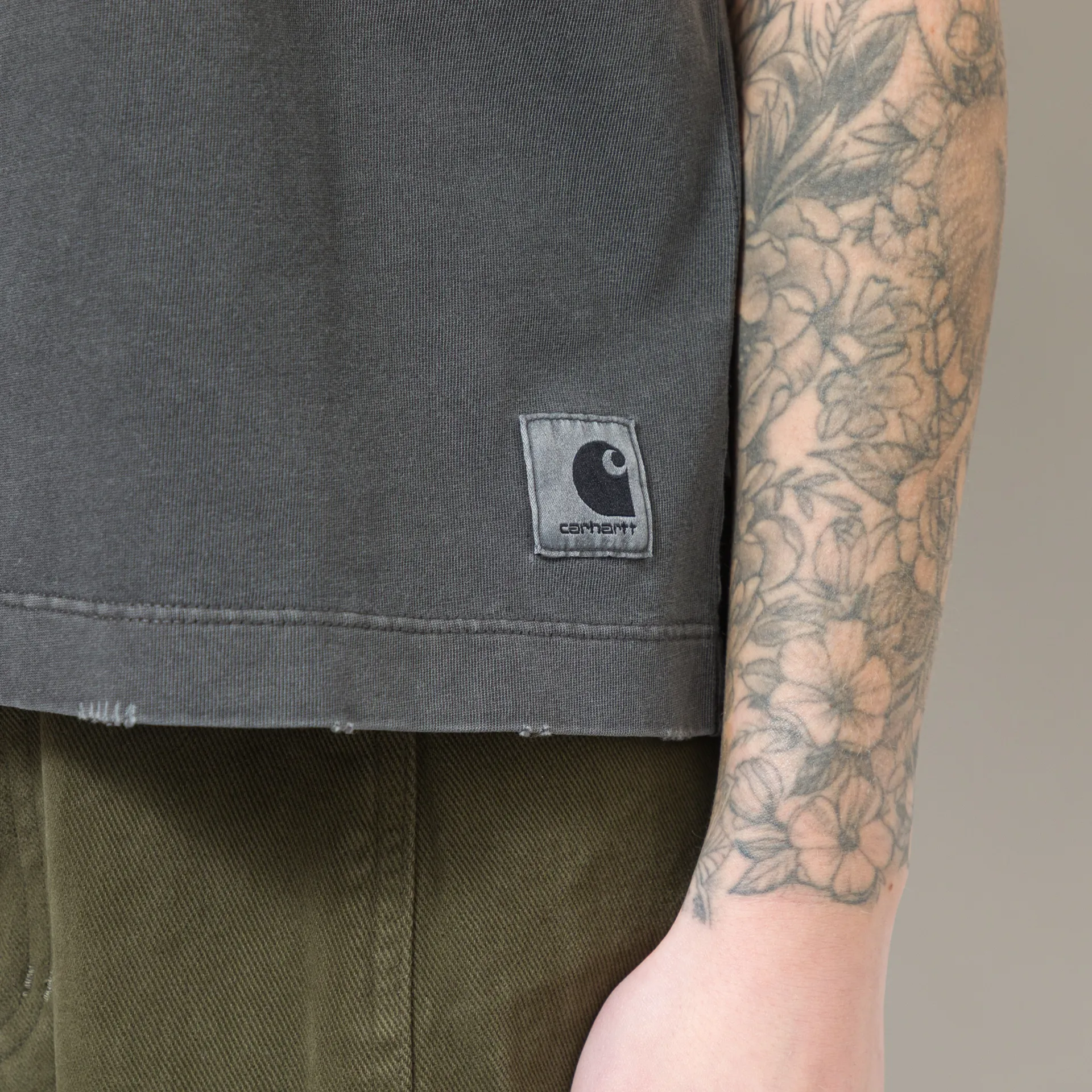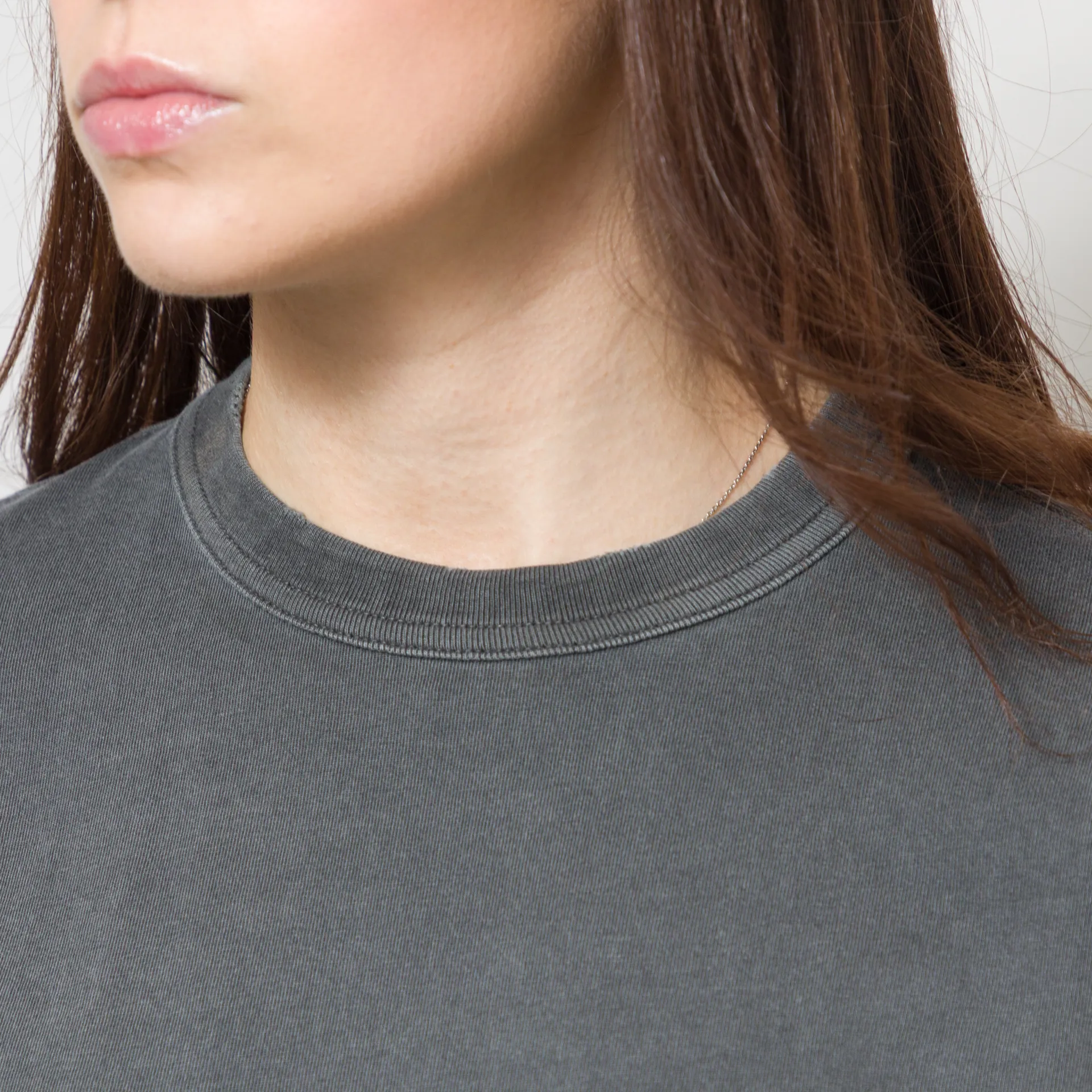 A short-sleeve tee from Carhartt WIP, cut in a loose fit with dropped shoulders for a casual look. It's constructed from midweight organic jersey that has undergone a grind wash, a process which results in a slightly distressed, worn-in finish. It features a ribbed crewneck, a straight hem and is finished with a woven Square Label, rendered murky by the overdying process.