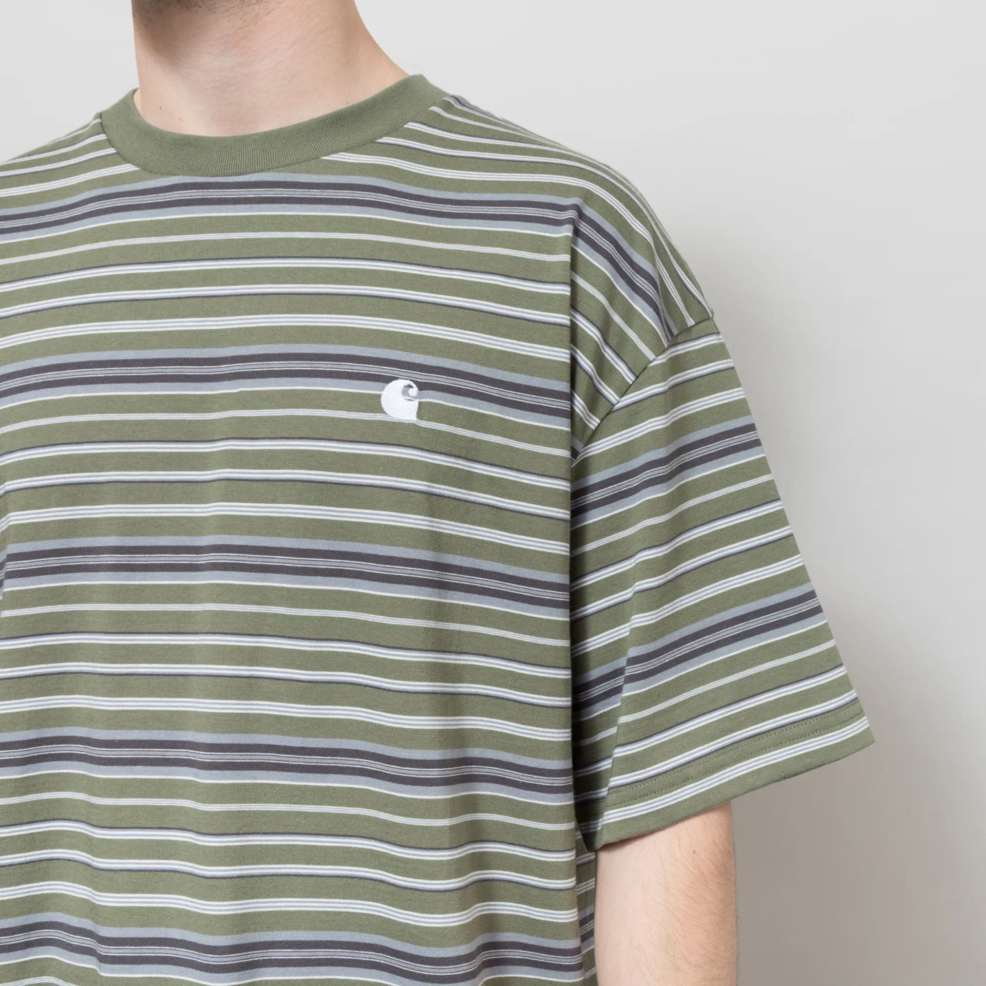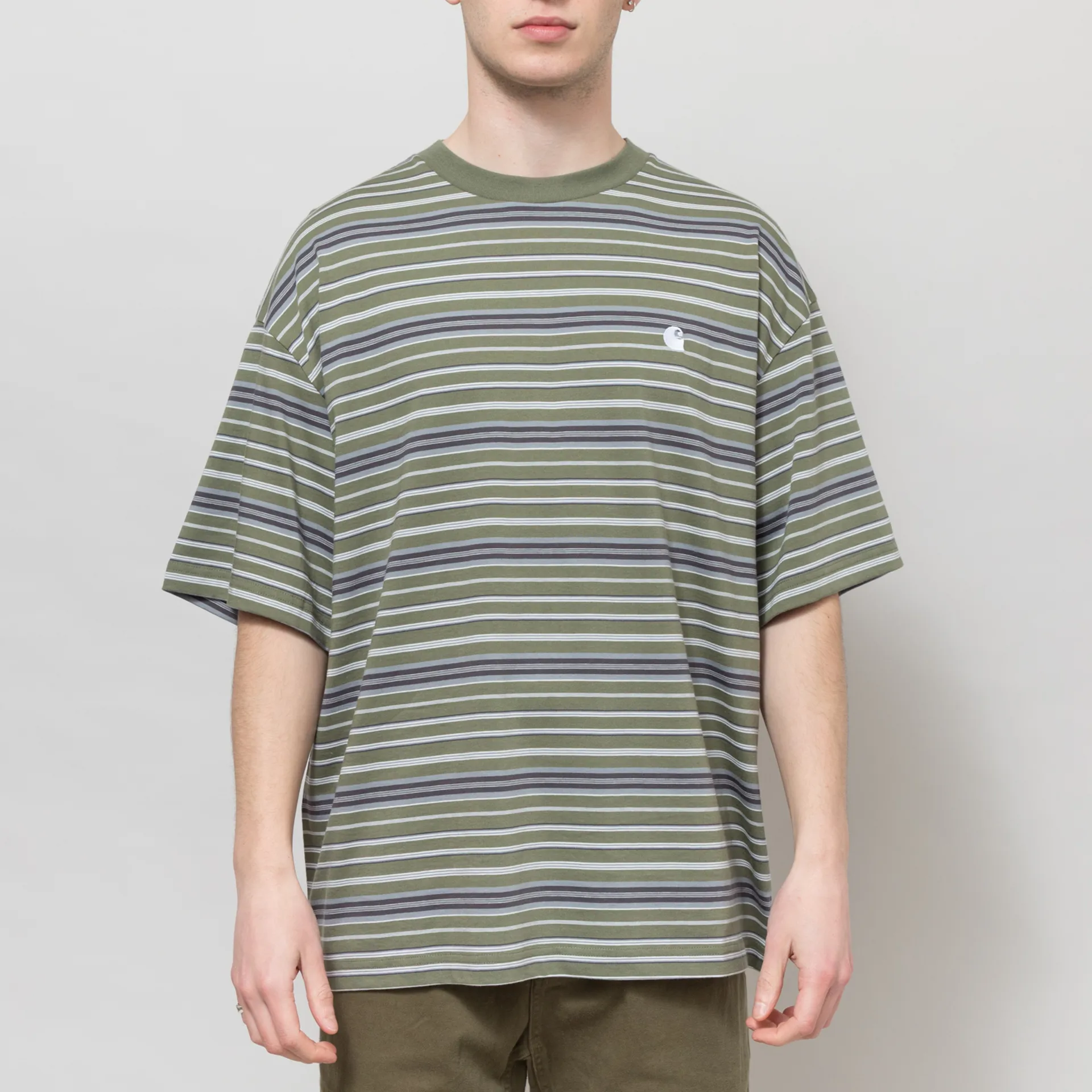 A striped tee from Carhartt WIP, cut in an oversized fit for a laidback silhouette and constructed from midweight cotton jersey fabric. Featuring a ribbed crewneck, dropped shoulders and a straight hem. The design is complete with an embroidered C logo at the chest.