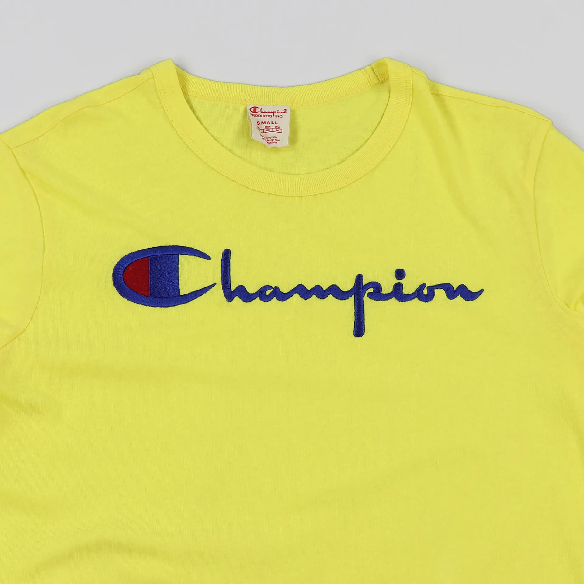 A short sleeved tee from Champion which features a large embroidered logo across the front and a smaller one to the sleeve. A ribbed crew neck sits on Champion's Reverse Weave.