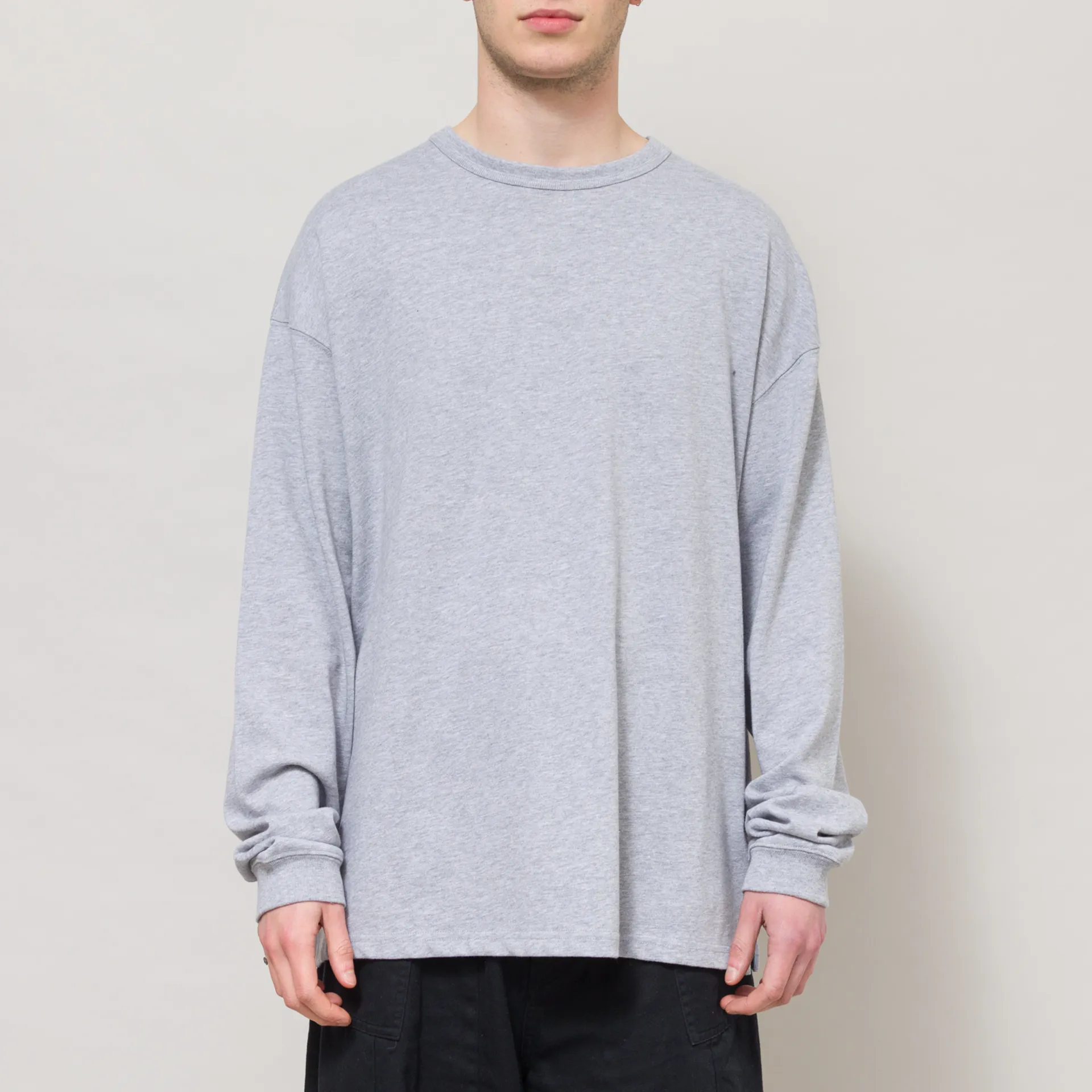 A heavyweight long sleeve from Frizmworks Original Garments line, constructed from high-density, 20-count cotton fabric. It's cut in a loose fit for a laidback silhouette and has a double-layered ribbed crewneck and cuffs, with a straight hem
