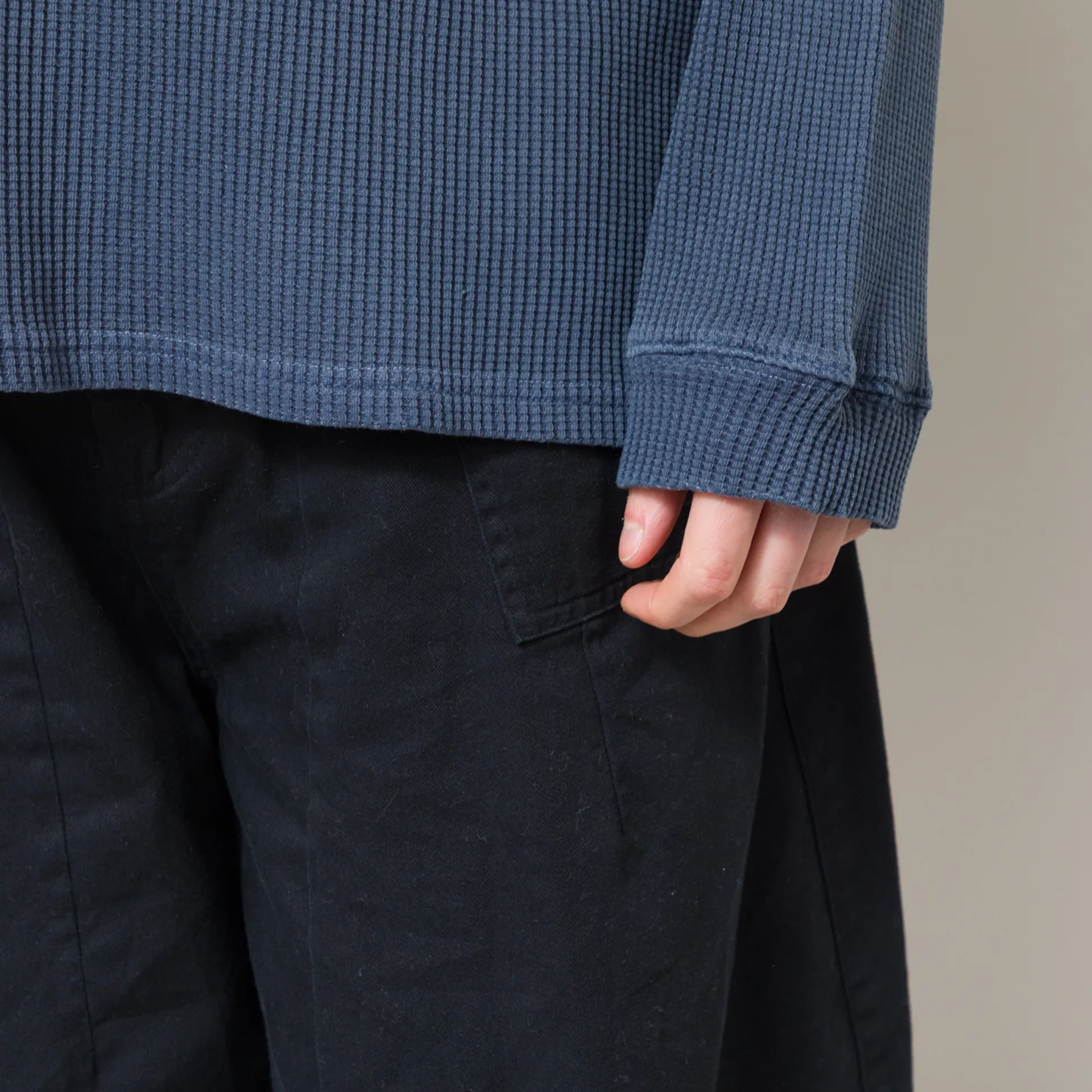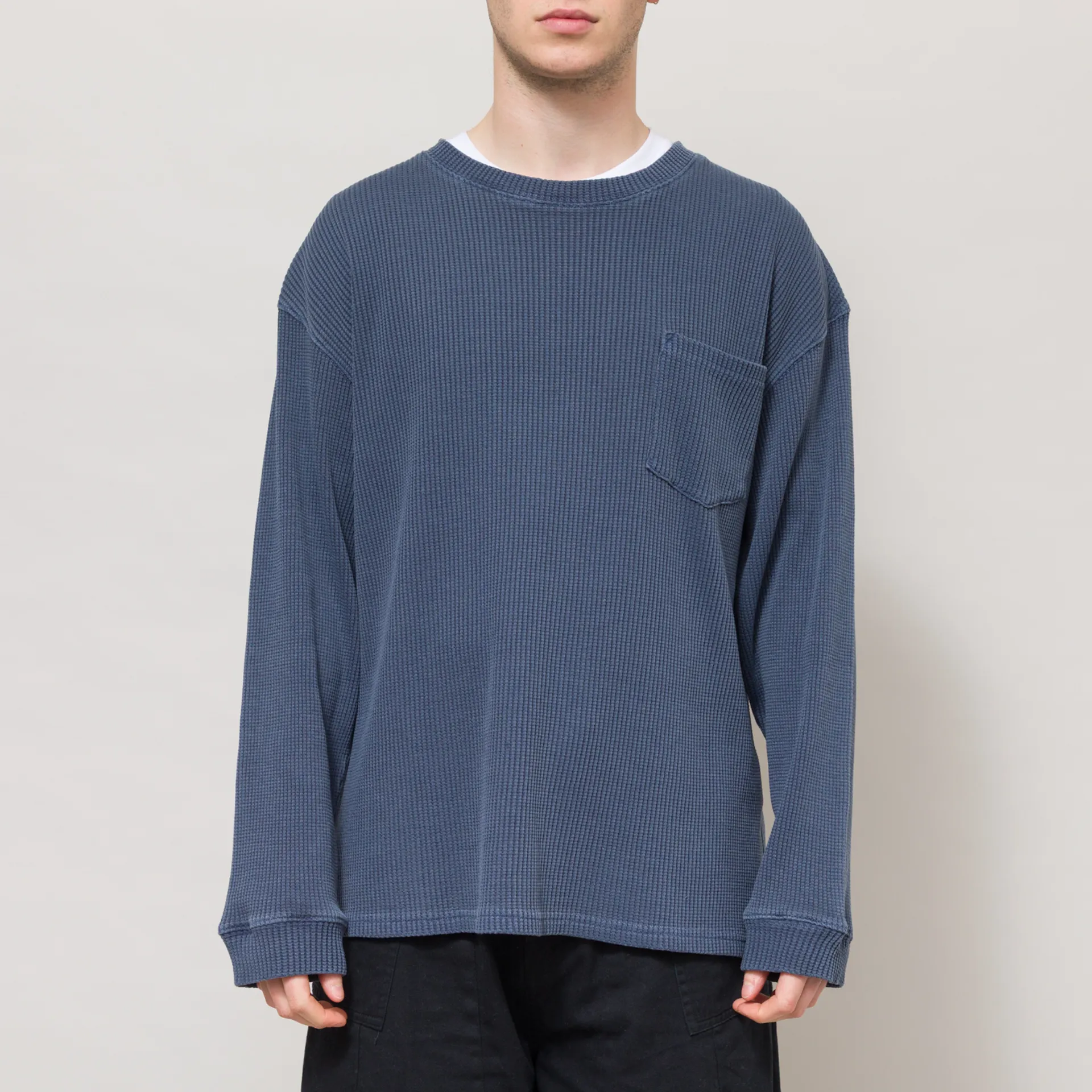 A long sleeve tee from Frizmworks, cut in a loose fit for a laidback silhouette and crafted from durable cotton waffle fabric. It's been pigment-dyed for a worn-in look and heavily washed for softness. Featuring a ribbed crewneck and cuffs, dropped shoulders and a single patch pocket at the chest.