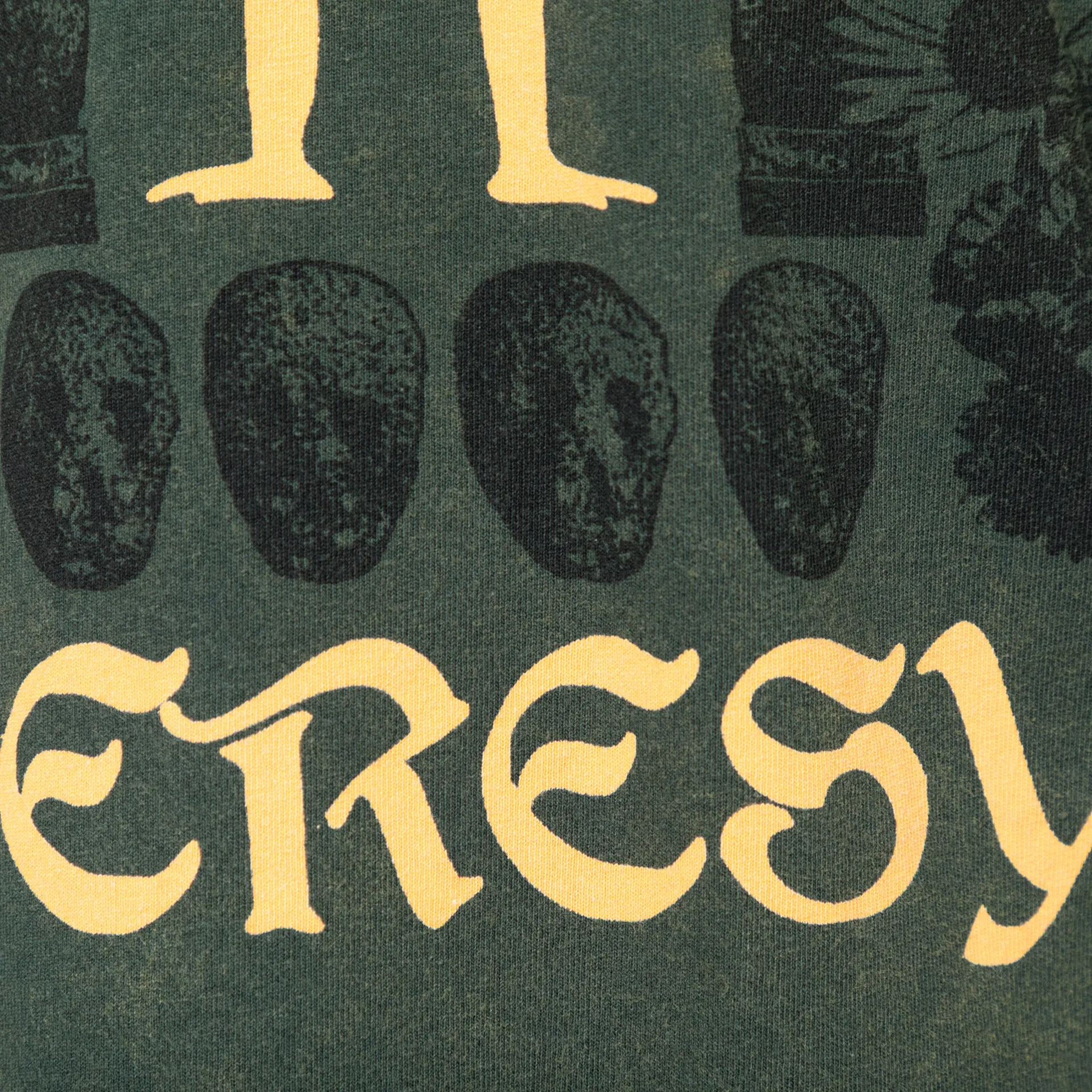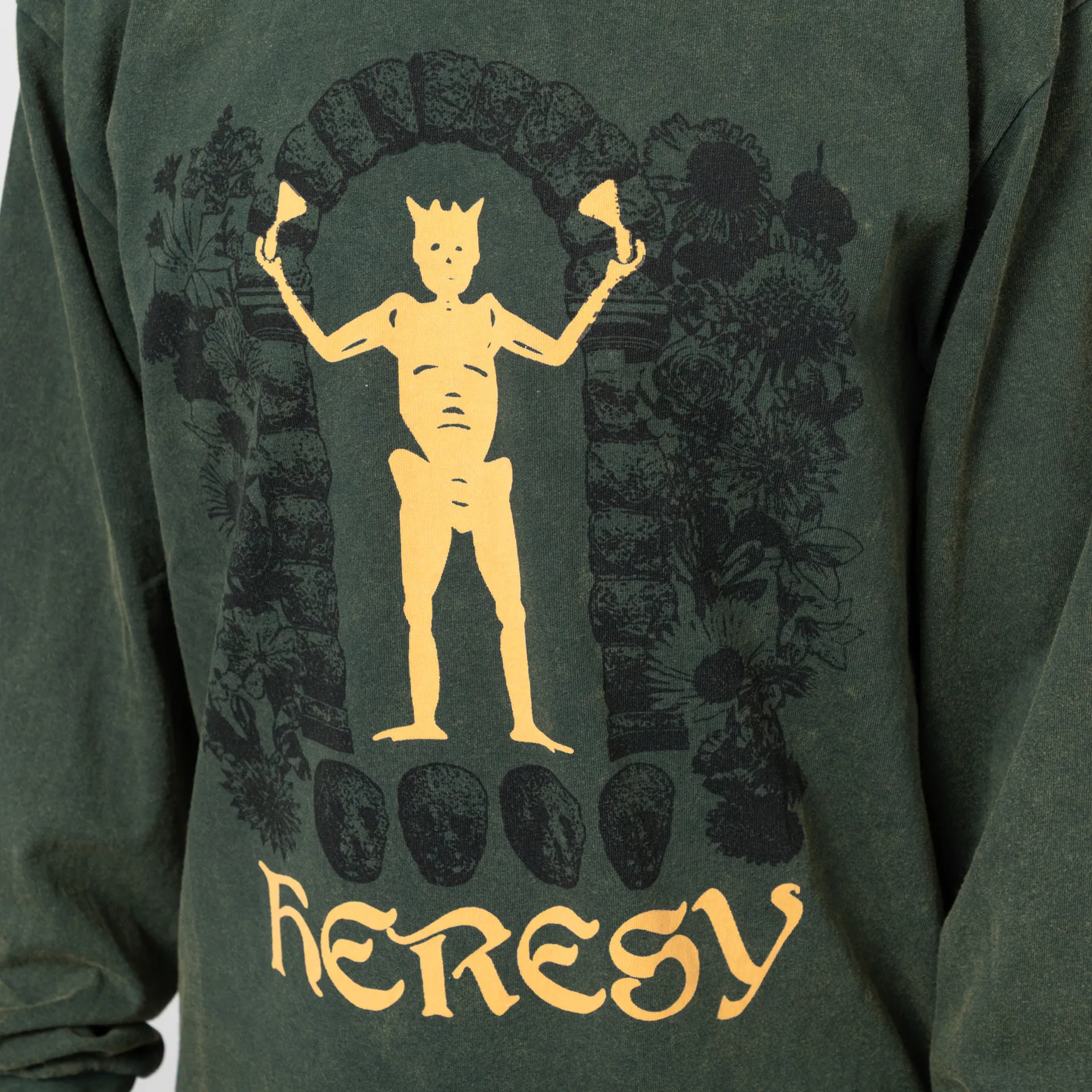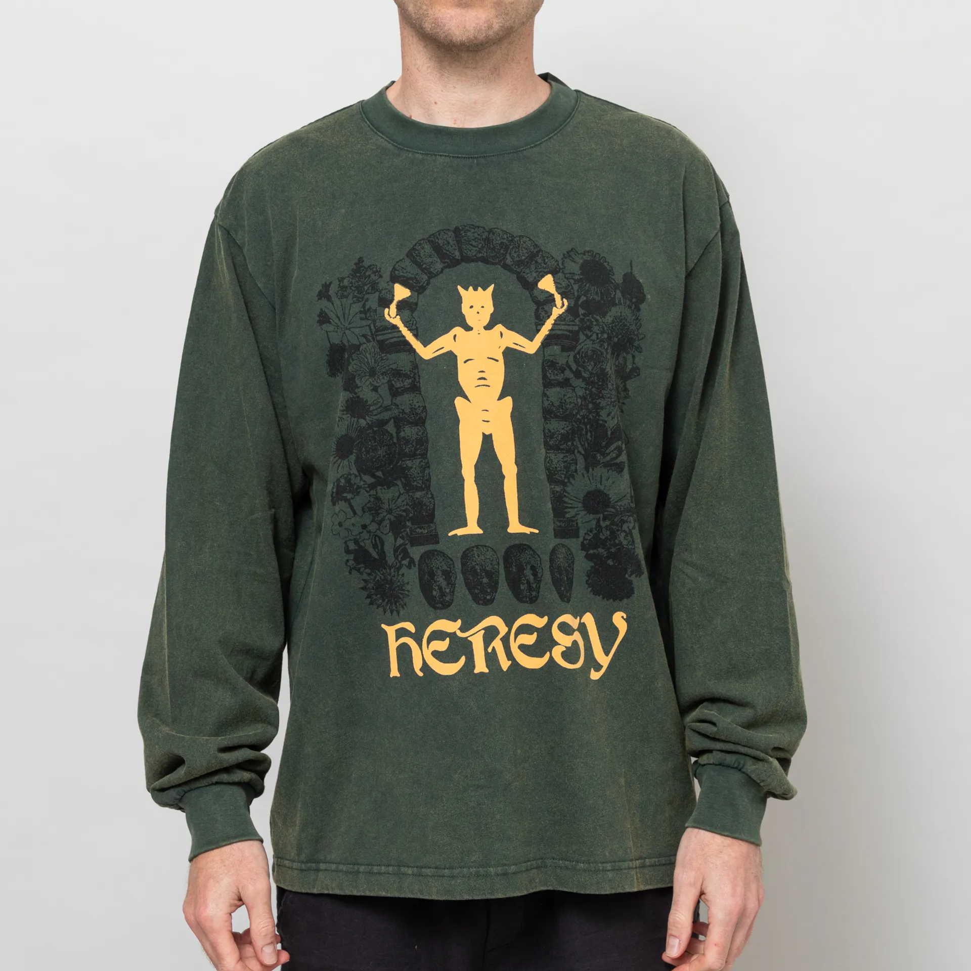 A long sleeve graphic tee from Heresy, cut in a boxy fit for a laidback silhouette and constructed from heavyweight cotton, garment-washed for a worn-in look.