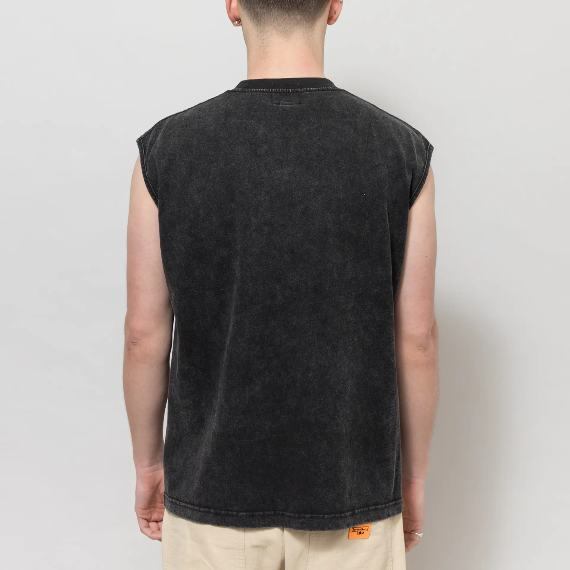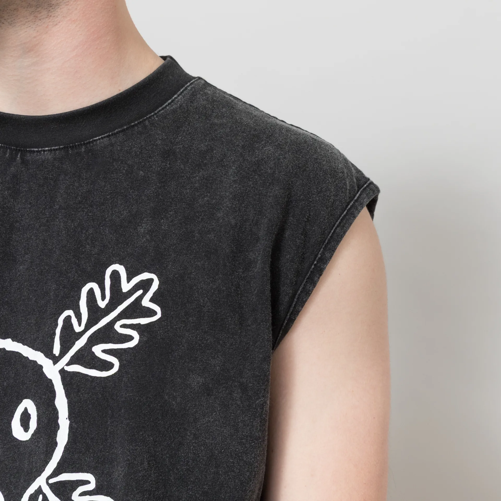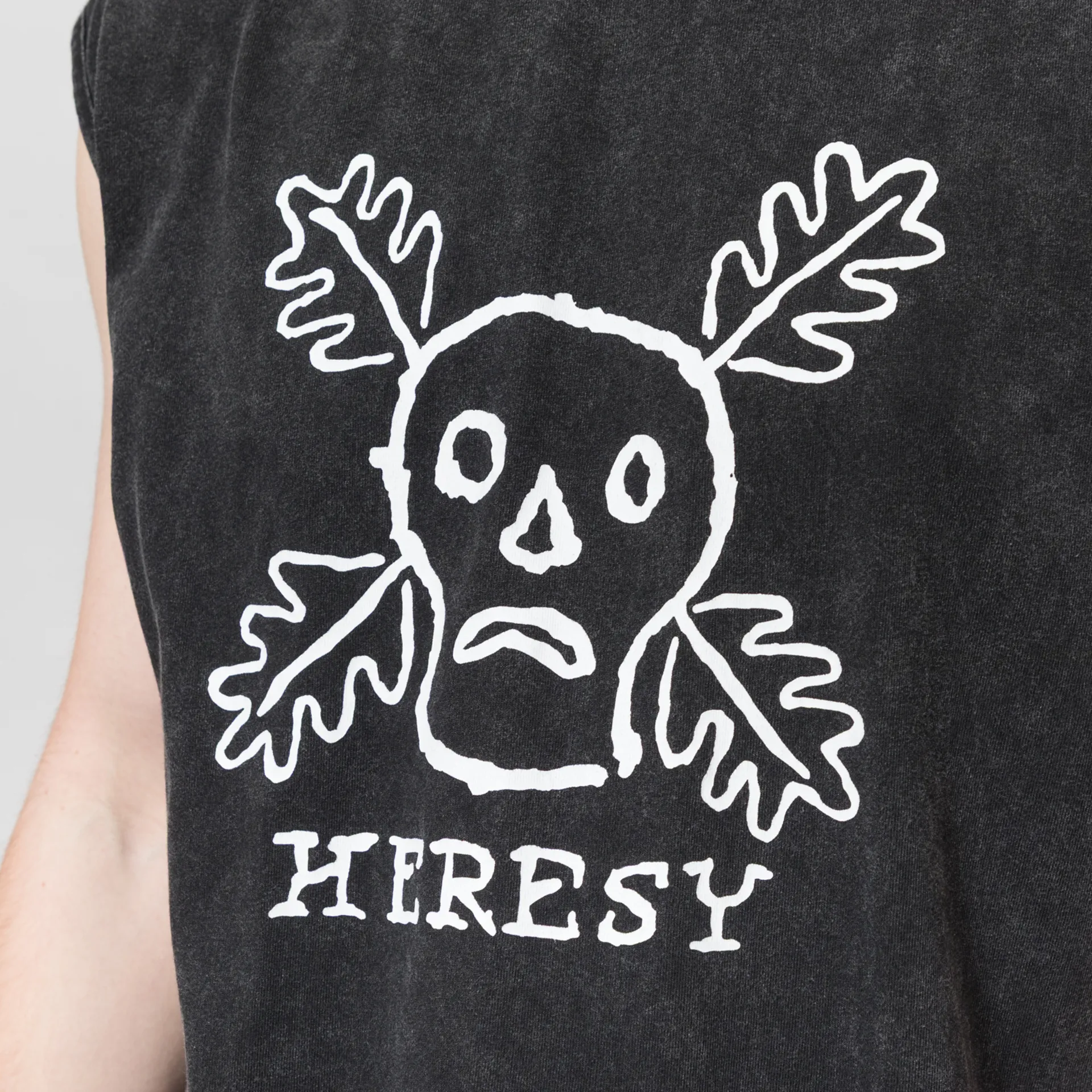A t-shirt vest from Heresy, cut in a boxy fit for a casual look and constructed from 220gsm cotton jersey, pre-washed to prevent shrinkage. Featuring a ribbed crewneck, a straight hem and a cool graphic across the front.