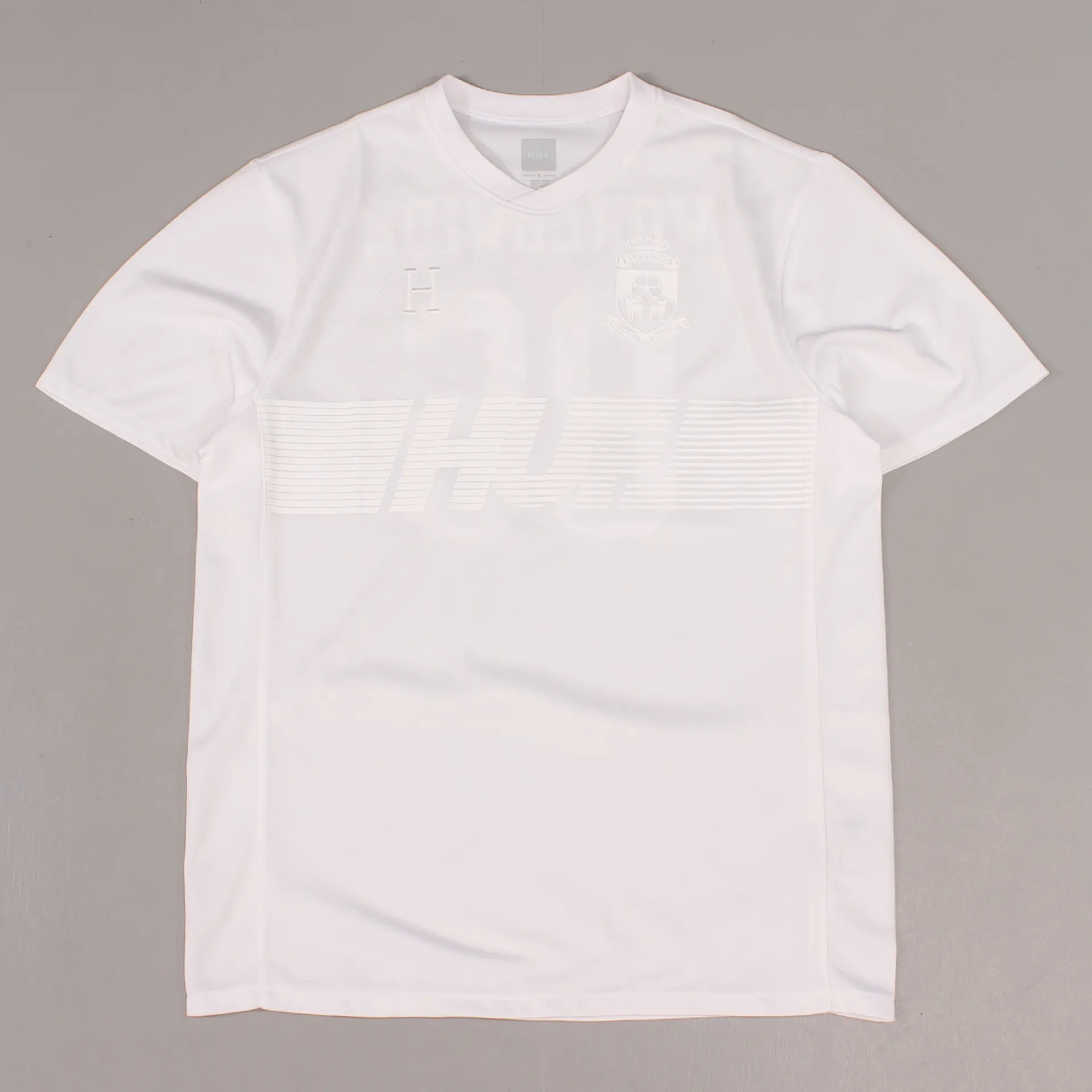 New for this season from Huf Worldwide we have the 10K Soccer Jersey in White. This athletic jersey is made from 100% polyester and is based on a classic soccer jersey design with a v neck. Features of the top include ribbed crossover v neck, large front Huf logo and two small chest emblems and a large rear Huf Worldwide 86 print. This is a perfect shirt for wearing at a footie match, at the bar or even to keep air flowing to your body whilst you are skating which in summer is going to be a must.
