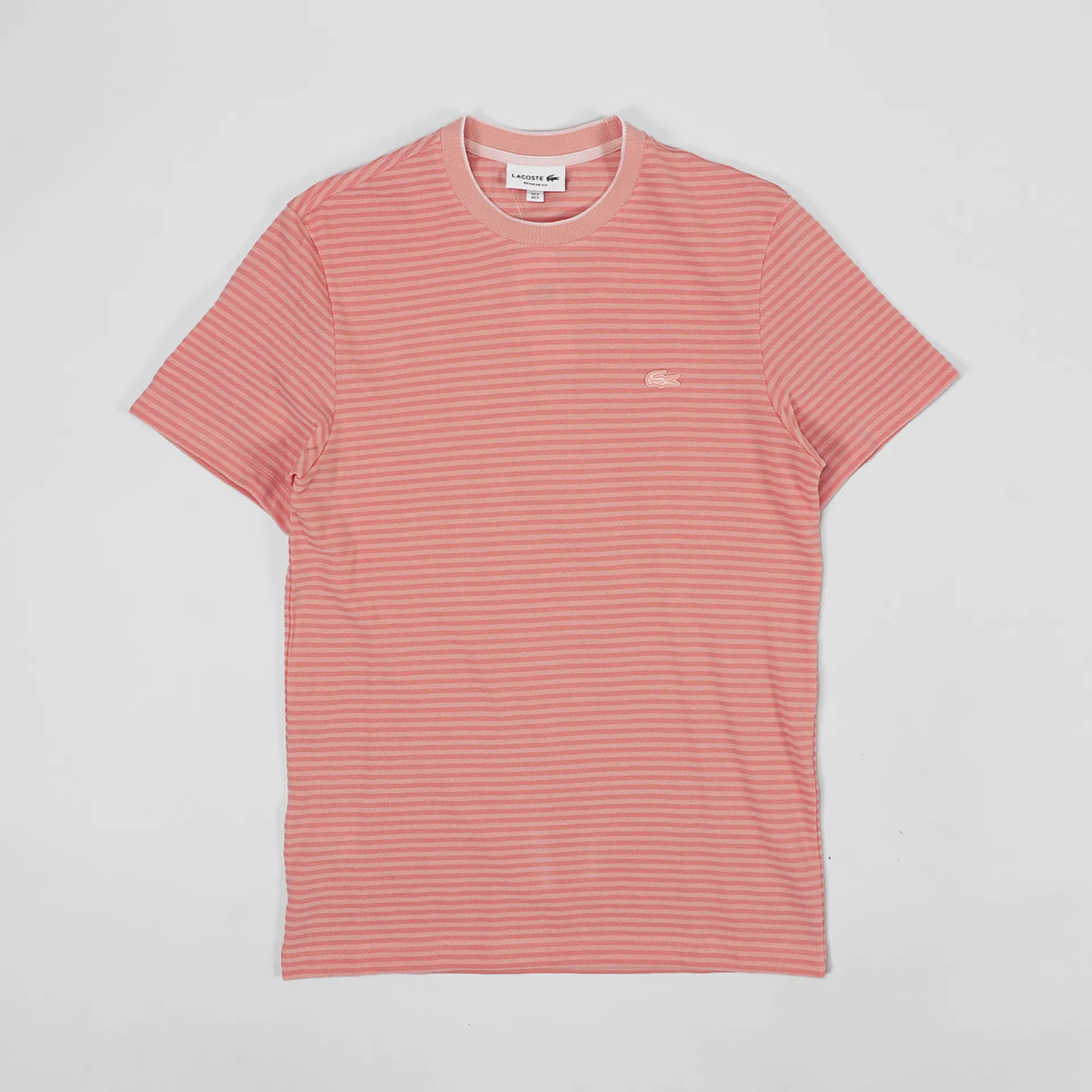 A short sleeve tee from Lacoste made from a super comfortable and sporty pique weave of 100% cotton with a ribbed crew neck and a tonal embroidered crocodile logo to the chest. It has a striped pattern for a casual vibe.
