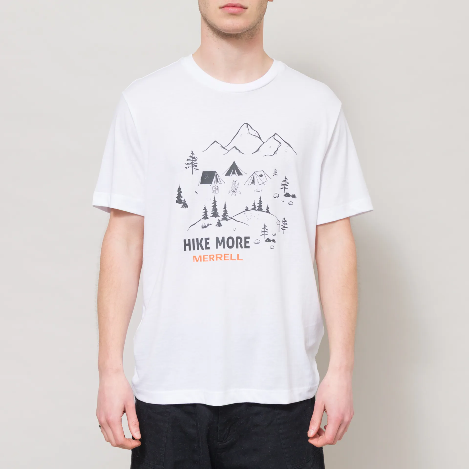 A graphic tee from Merrell, cut in a relaxed fit for a casual look and constructed from a durable stretch-cotton blend. It has a ribbed crewneck, a straight hem and is finished with printed artwork across the front.