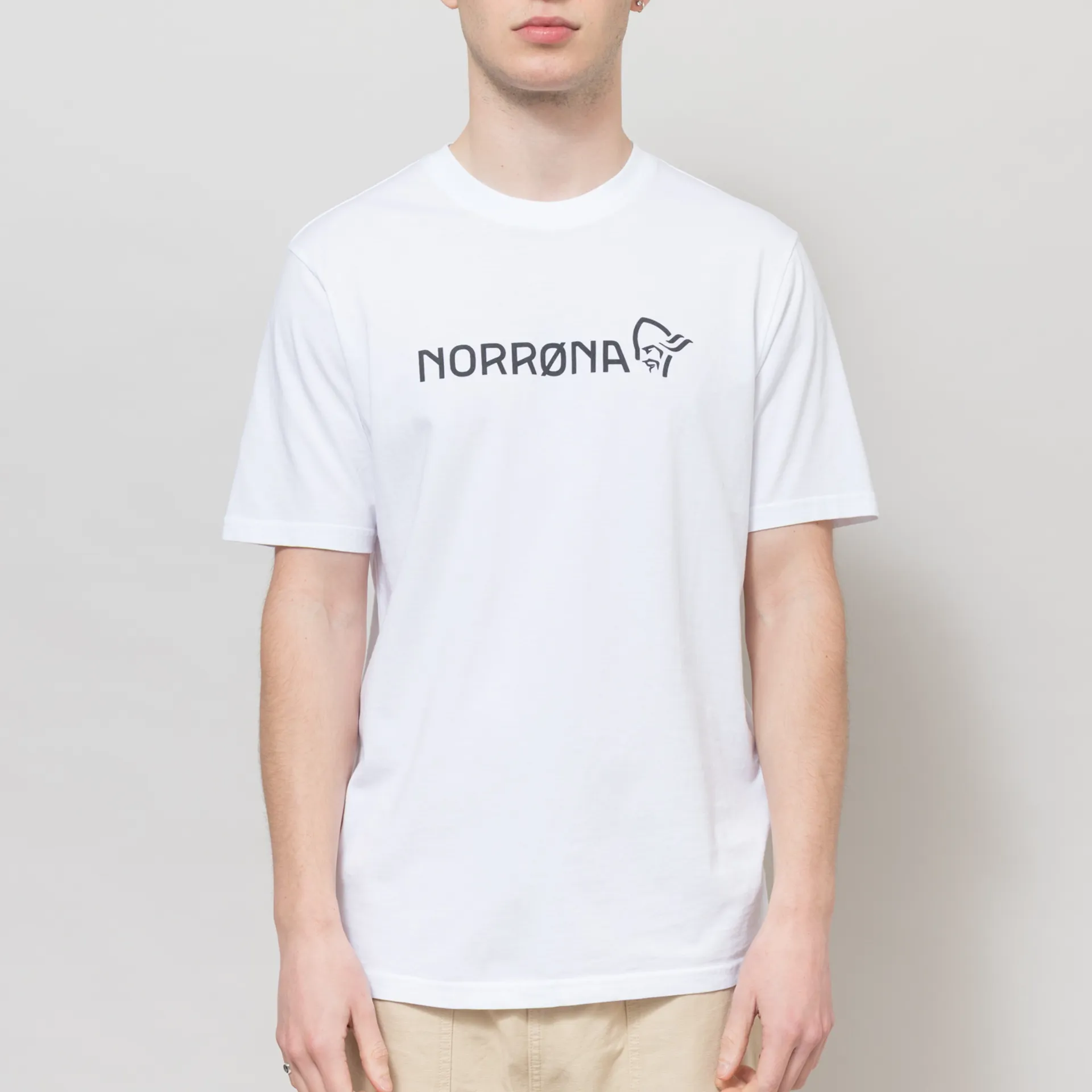 A logo tee from Norrona, crafted from durable organic cotton and cut in a regular fit for everyday wear. It has a ribbed crewneck, a straight hem and is complete with a printed Norrona logo across the centre front.