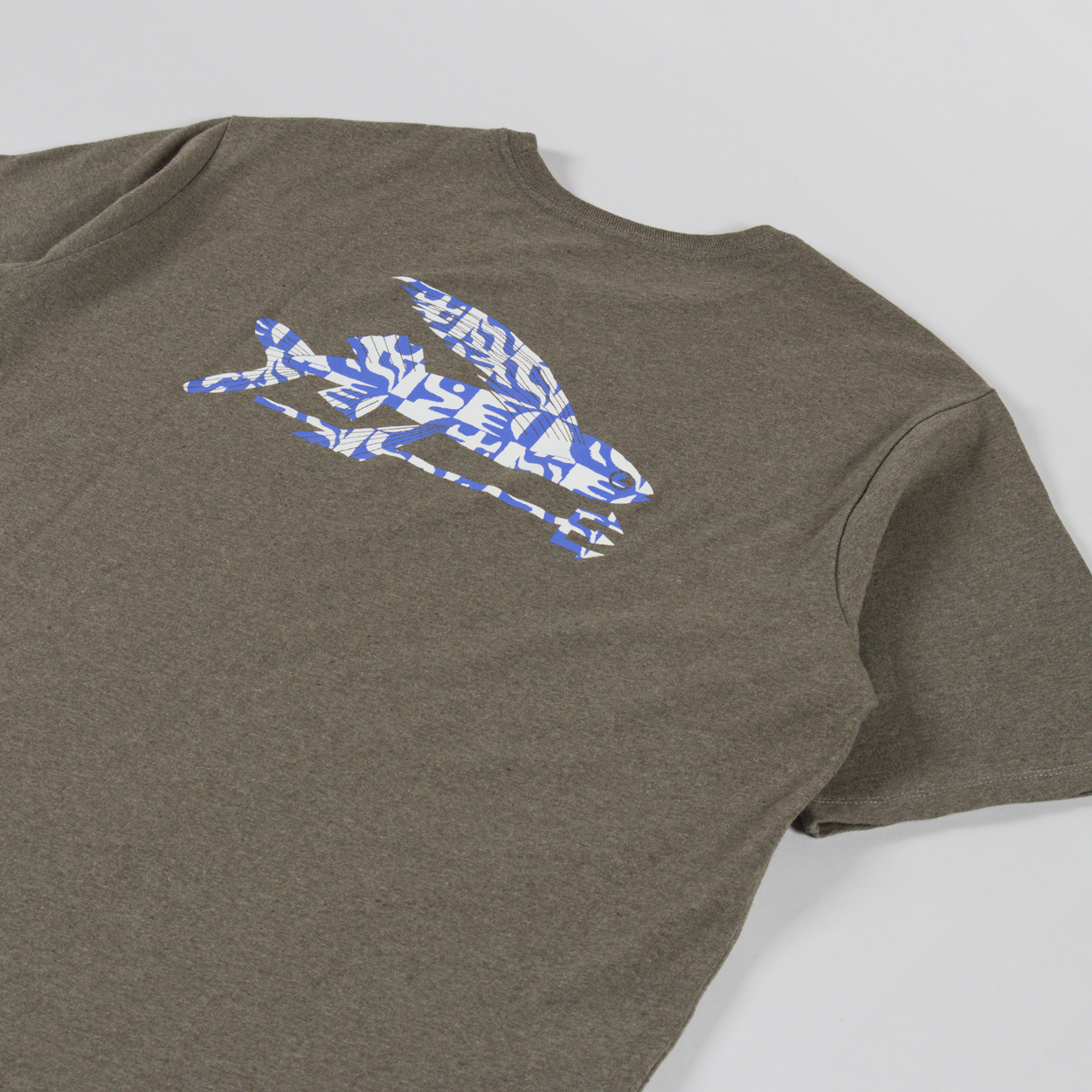 A new version of Patagonia's Responsibili-Tee, this time with original Flying Fish artwork by Geoff McFetridge. It is made from 50% recycled cotton and 50% post-consumer recycled polyester. Together, this blend makes up 4.8 plastic bottles and 0.26 pounds of fabric scrap, as well as saving 63 gallons of water compared to the conventional cotton tee.