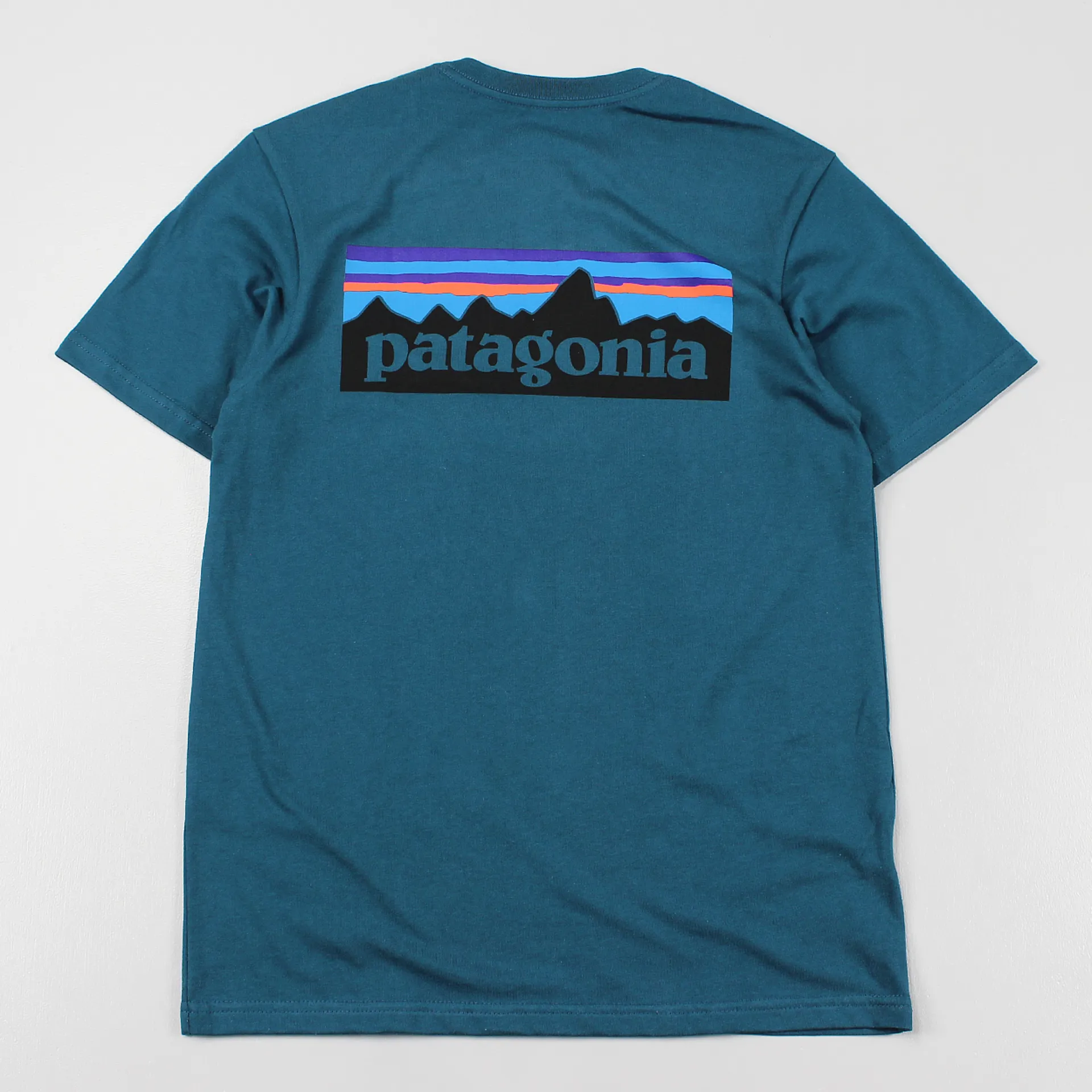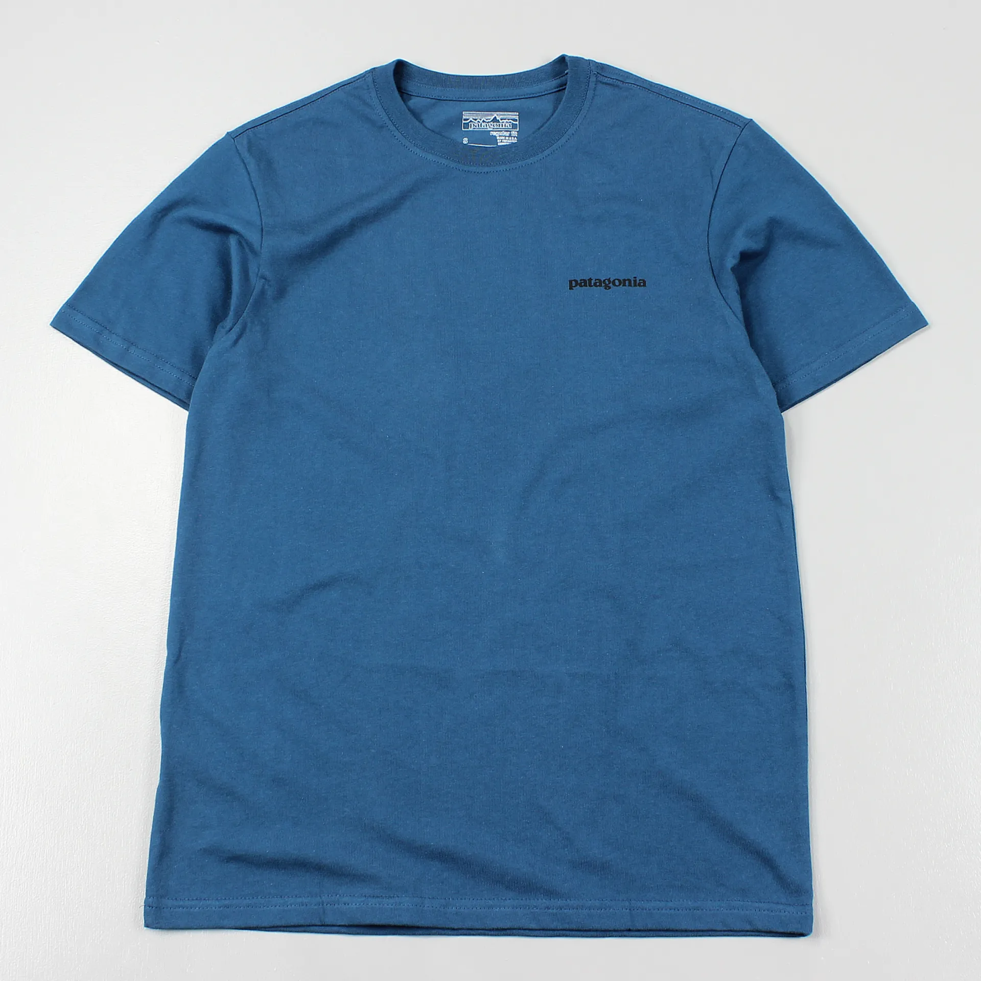 The hugely popular P6 logo tee from Patagonia in Crater Blue, now go explore!
