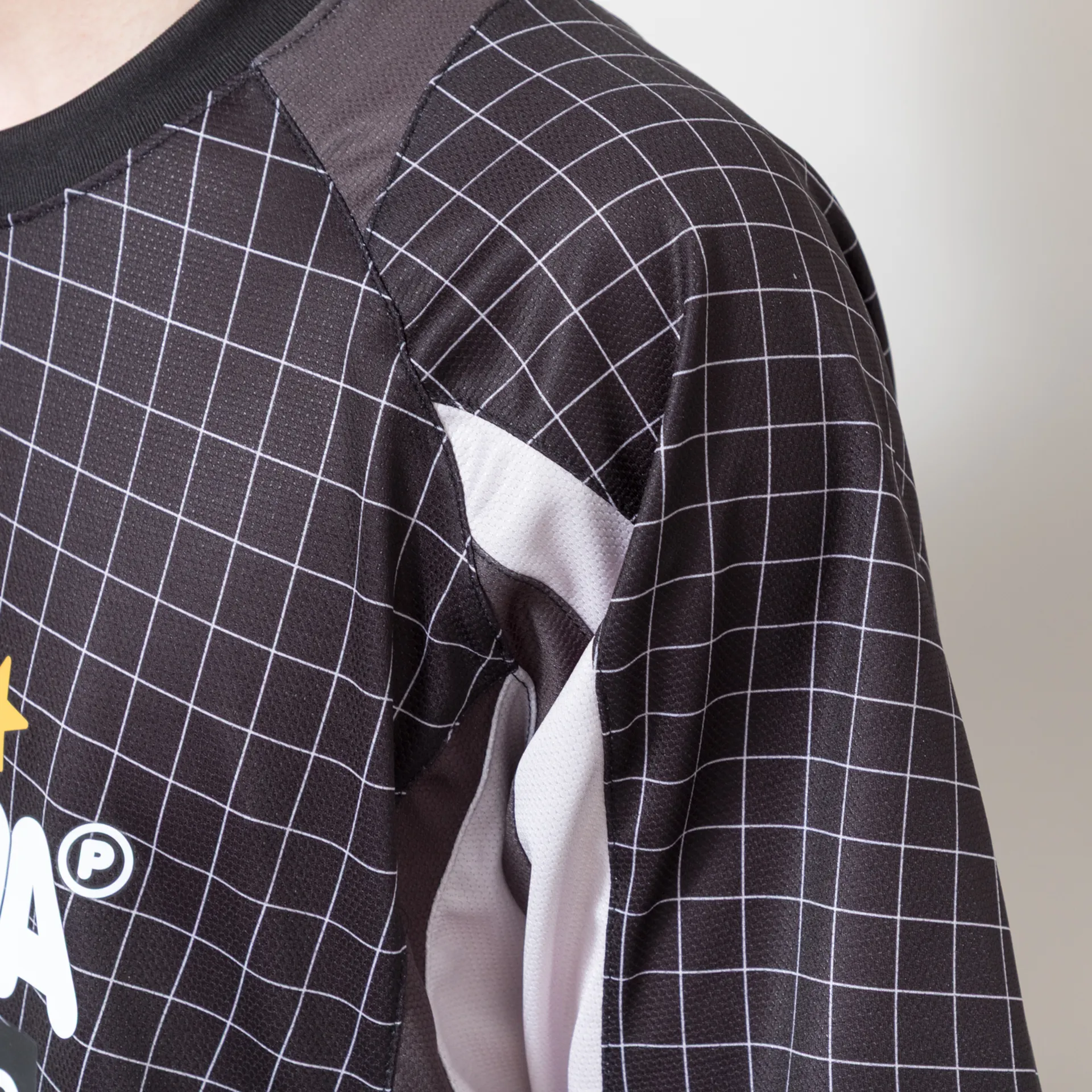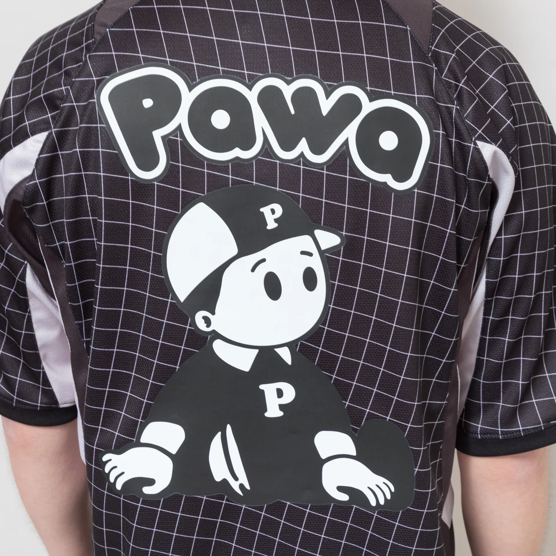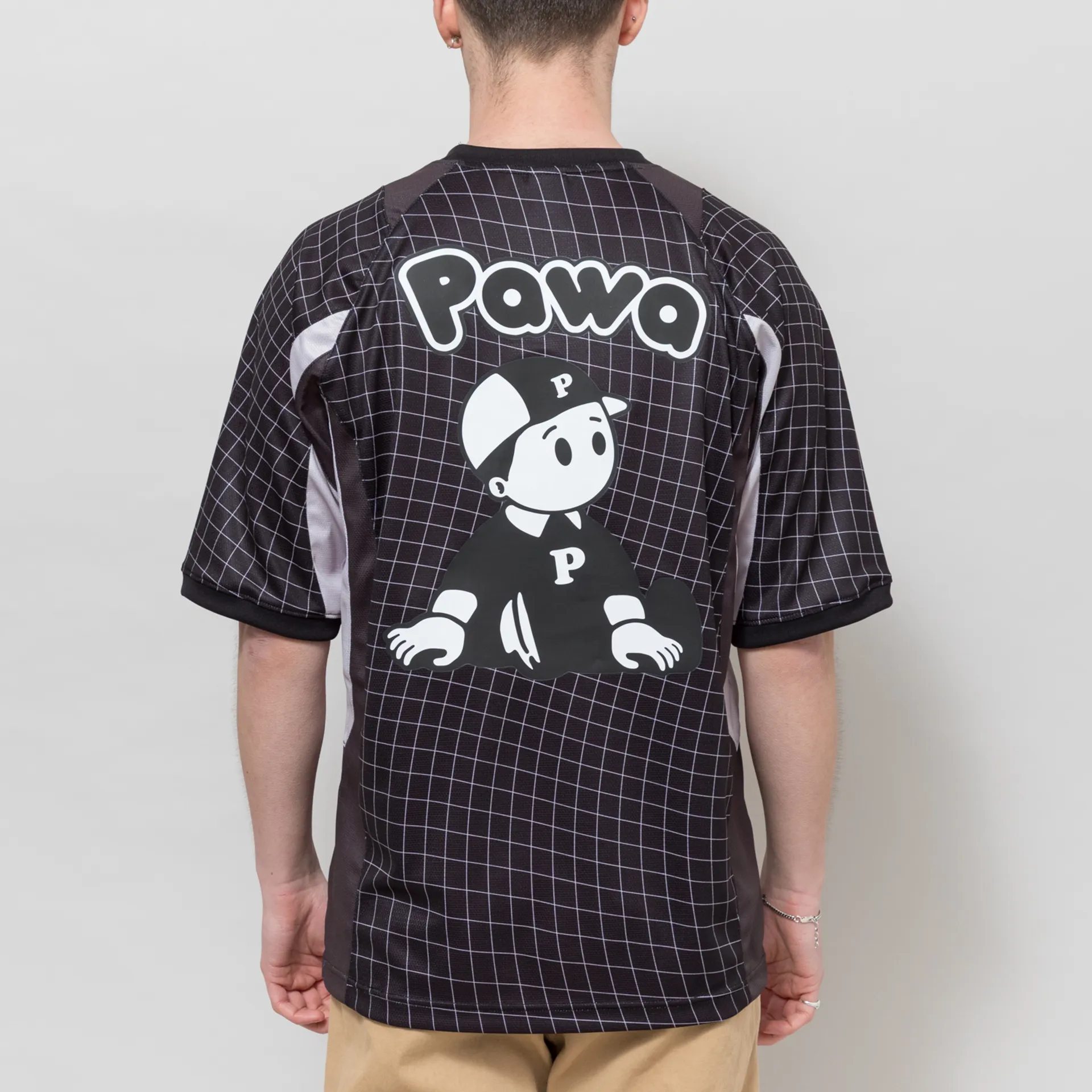 A football shirt from Pawa Speed Sports, constructed from breathable polyester with an all-over checkered design. It's cut in a relaxed fit for a casual silhouette and features a ribbed crewneck, ribbed cuffs and a straight hem. The design is complete with printed patches throughout the front, with a large graphic at the back.