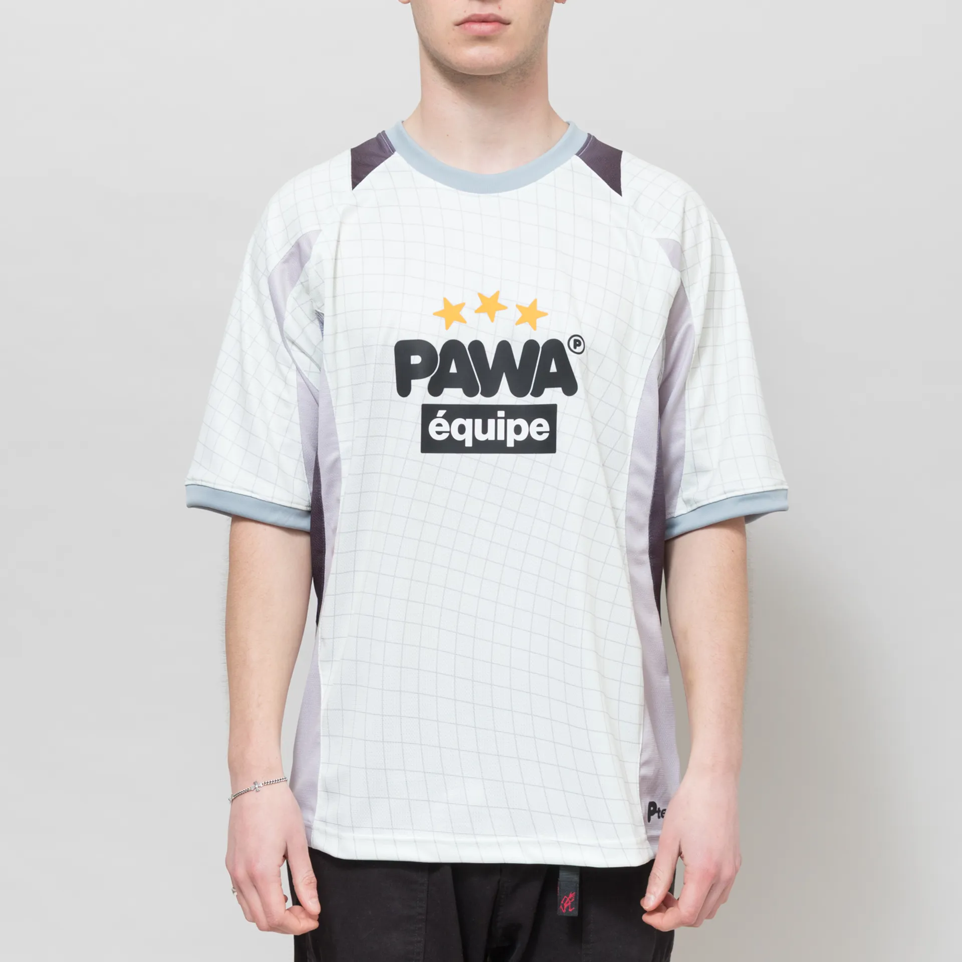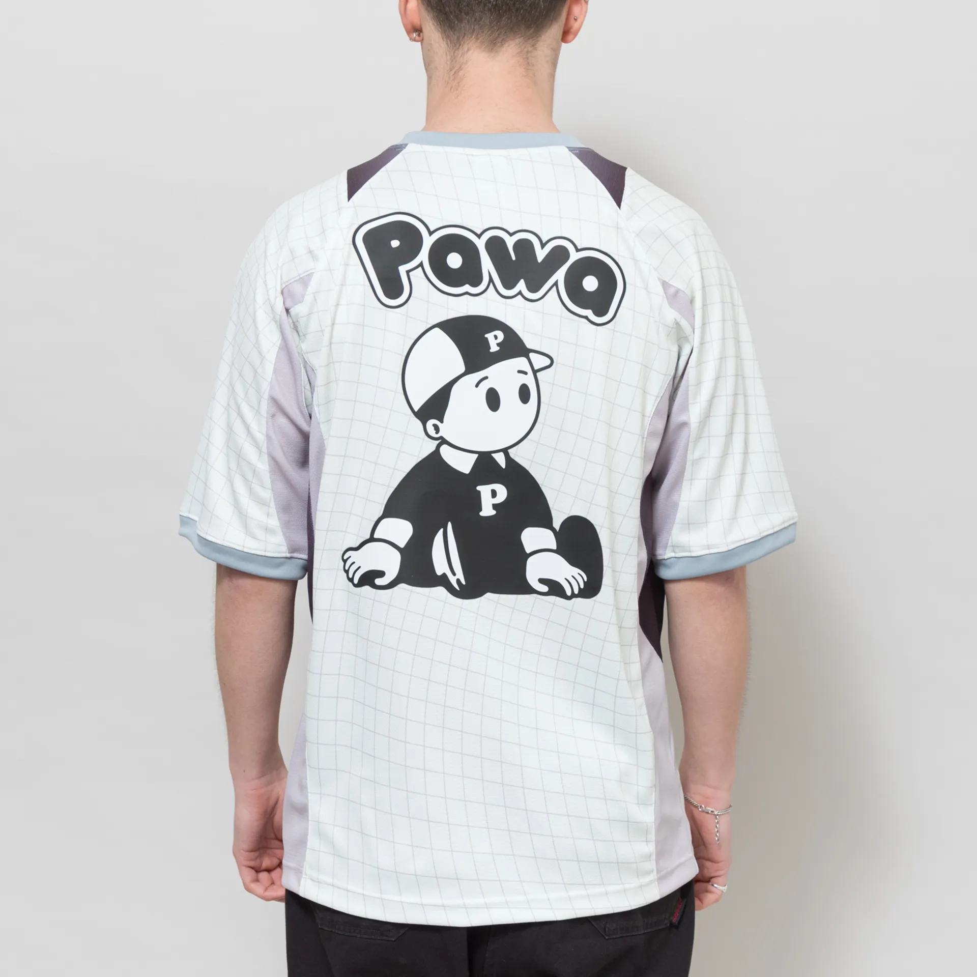 A football shirt from Pawa Speed Sports, constructed from breathable polyester with an all-over checkered design. It's cut in a relaxed fit for a casual silhouette and features a ribbed crewneck, ribbed cuffs and a straight hem. The design is complete with printed patches throughout the front, with a large graphic at the back.