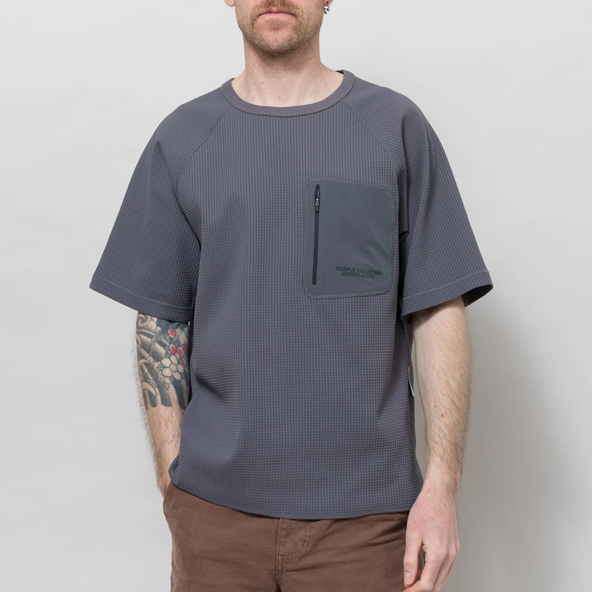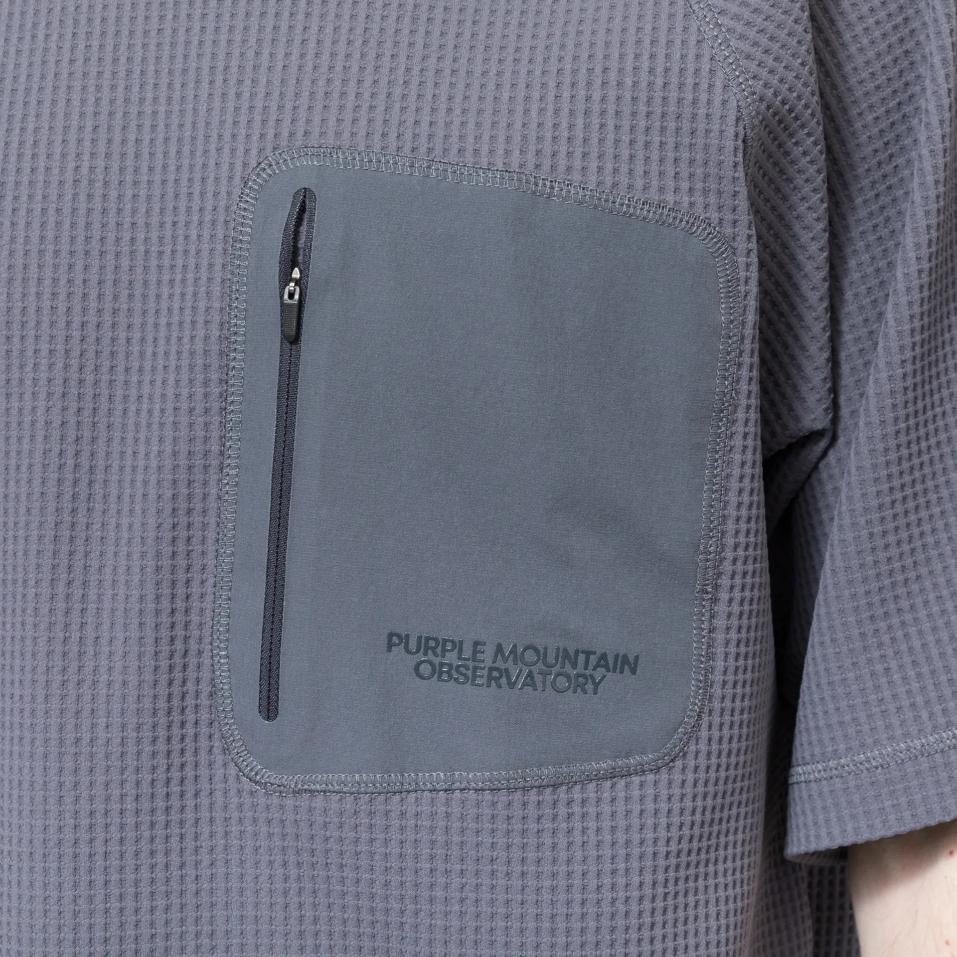 A short-sleeve tee from PMO, constructed from sweat-wicking and quick-drying waffle fabric. Cut in a boxy fit for a casual silhouette, it features a ribbed crewneck, raglan sleeves for freedom of movement and a heat-sealed front pocket with power mesh lining. Finished off with a tonal Purple Mountain Observatory logo at the chest and a flag label to the side seam.