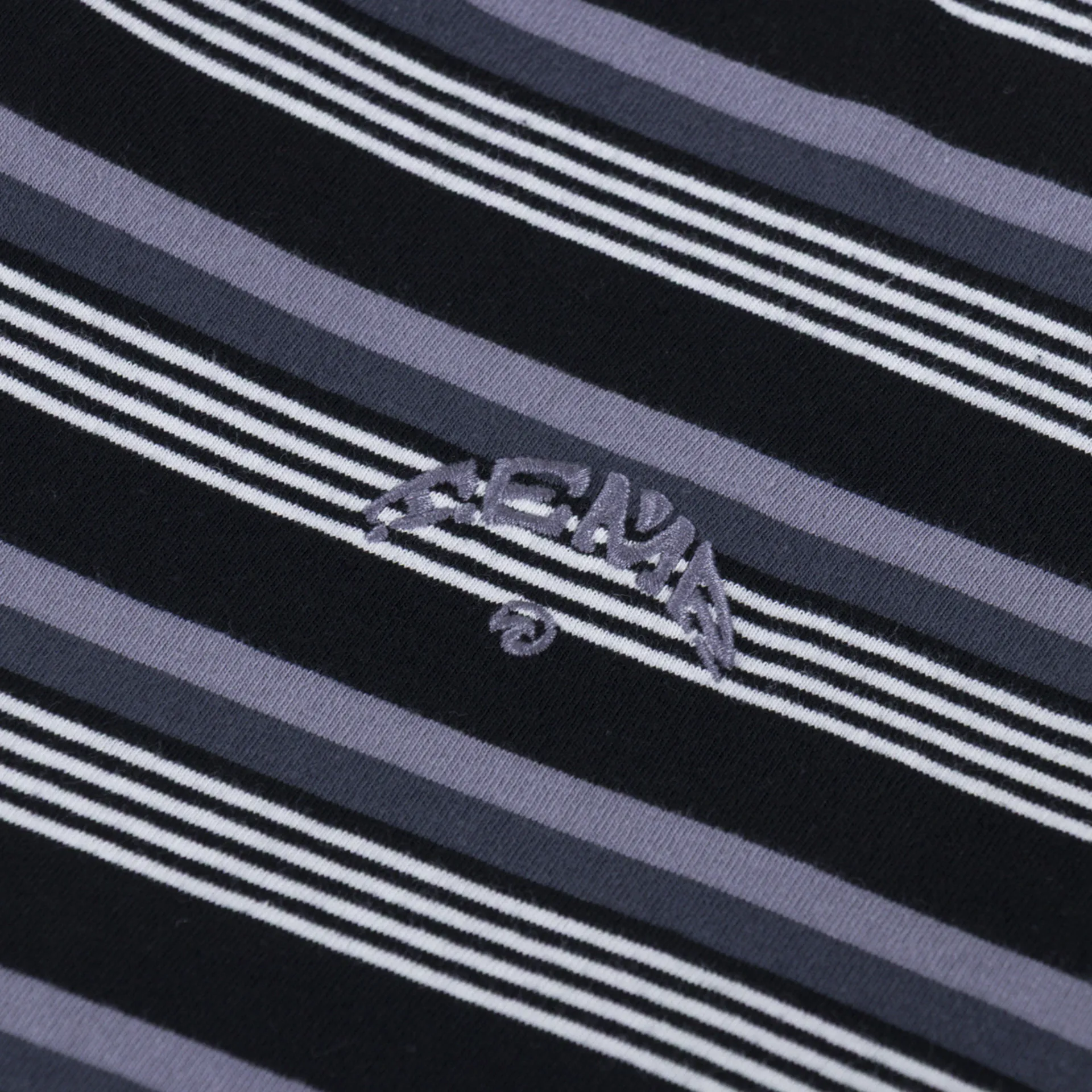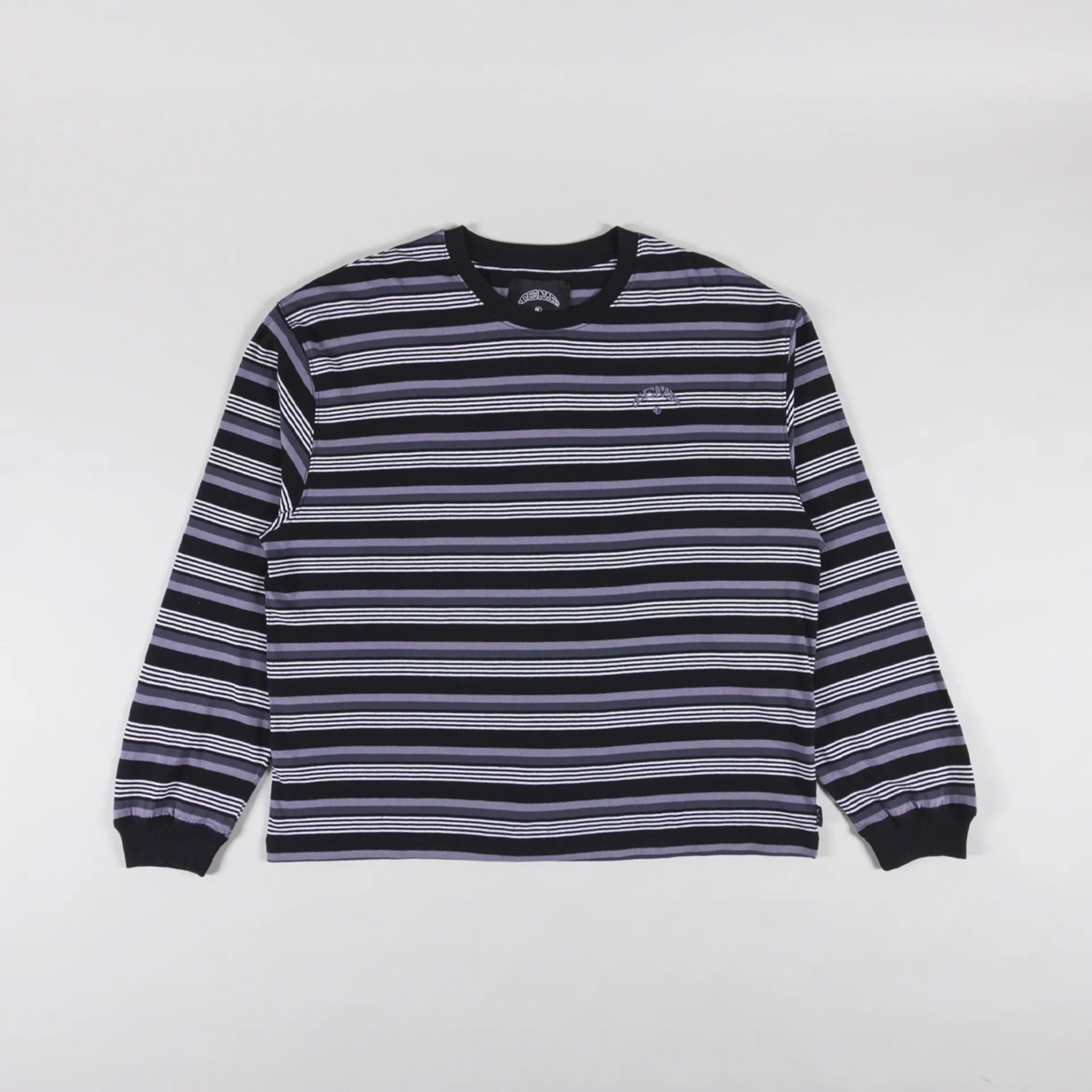 A long sleeve from Temp Surf Co, constructed from soft cotton with an all-over yarn-dyed striped design, cut in a relaxed, boxy fit. It features a ribbed crewneck and cuffs, with a straight hem and a flag label at the side seam. The design is complete with a tonal embroidered Temp logo at the chest.