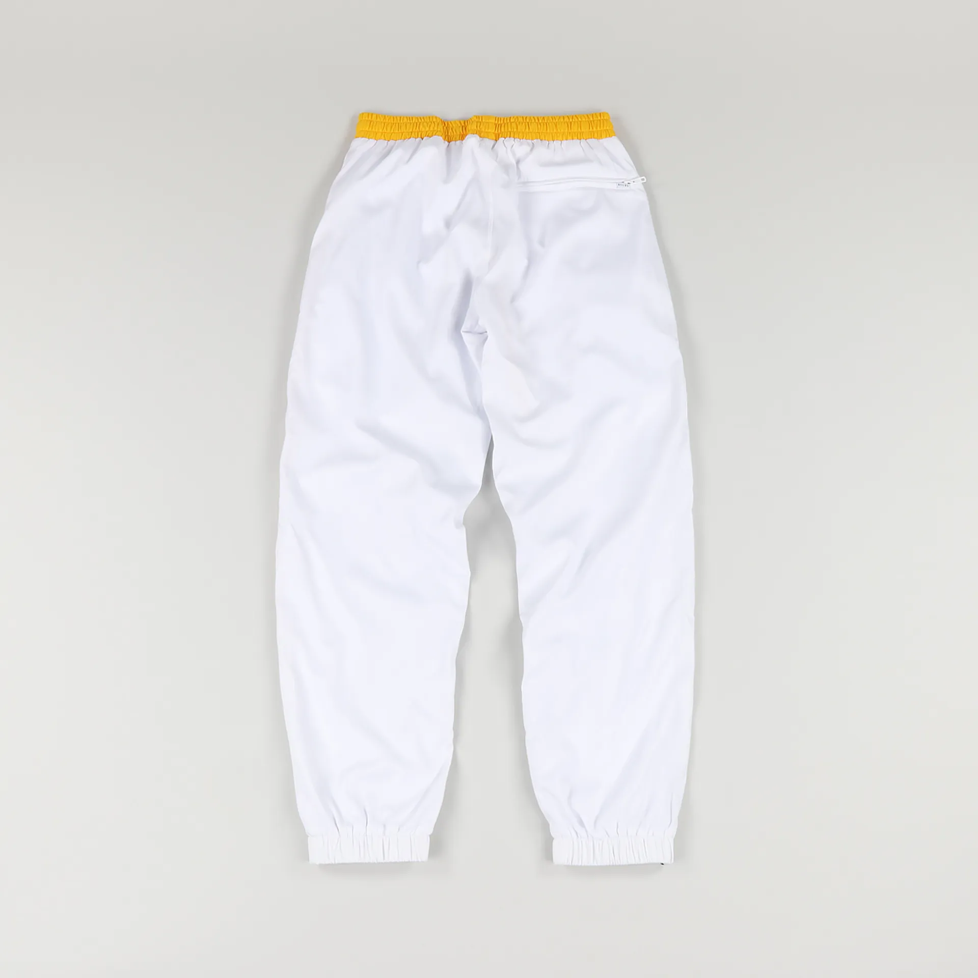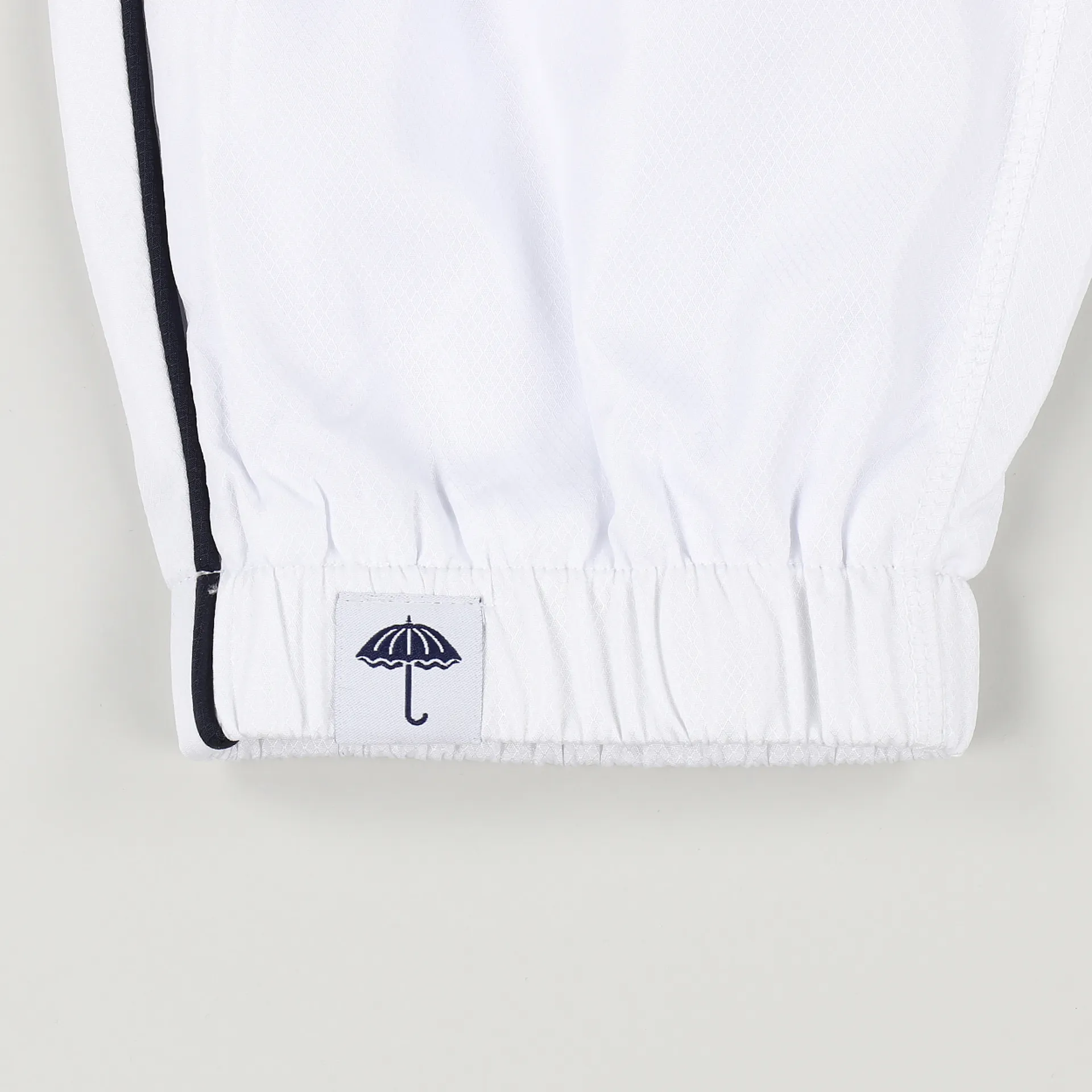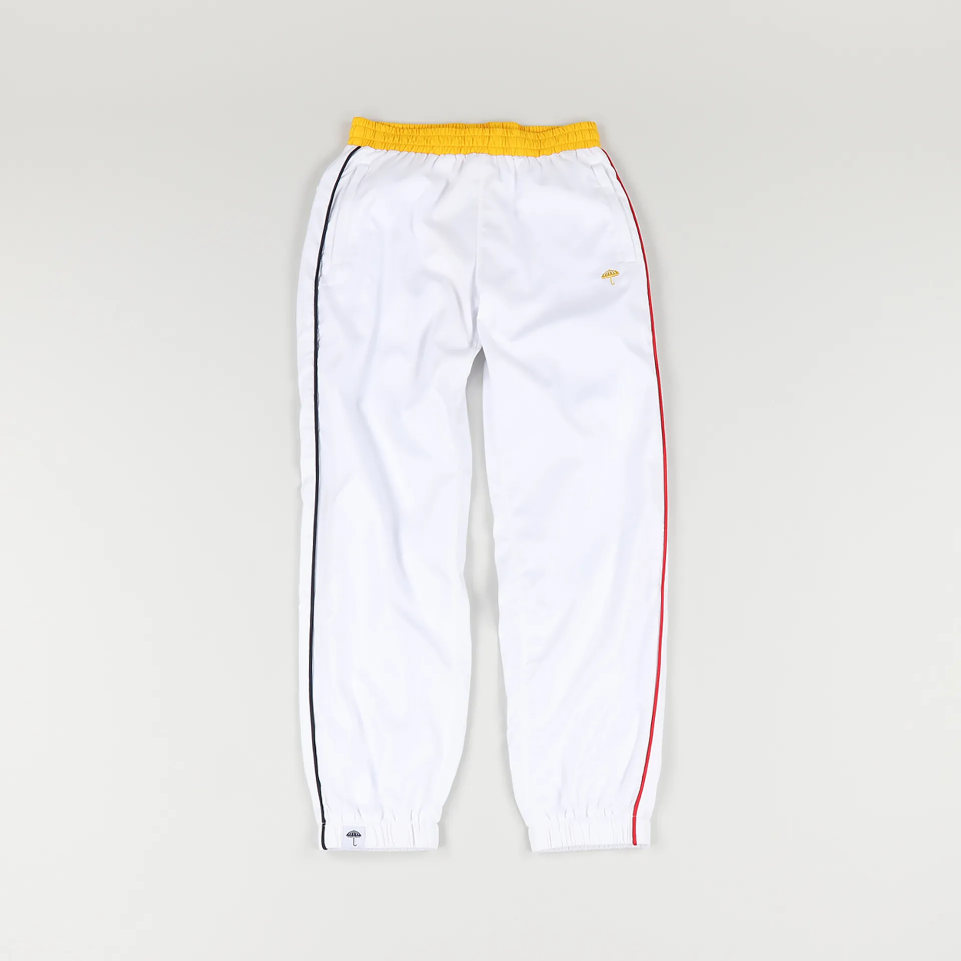 A pair of tracksuit pants from French skate company Helas, made from 100% strong honeycomb nylon featuring colourful leg piping, an elasticated waits and cuffs, and an embroidered Umbrella logo.