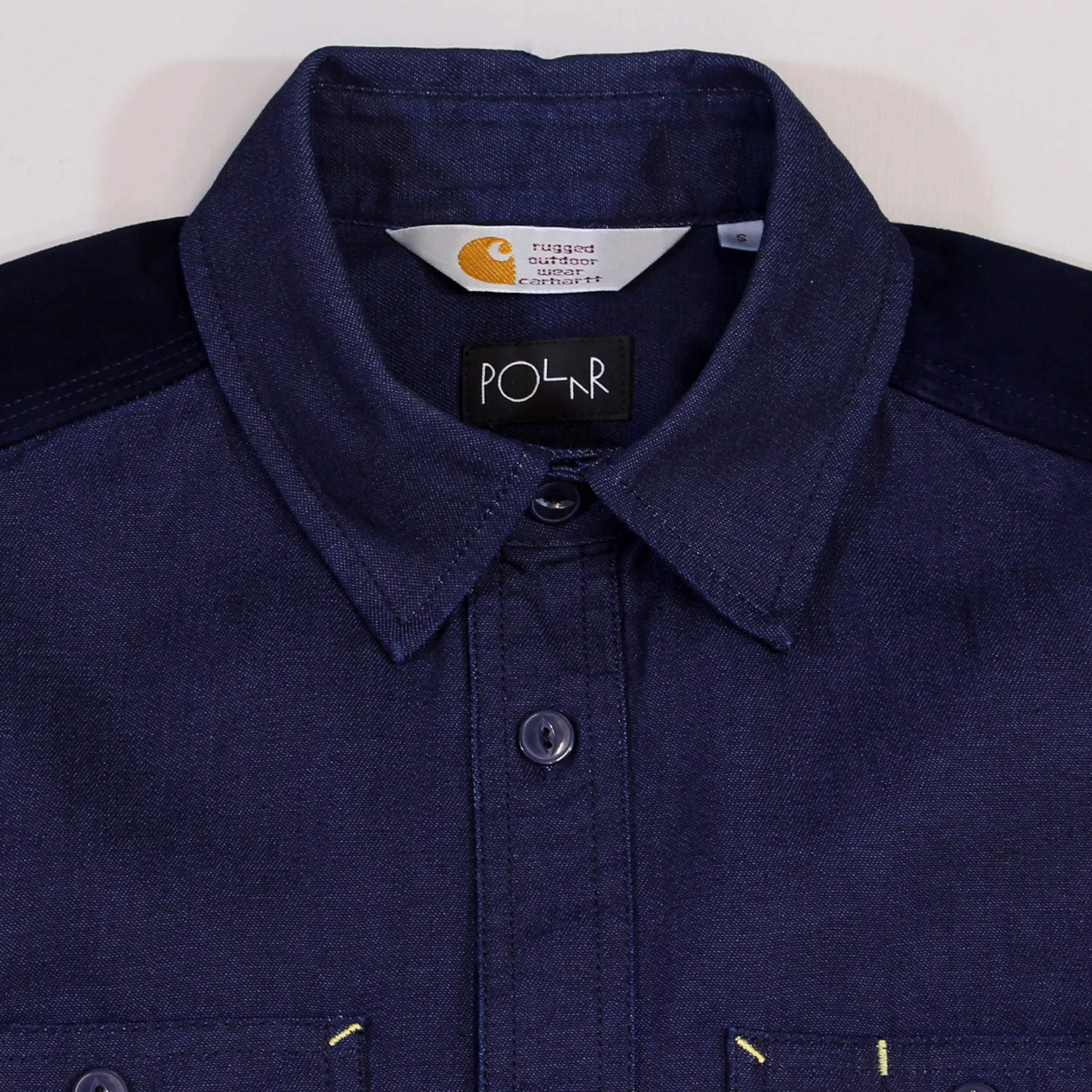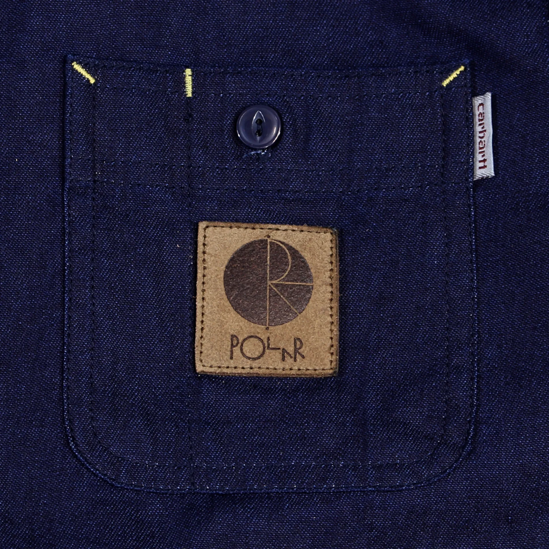 New in for this season as part of the colab between Carhartt WIP and Polar Skate Co. here is the excellent Longsleeve shirt in navy blue, made with skateboarding in mind. The shirt is constructed from 100% cotton denim that is of a midweight and features suede elbow pad and yoke for protection out on the board. Other features of the shirt include button up cuffs, two chest pockets one of which features branding in the way of a suede leather Polar patch and a Carhartt flag tag to the side and a button fastening system. A wicked shirt that is great for hitting the streets on your board in or chilling in the bars.
