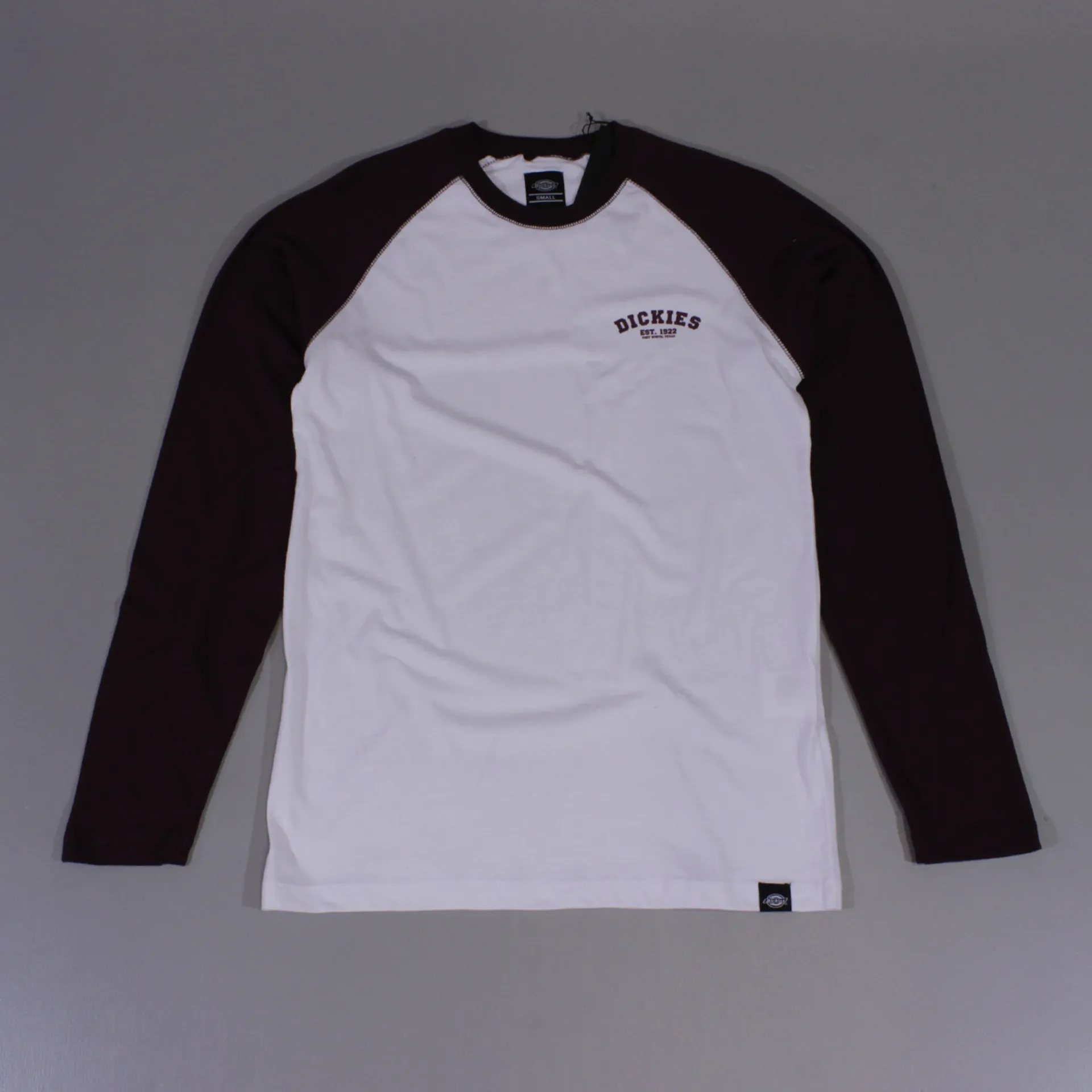 Classic baseball jersey style cut, contrasting maroon raglan sleeves and a bright white body, all made from 100% cotton, midweight.  Light dash of branding with a tidy little Est 1922 logo at the chest and a woven Dickies badge at the hem.