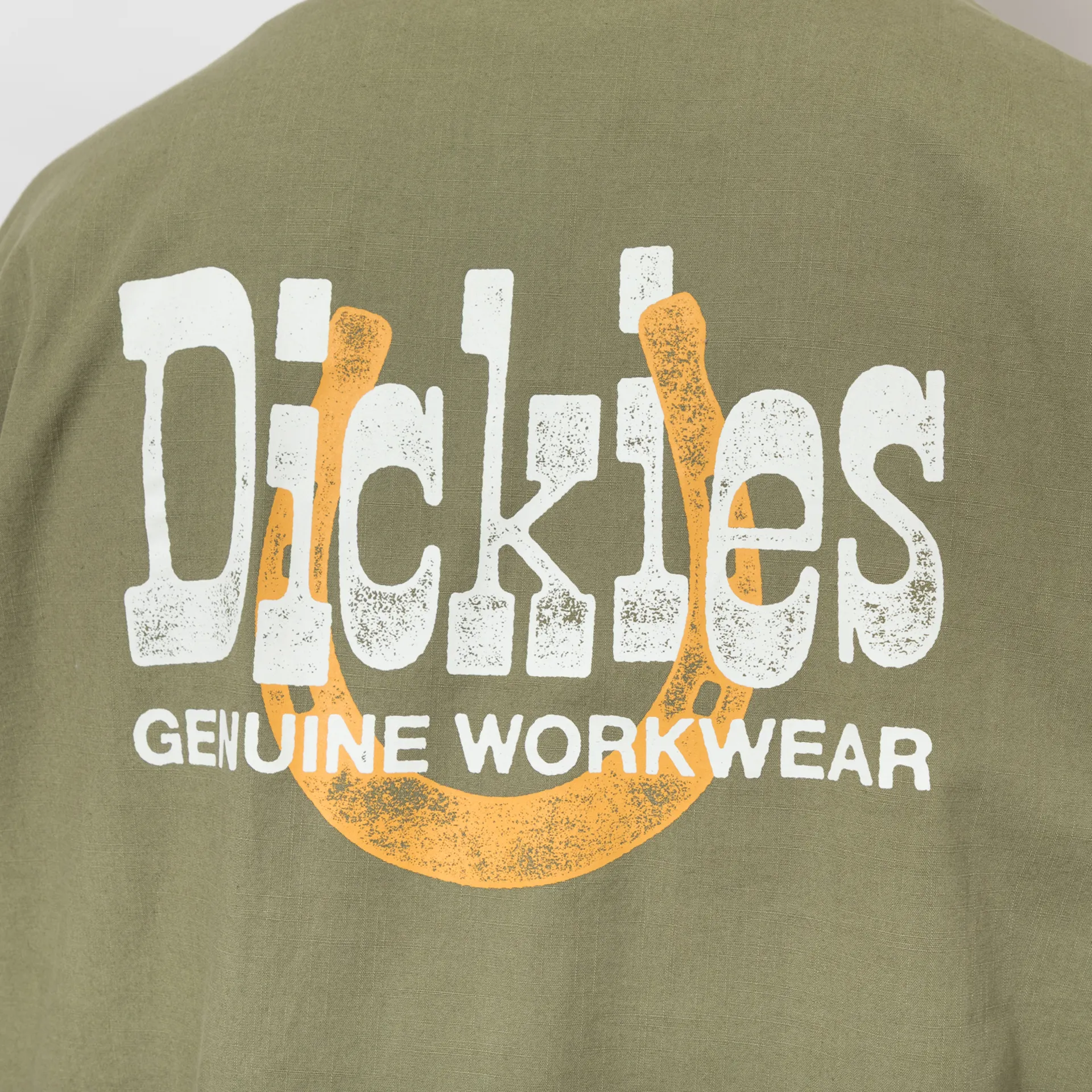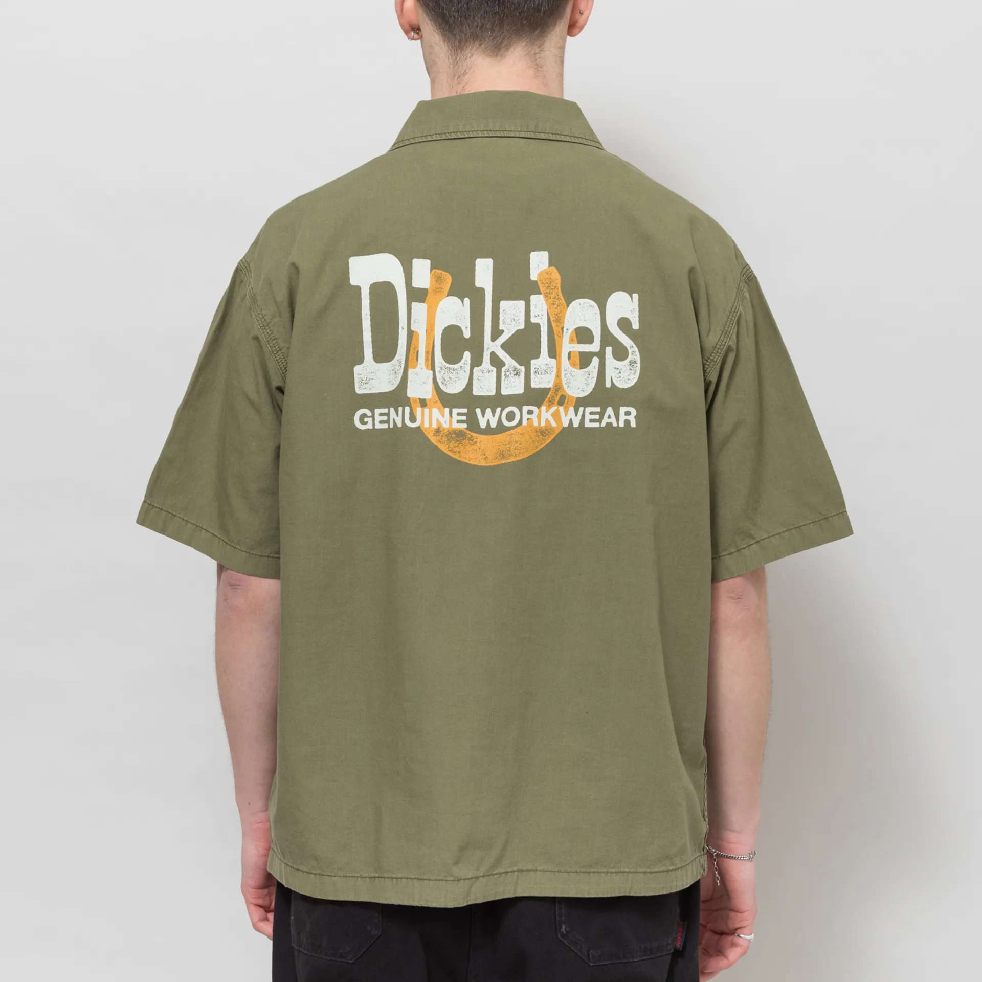 A short-sleeve work shirt from Dickies, constructed from durable cotton fabric and cut in a relaxed fit for a casual silhouette. It features a button-through front, leading to a classic collar, with a straight hem, a single patch pocket at the chest, a large graphic print to the rear and a tonal woven logo patch to the front.