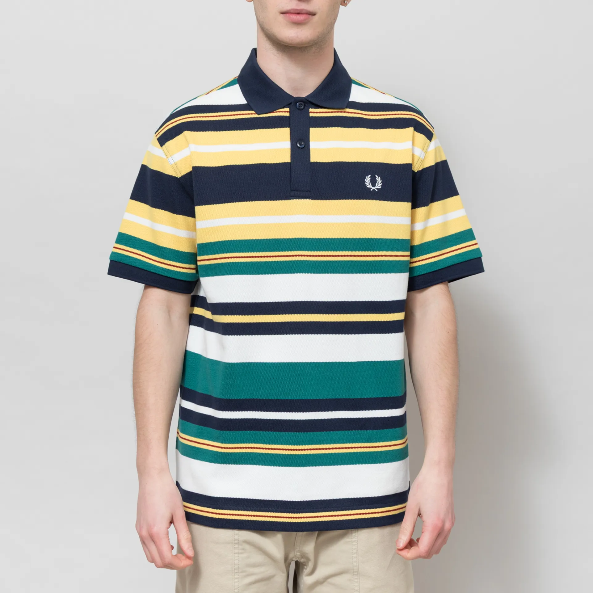 A striped polo shirt from Fred Perry, cut in a relaxed fit for a casual silhouette and crafted from heavyweight cotton pique fabric. Featuring a two-button placket, leading to a classic polo collar, with a straight hem and an embroidered Laurel Wreath logo at the chest.