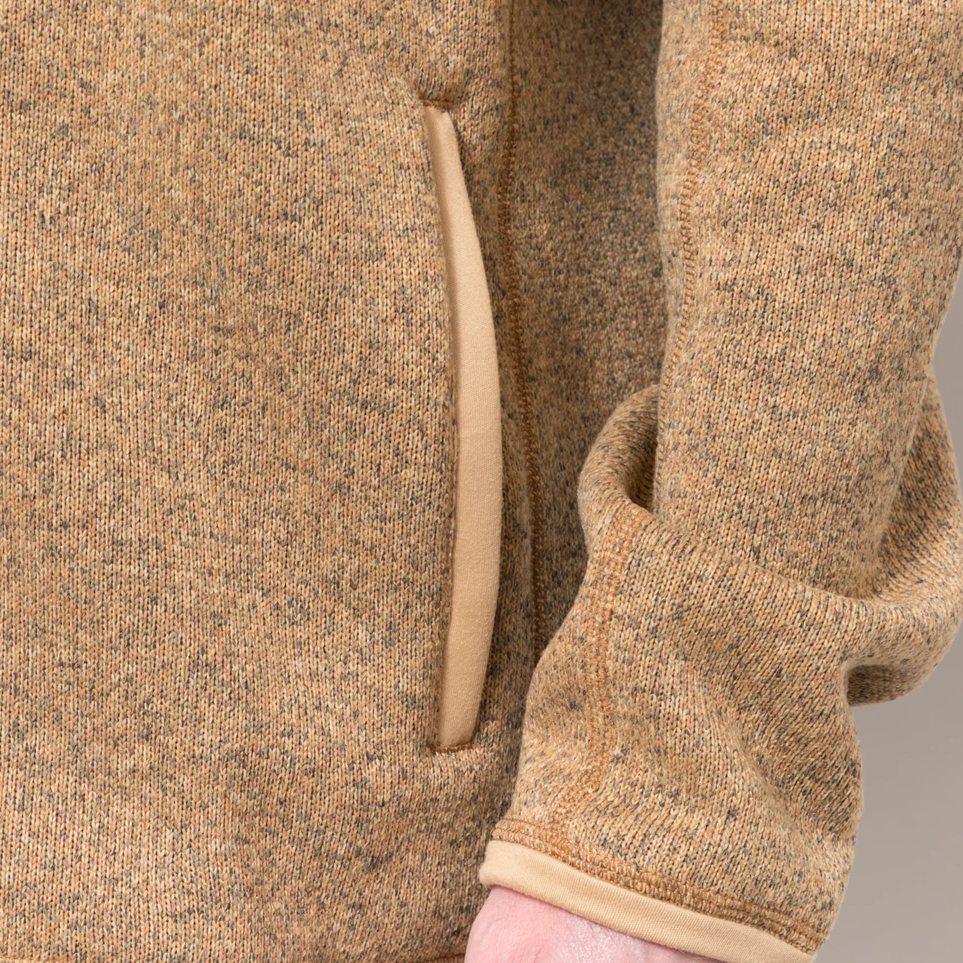 A lightweight fleece from Patagonia made from 100% recycled polyester with a knitted yarn outer and a soft brushed lining. It has a full-zip front, an elasticated hem and cuffs, raglan sleeves, zippered chest and handwarmer pockets and a logo patch