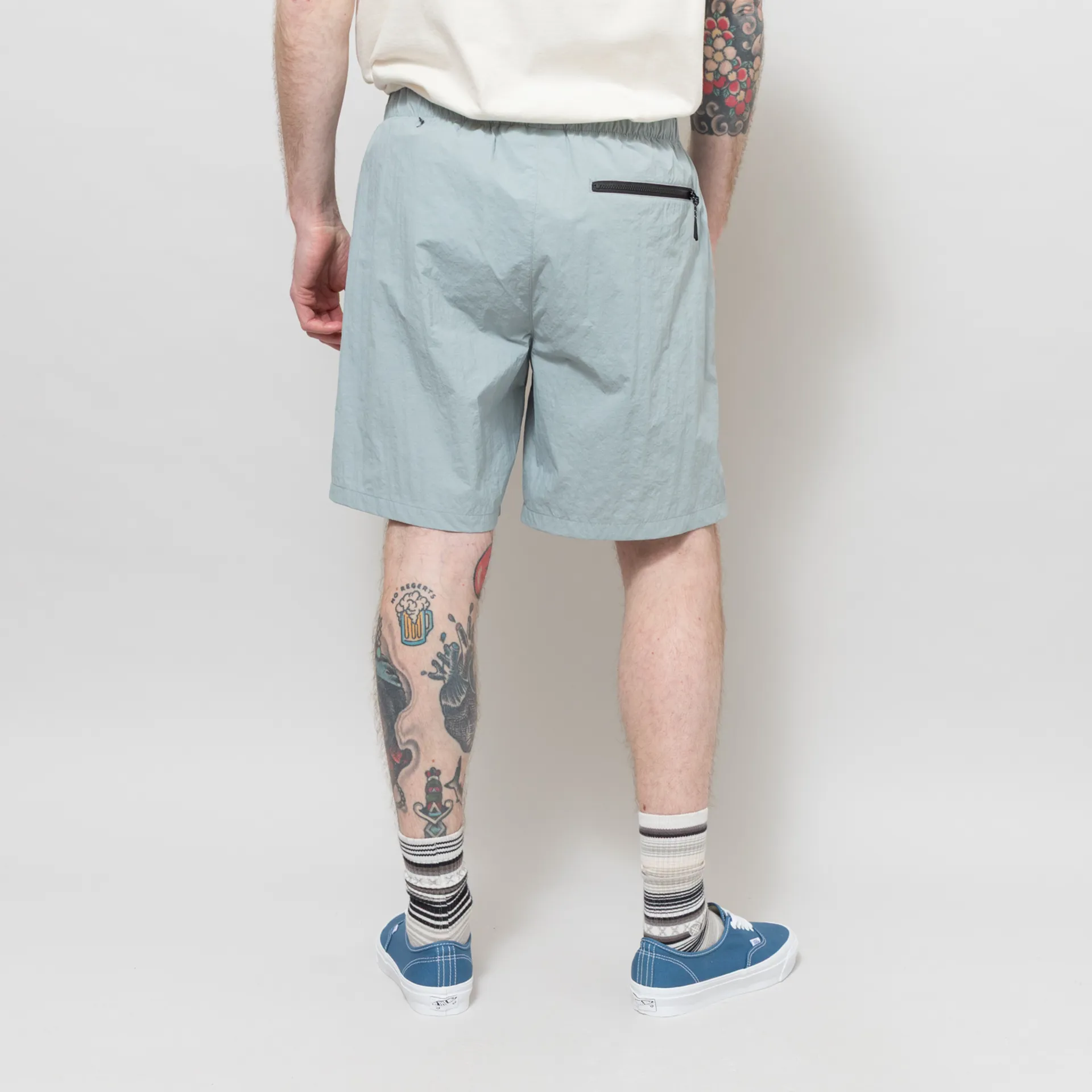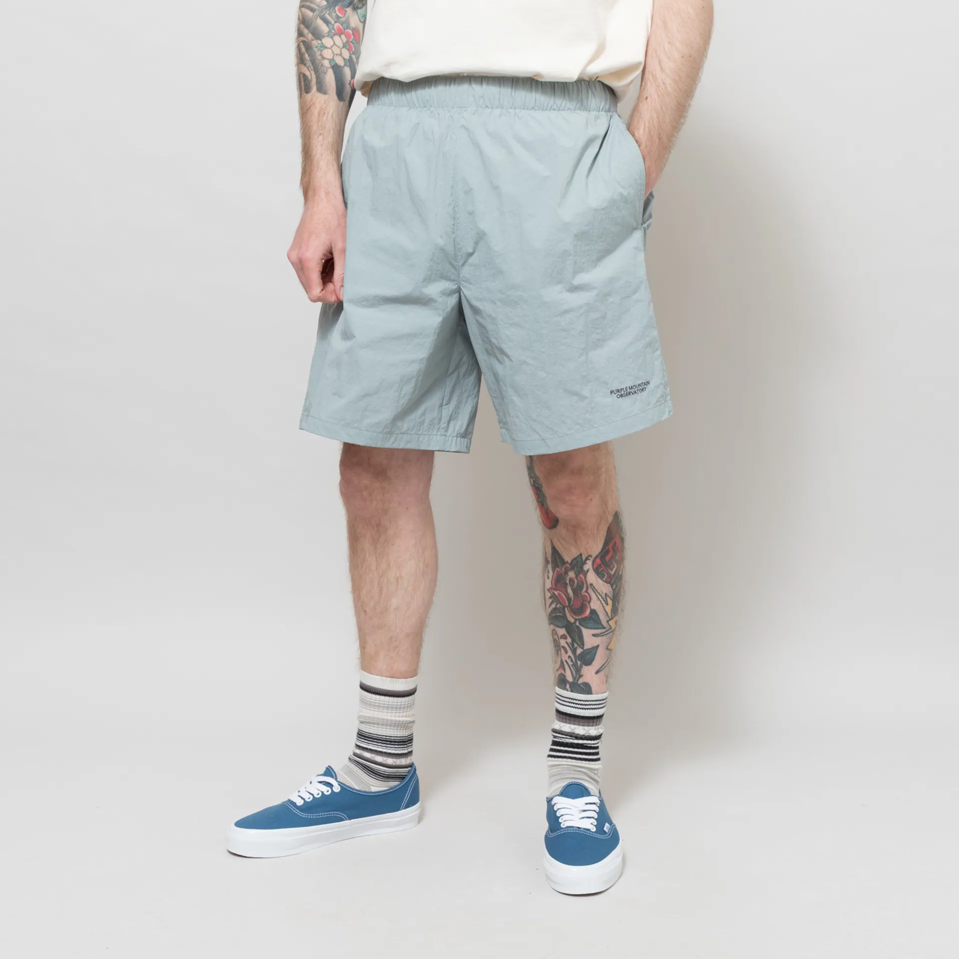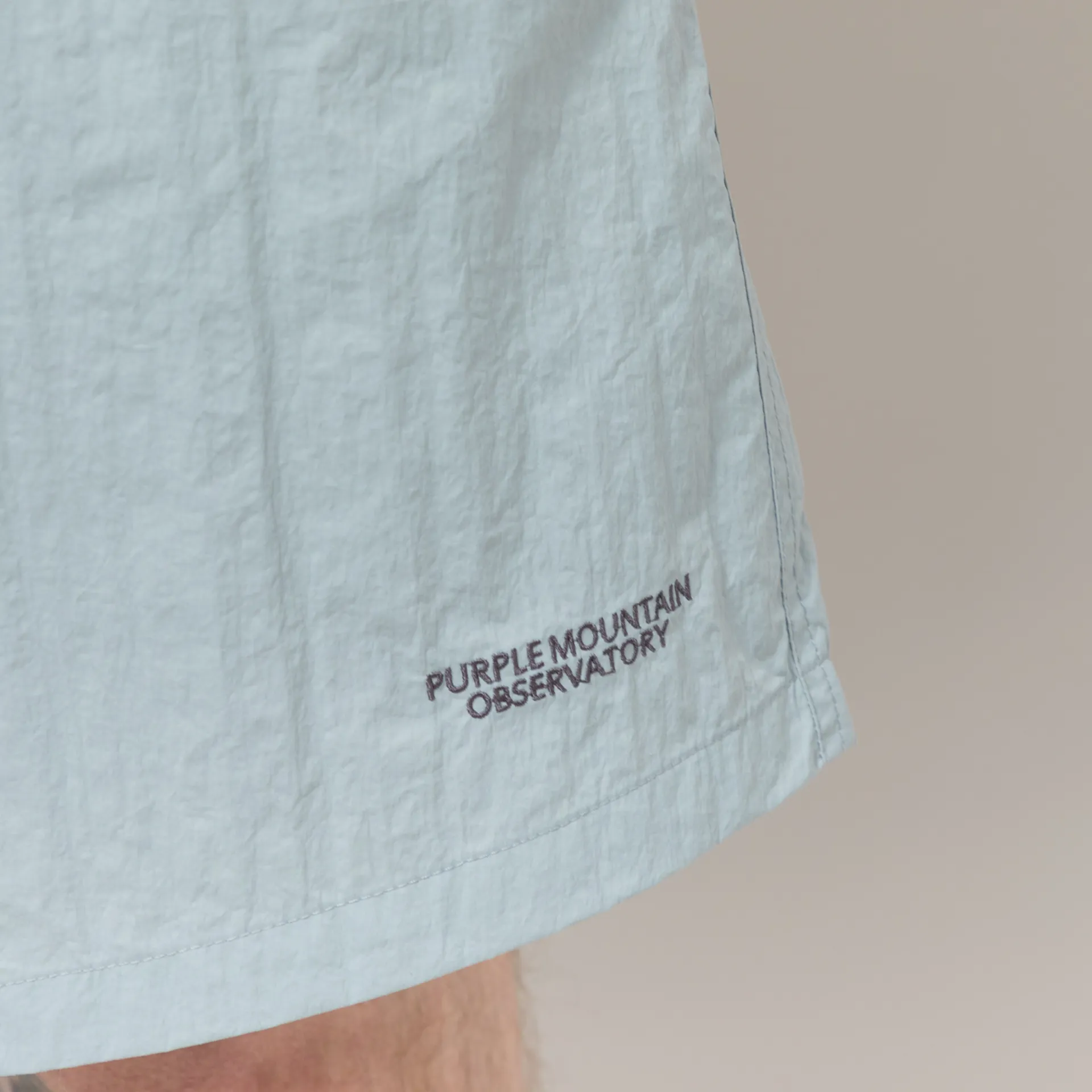The Track Shorts from Purple Mountain Observatory are constructed from lightweight crinkled nylon for easy movement and comfort.
