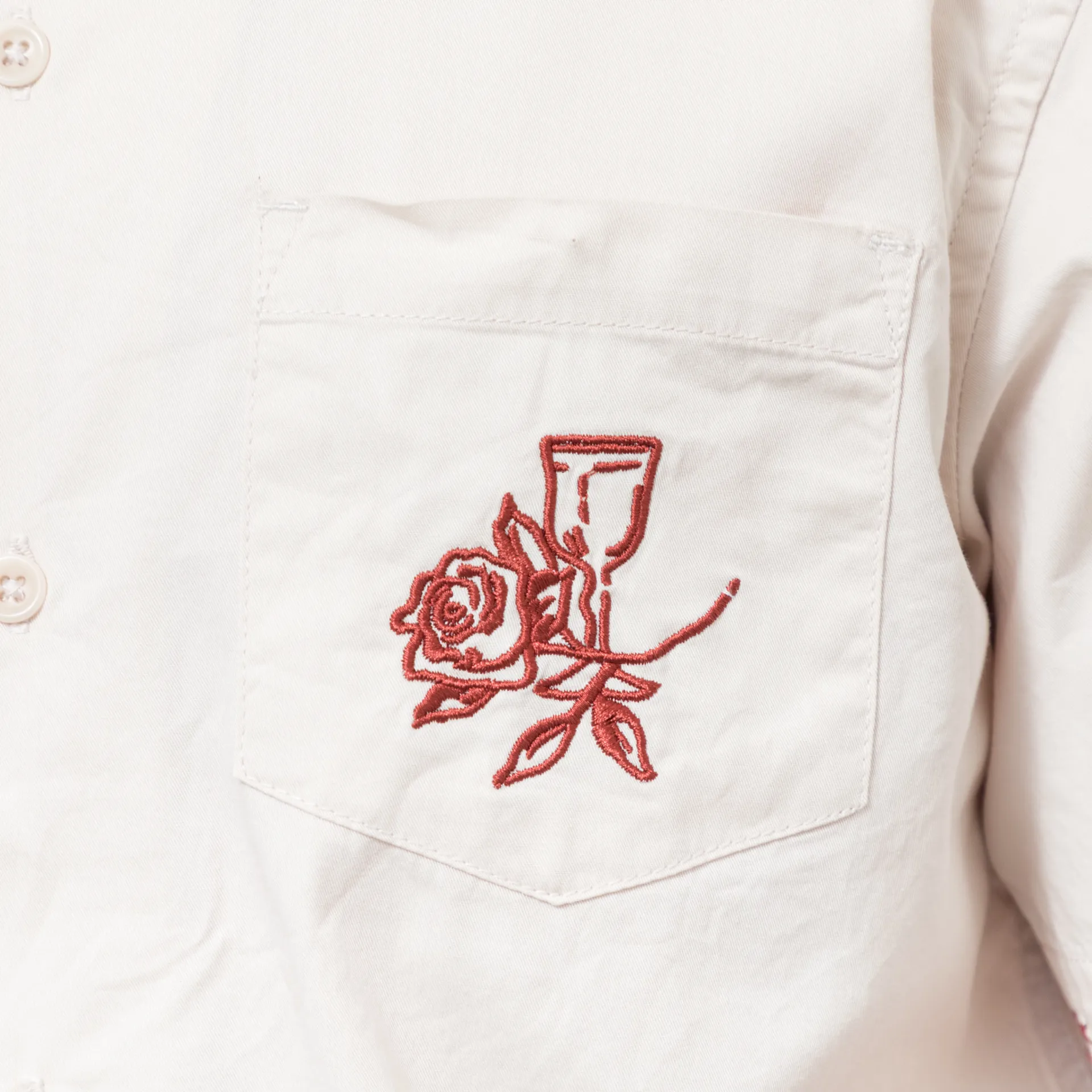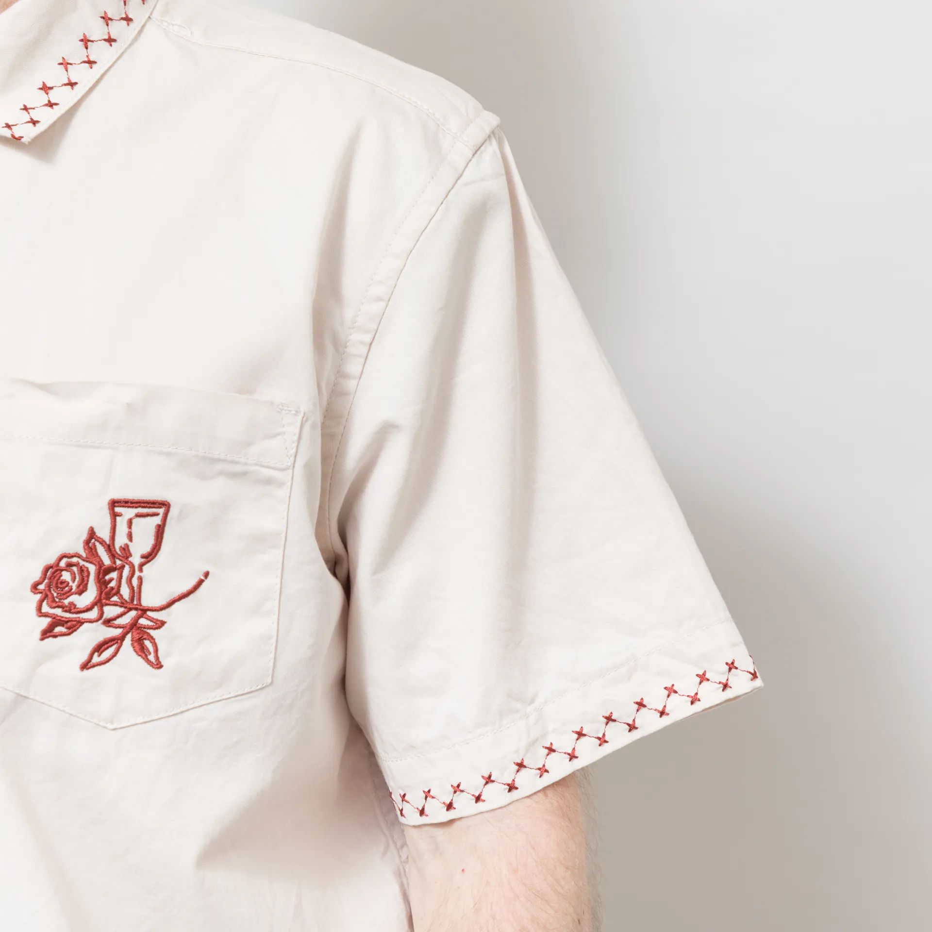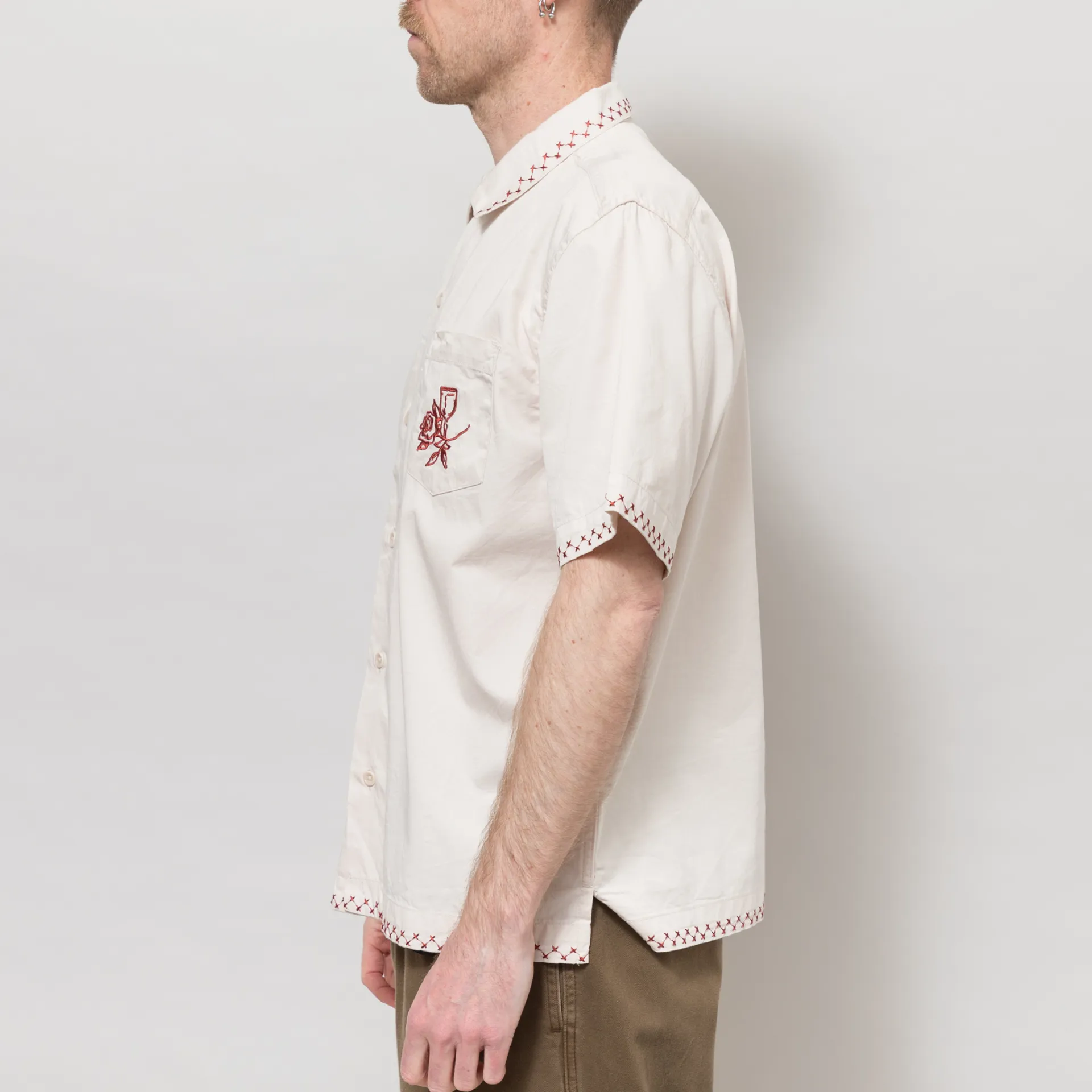 A short-sleeve shirt from Service Works, cut in a regular fit for everyday comfort and constructed with 135GSM GOTS-certified organic cotton poplin. It features a full button-through front, leading to a resort-style collar, with a straight hem and a single pocket to the chest. The design is complete with delicate embroidery details throughout.