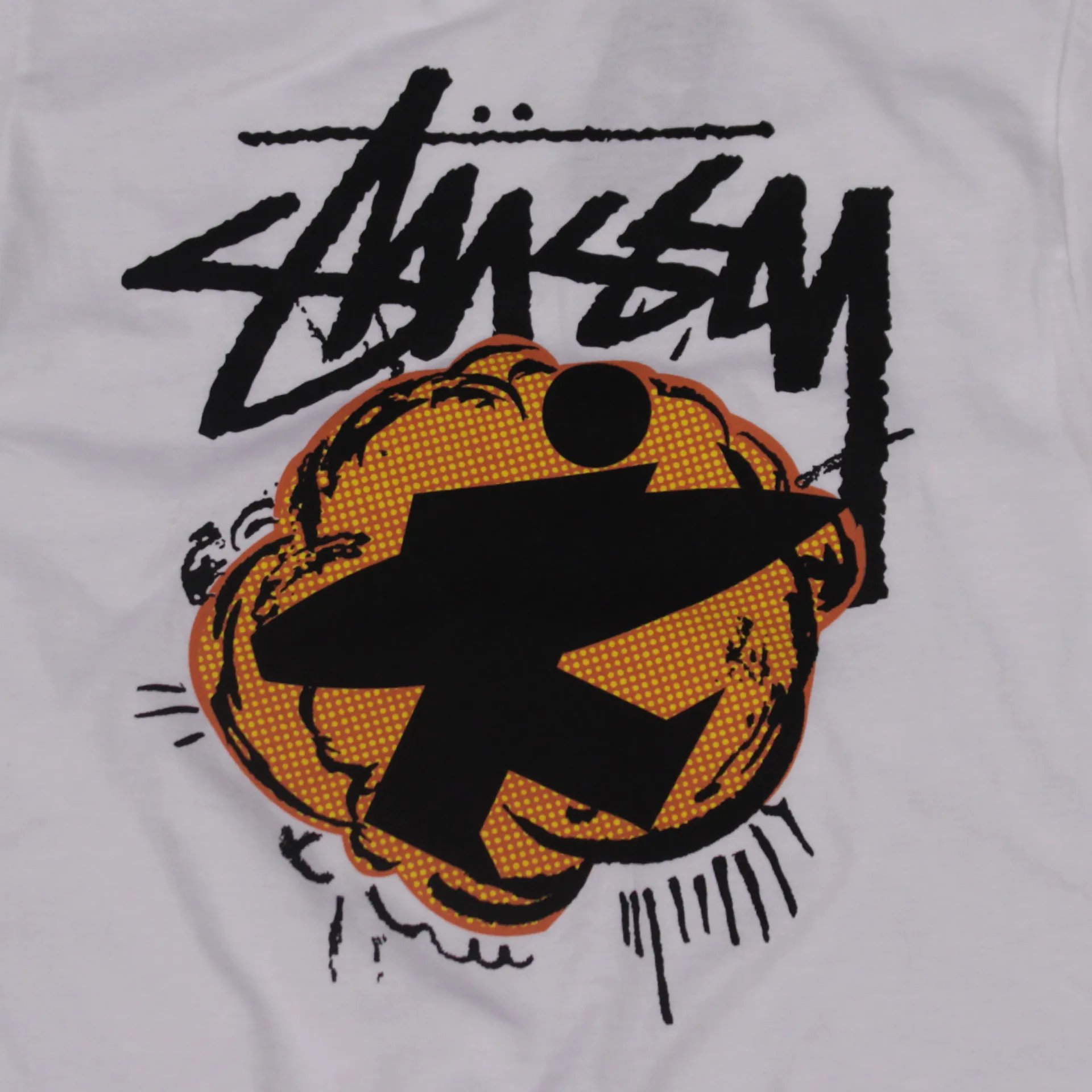 A short sleeve pop art, surfman graphic tee, featuring a large Stussy logo in the mix as well! Makes it seem like it is adding an extra bit of power while you try you tricks out if it is in the waves or on the streets. Regular fit, with ribbed collar adds a nice finishing touch to a stylish tee.