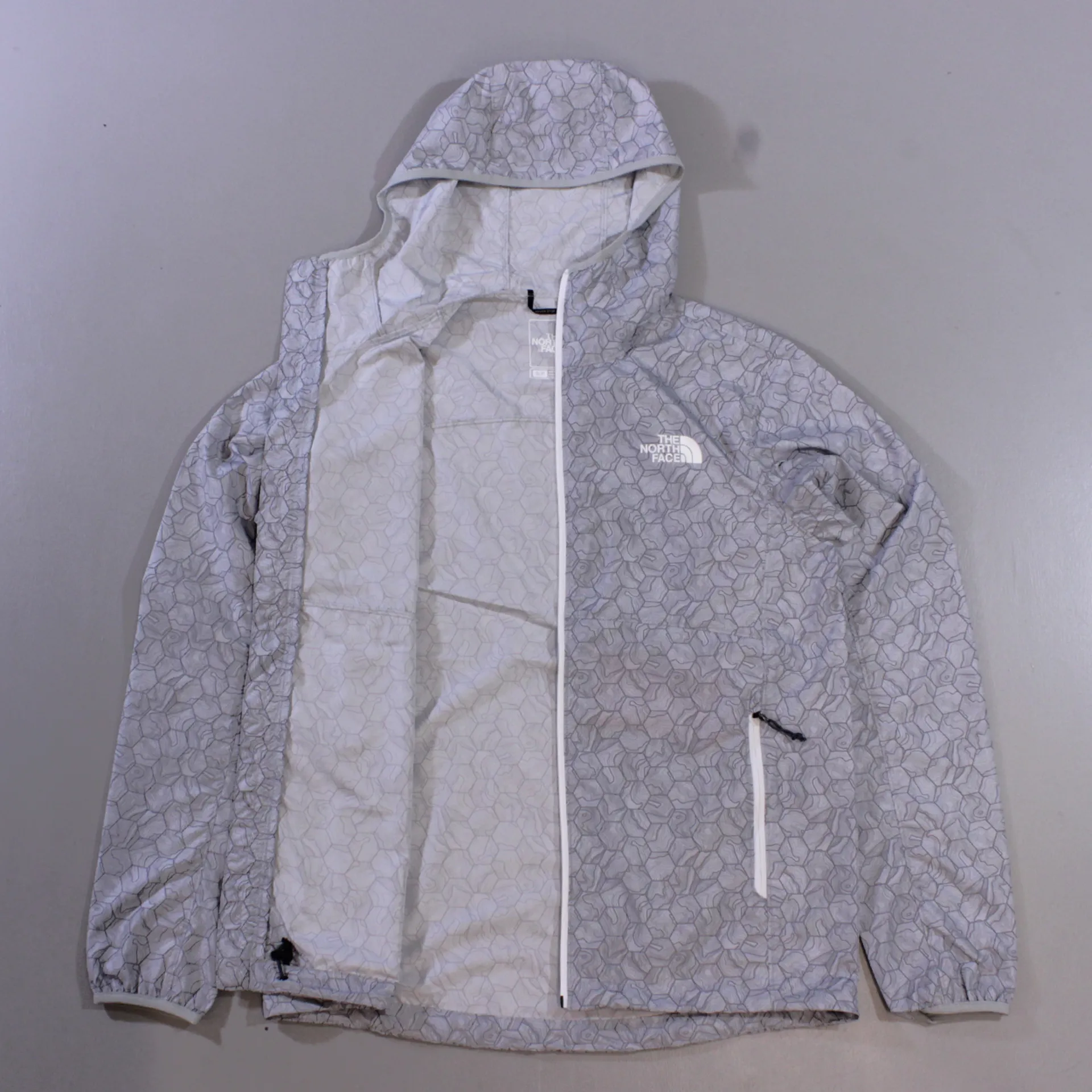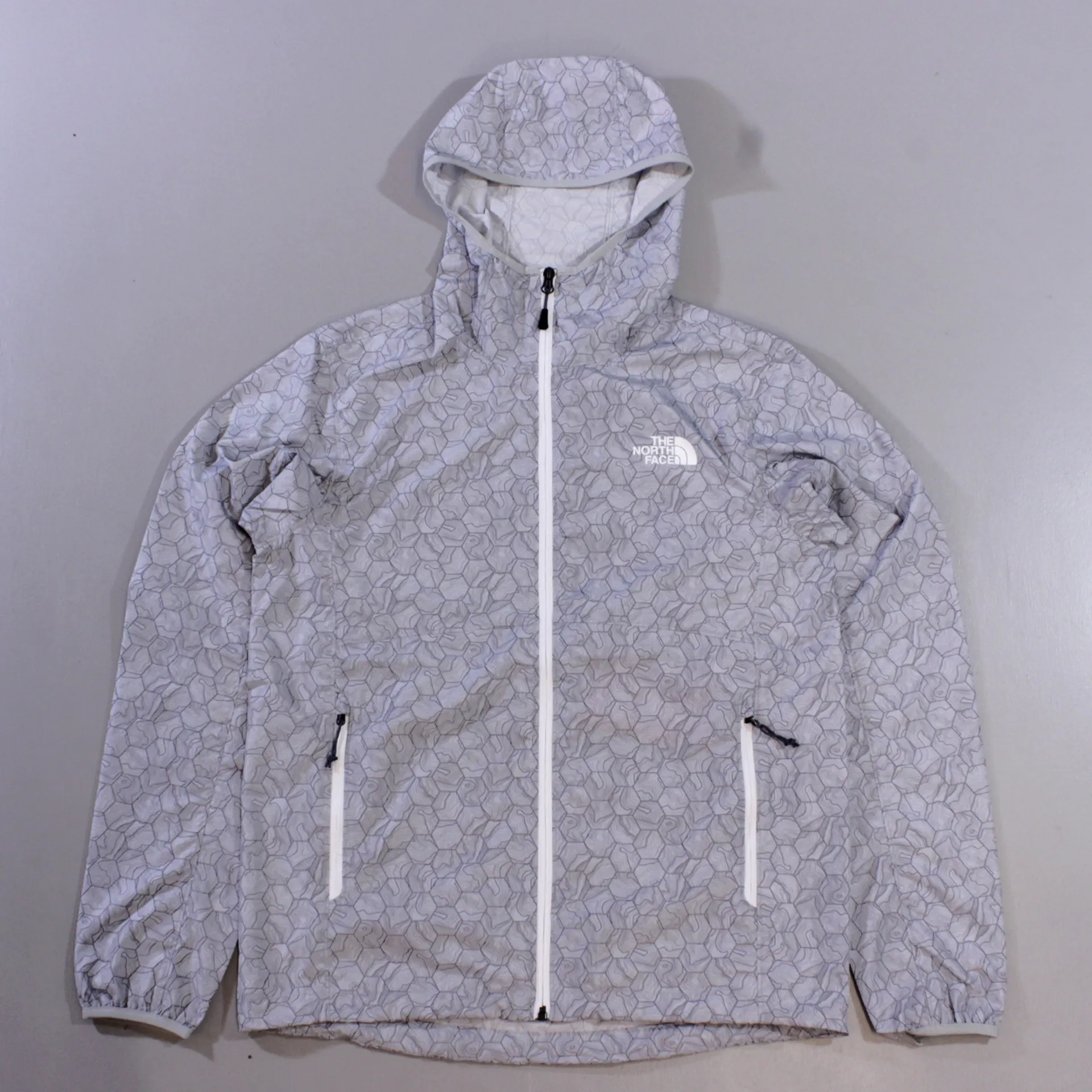 The North Face Men's Flyweight Hoodie Jacket High Rise Grey Hex Topo Print