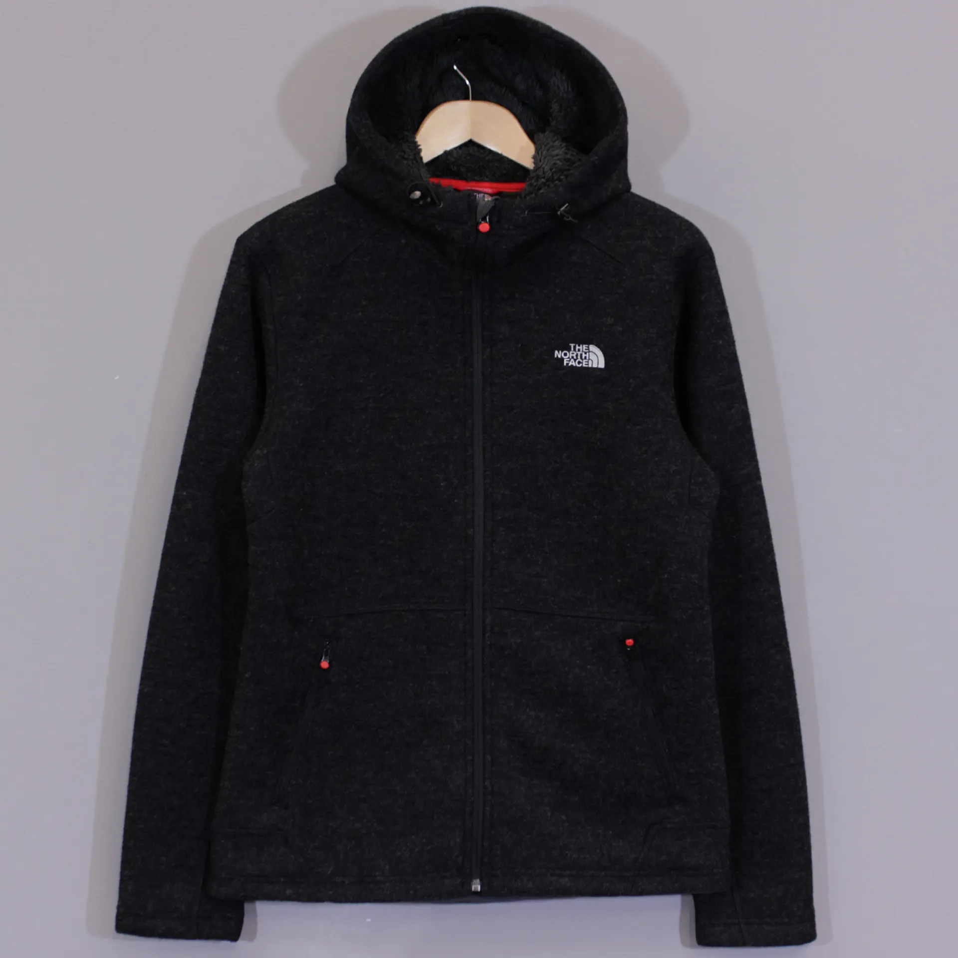 The North Face Men’s Zermatt Full Zip Hoodie is a tidy looking hooded jacket, ideally suited to the mountains as well as a few cheeky jars down the local watering hole after. It's construction from a warm, rugged polyester and wool blended fabric with a fleece backing make this a warm and durable piece. The jacket features an adjustable hem and hood to keep he heat in and the wind out. It has two hand-warming kangaroo style stash pockets. Embroidered logos contrasted on the front and back combine with distinctive stitching detail to give this hooey a top notch look.