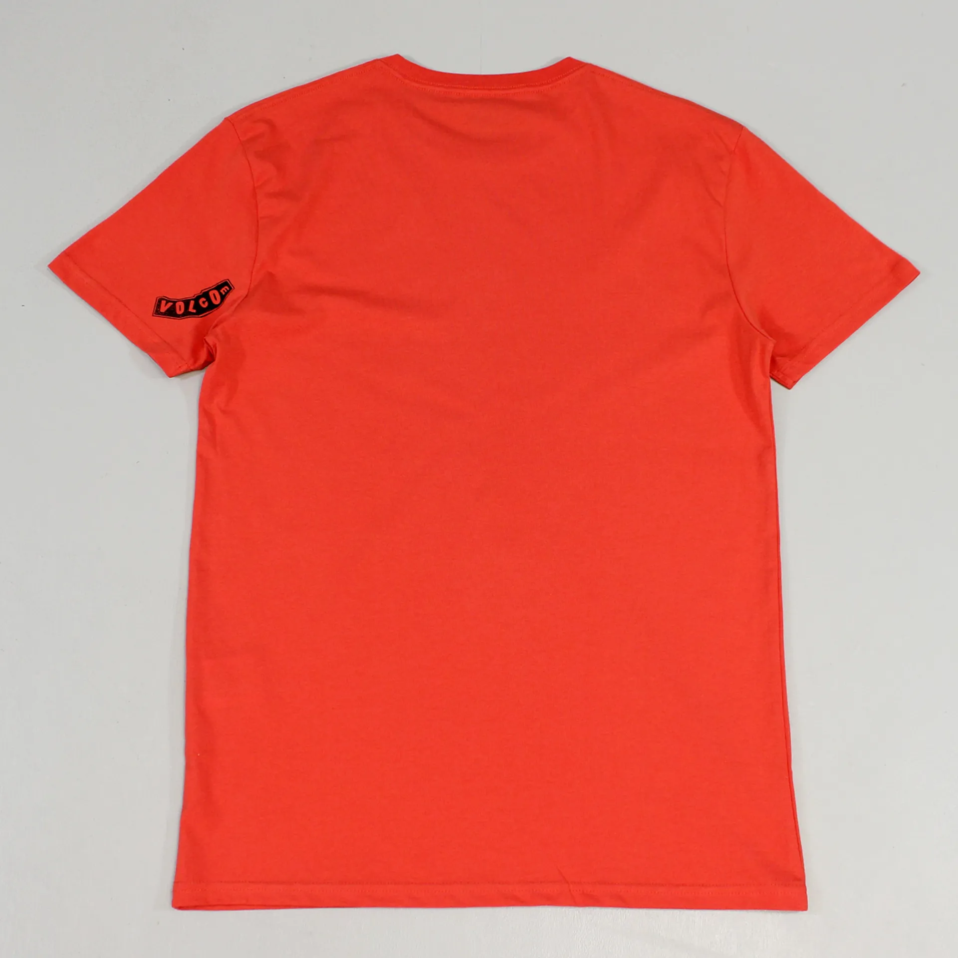 A simple red, organic cotton tee, with short sleeves and a printed graphic to the front chest from Volcom.