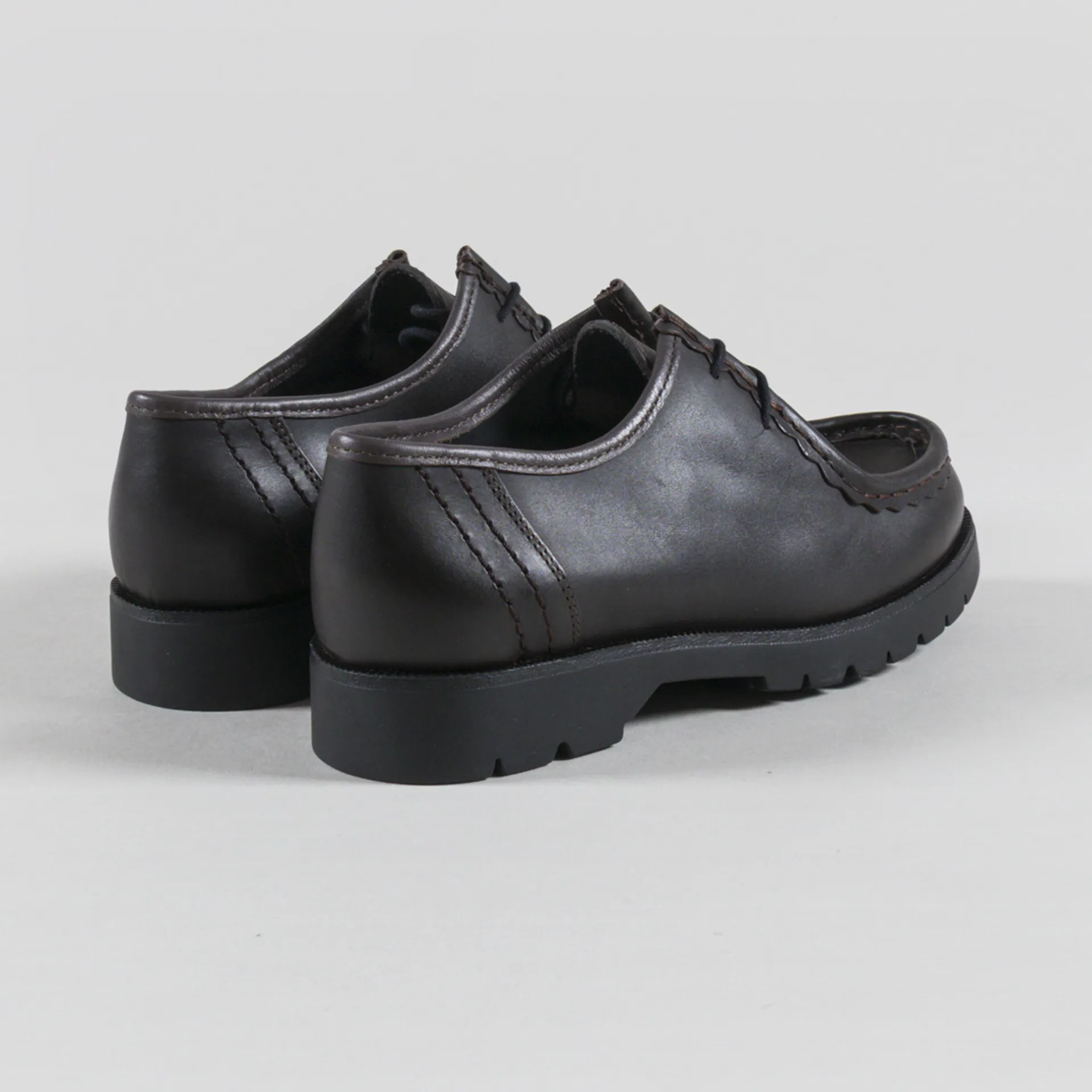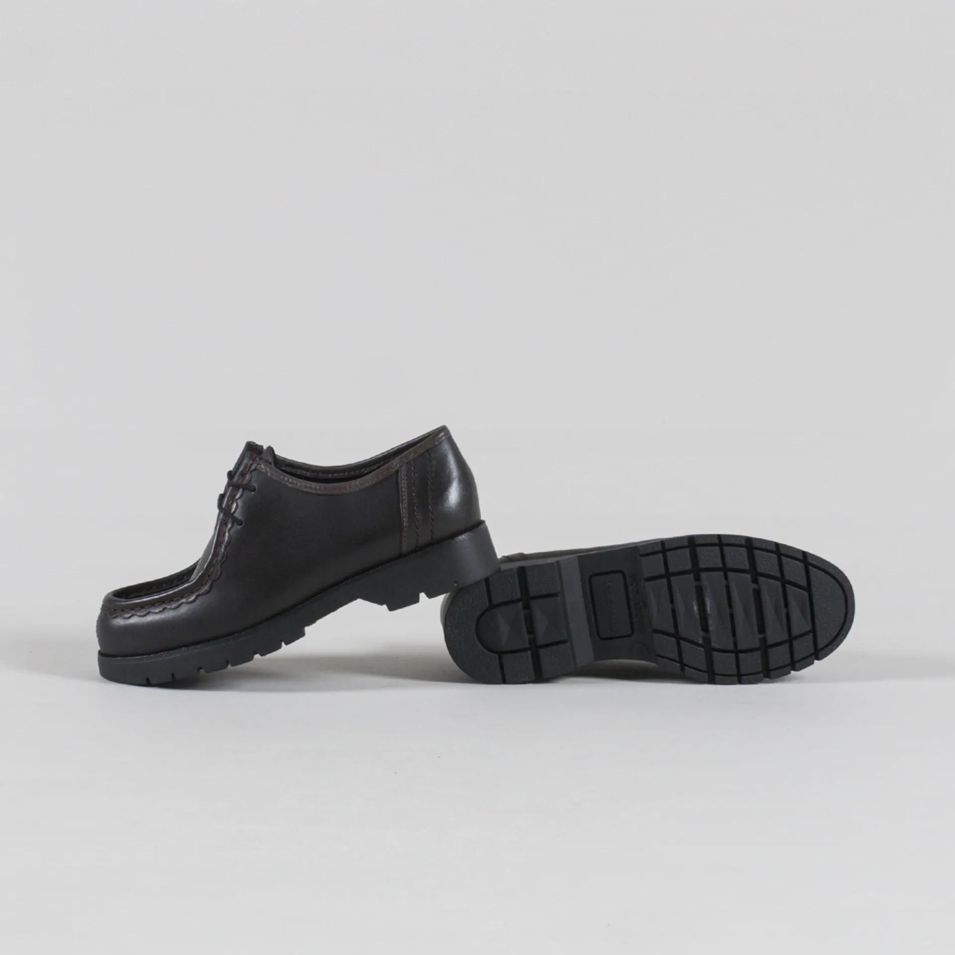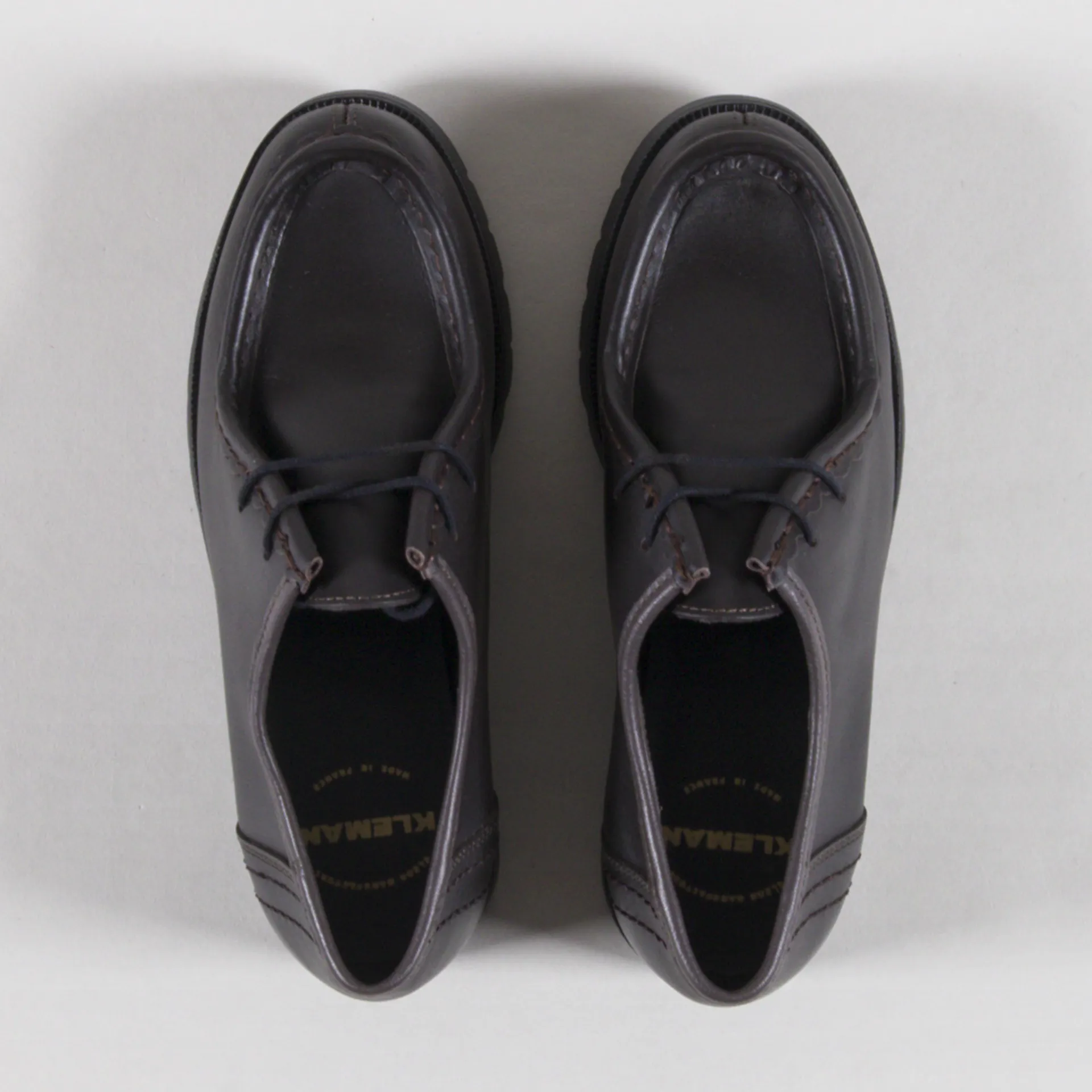 A pair of shoes from French footwear label Kleman, made from a smooth chromefree leather, unlined, with a slightly cushioned insole, a chunky mocassin toe box and a thick rubber outsole, made from 20% recycled materials.