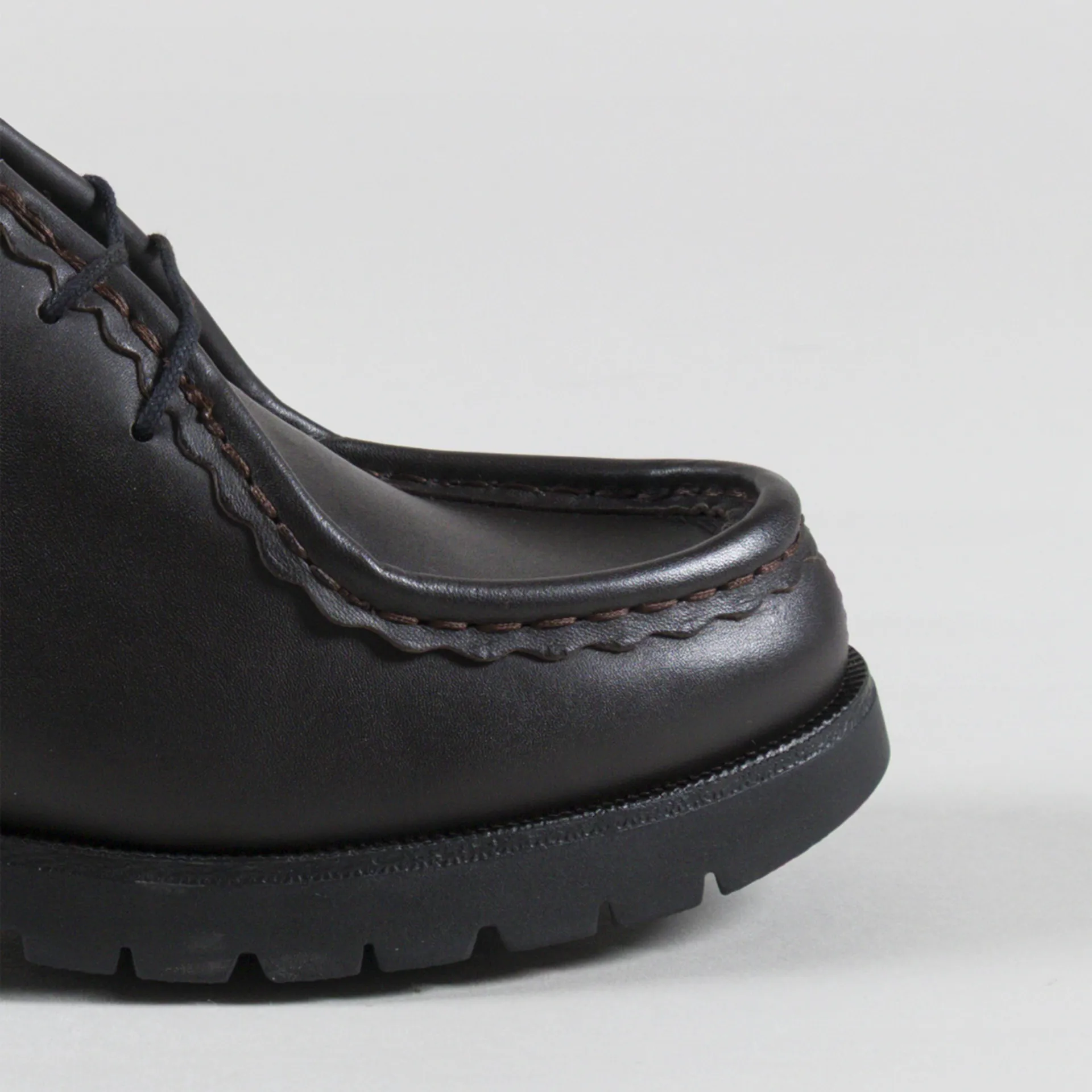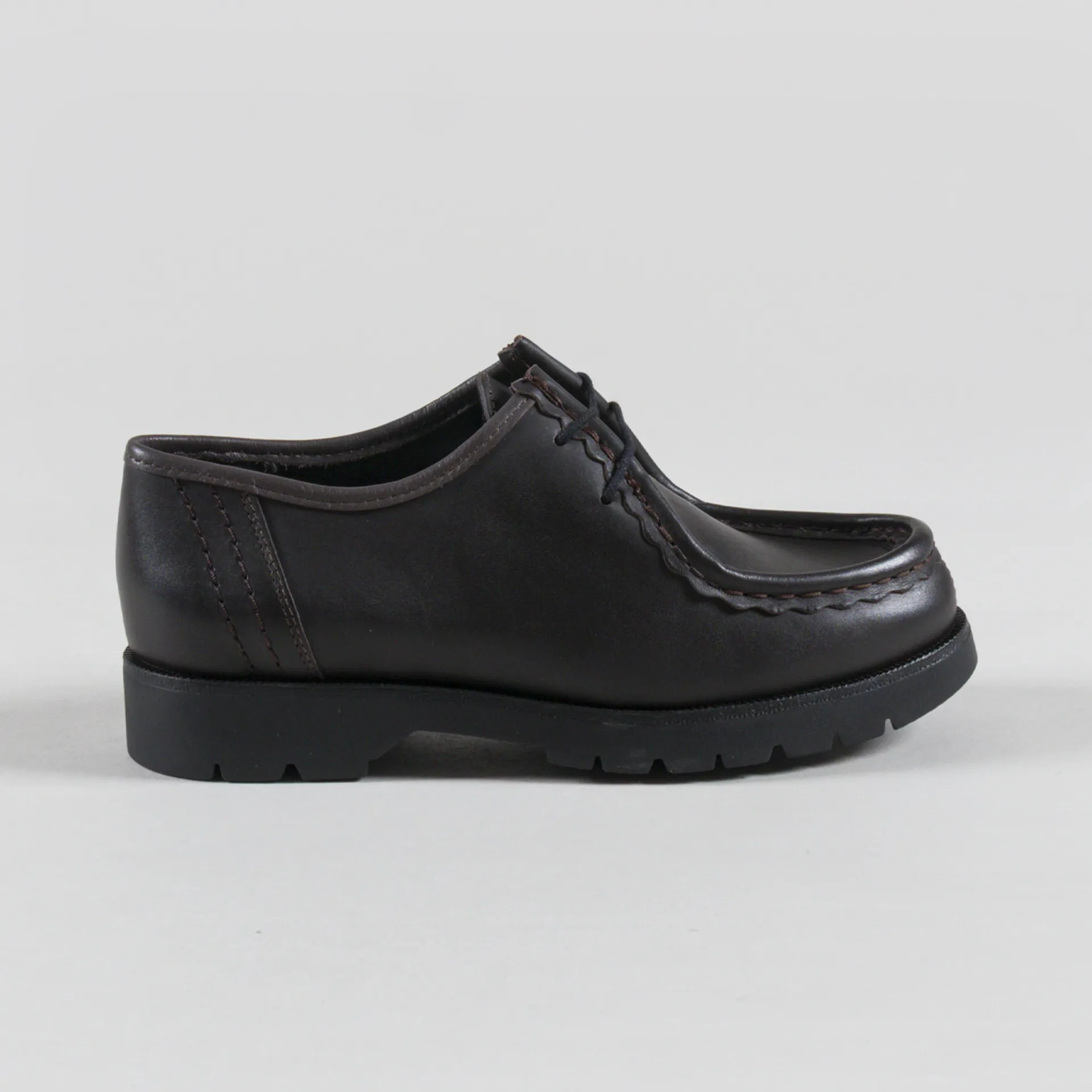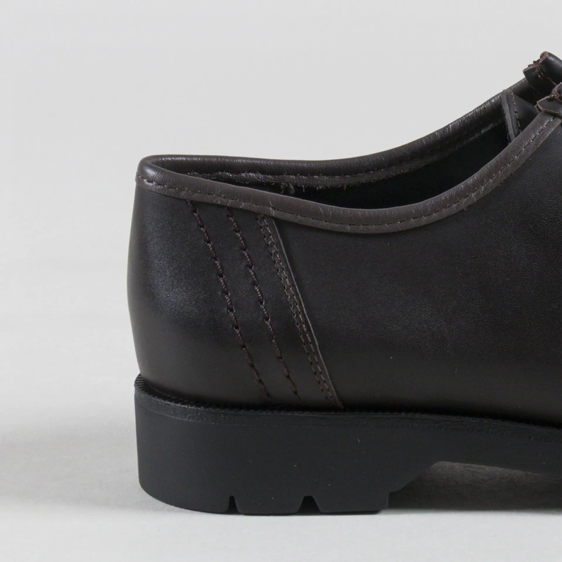 A pair of shoes from French footwear label Kleman, made from a smooth chromefree leather, unlined, with a slightly cushioned insole, a chunky mocassin toe box and a thick rubber outsole, made from 20% recycled materials.