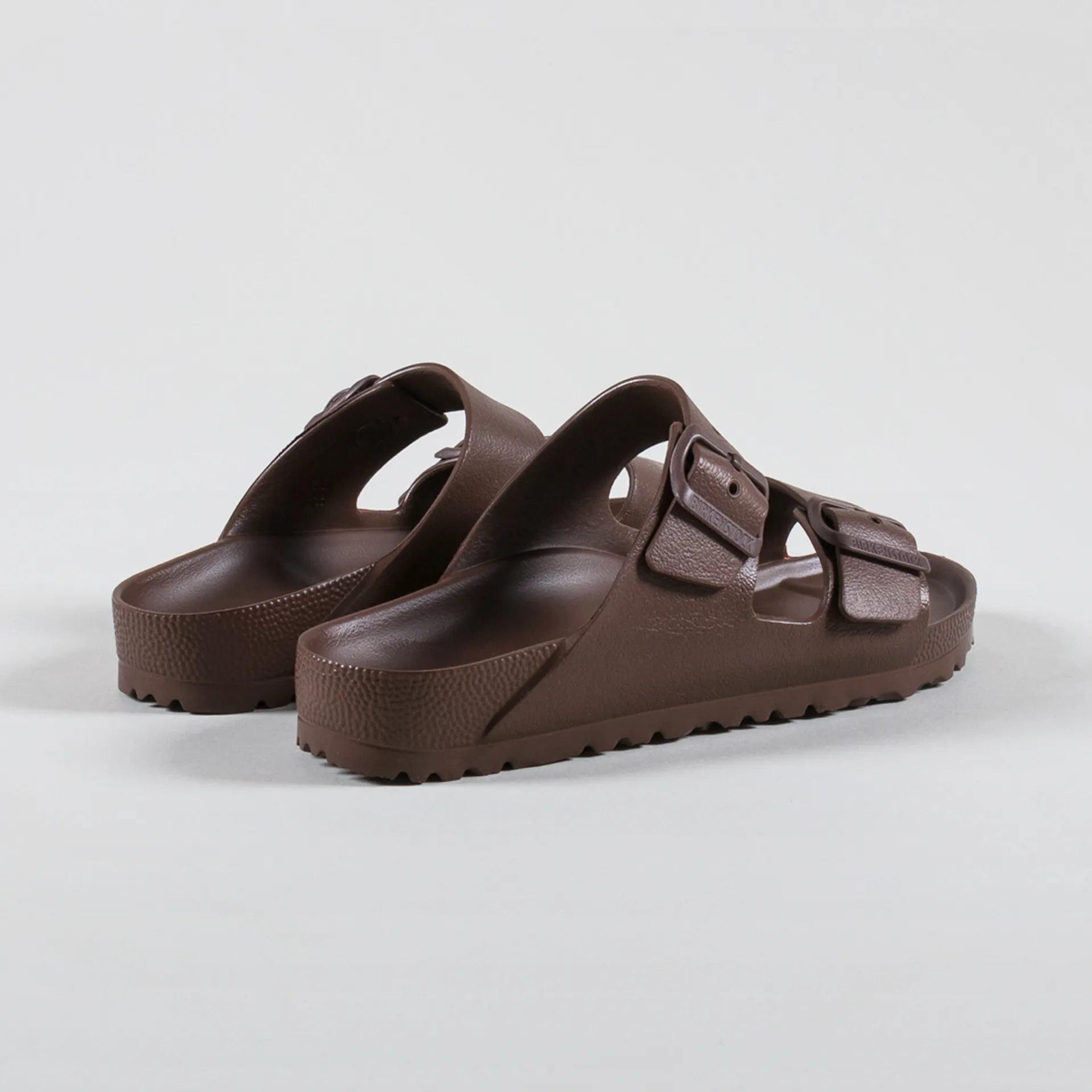 A pair of sandals from Birkenstock's Womens' collection, made from a comfortable, lightweight EVA with two straps, buckles featuring embossed script and an orthopaedic footbed, along with a grippy tread.