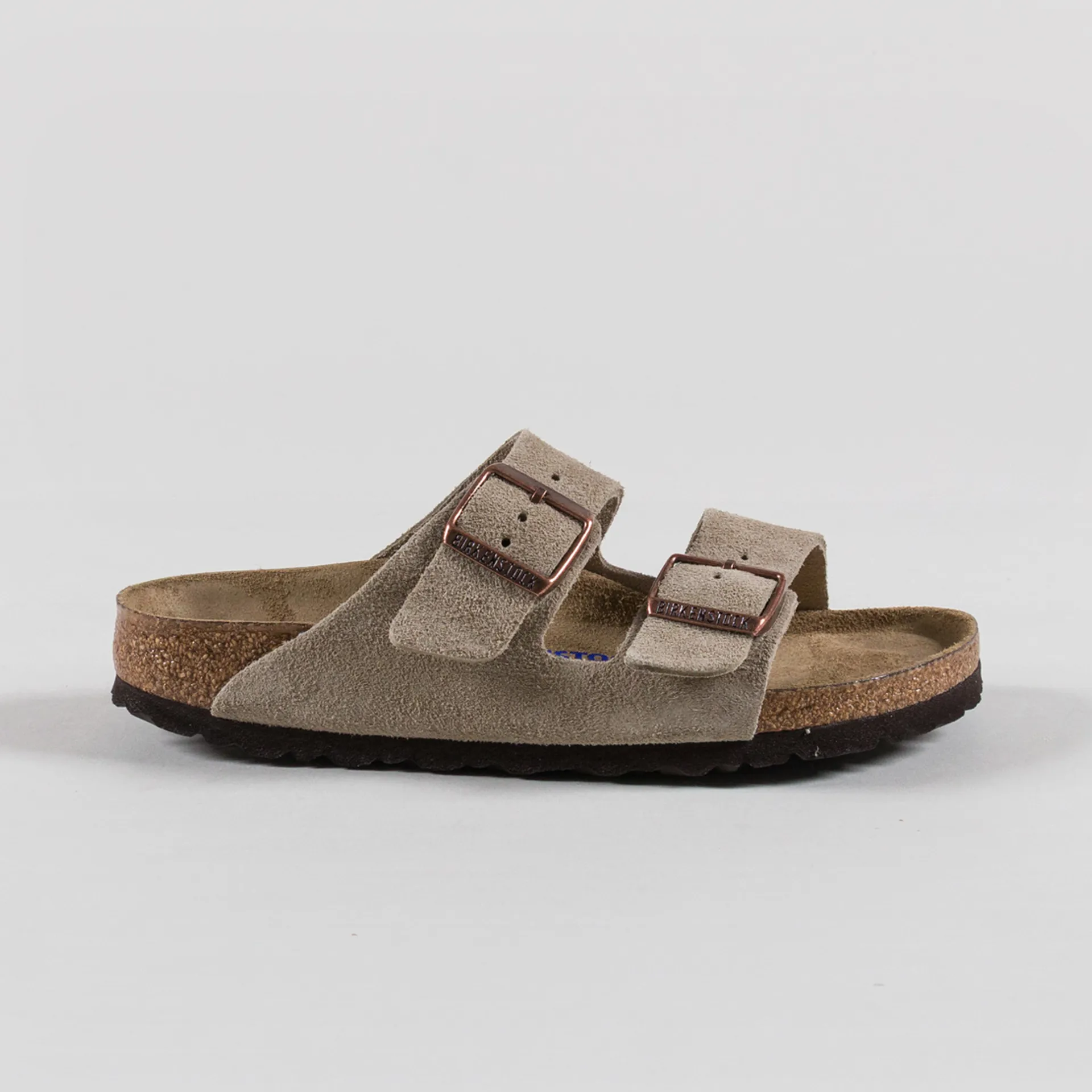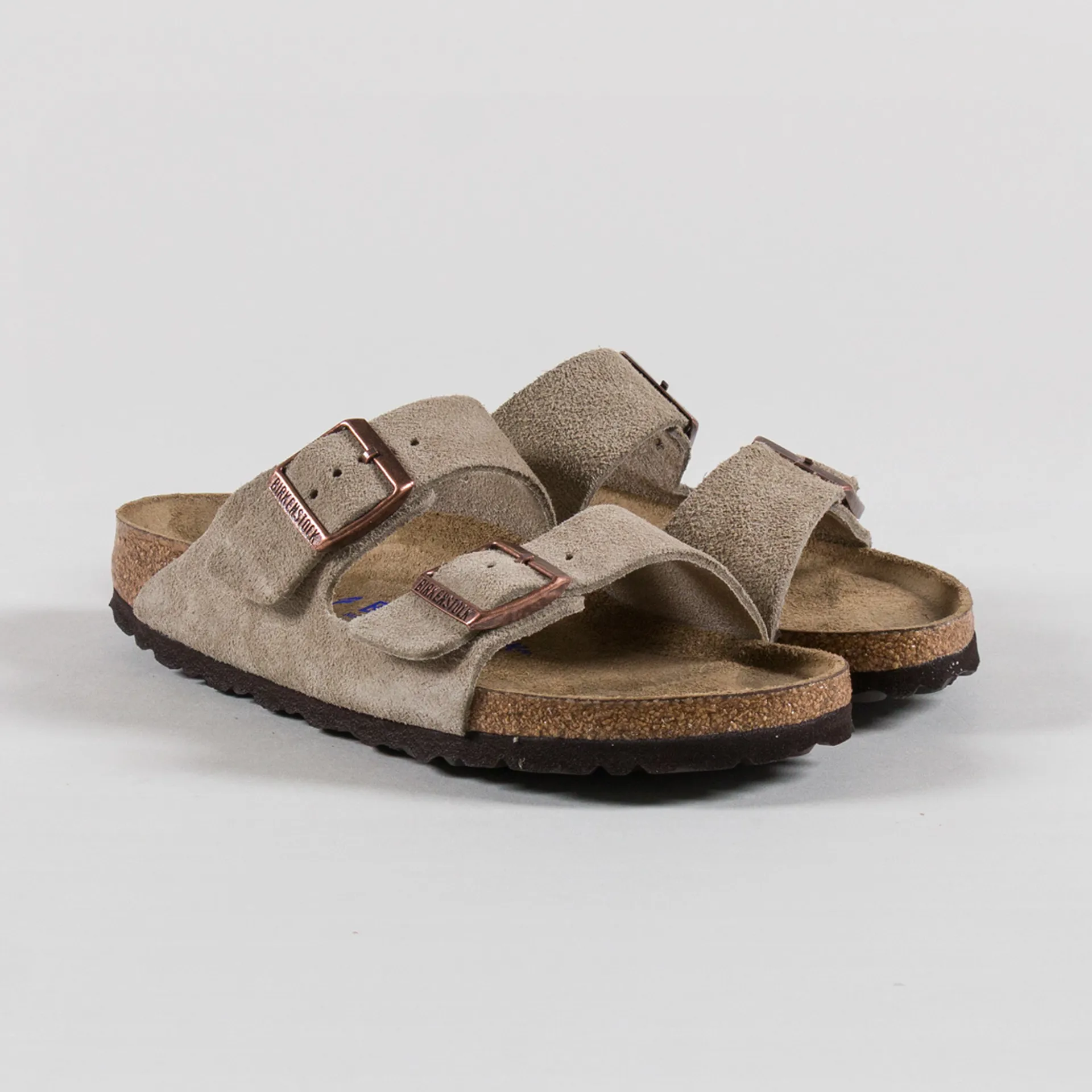 A pair of Birkenstock's flagship Arizona sandals, made from an upper of premium suede with buckled straps