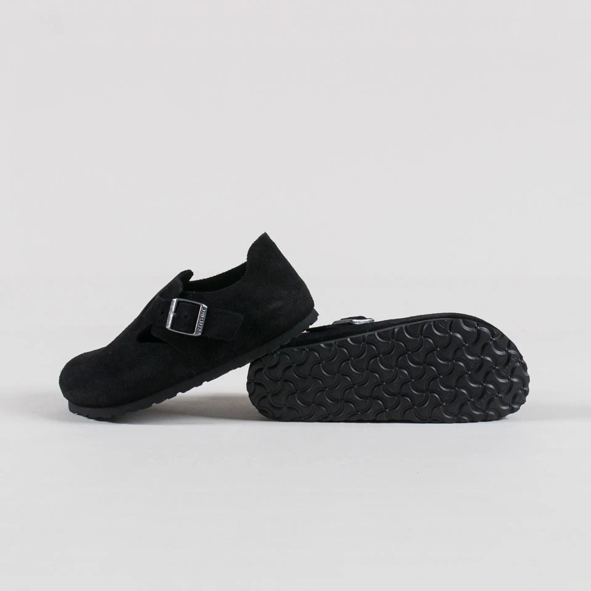 Birkenstocks London Sandal is the enclosed version of the Boston clog, made from a premium suede upper. The single strap to the upper is held together by a metallic buckle embossed with logos. They feature an outsole made from a lightweight EVA, which is grippy and shock-absorbent.