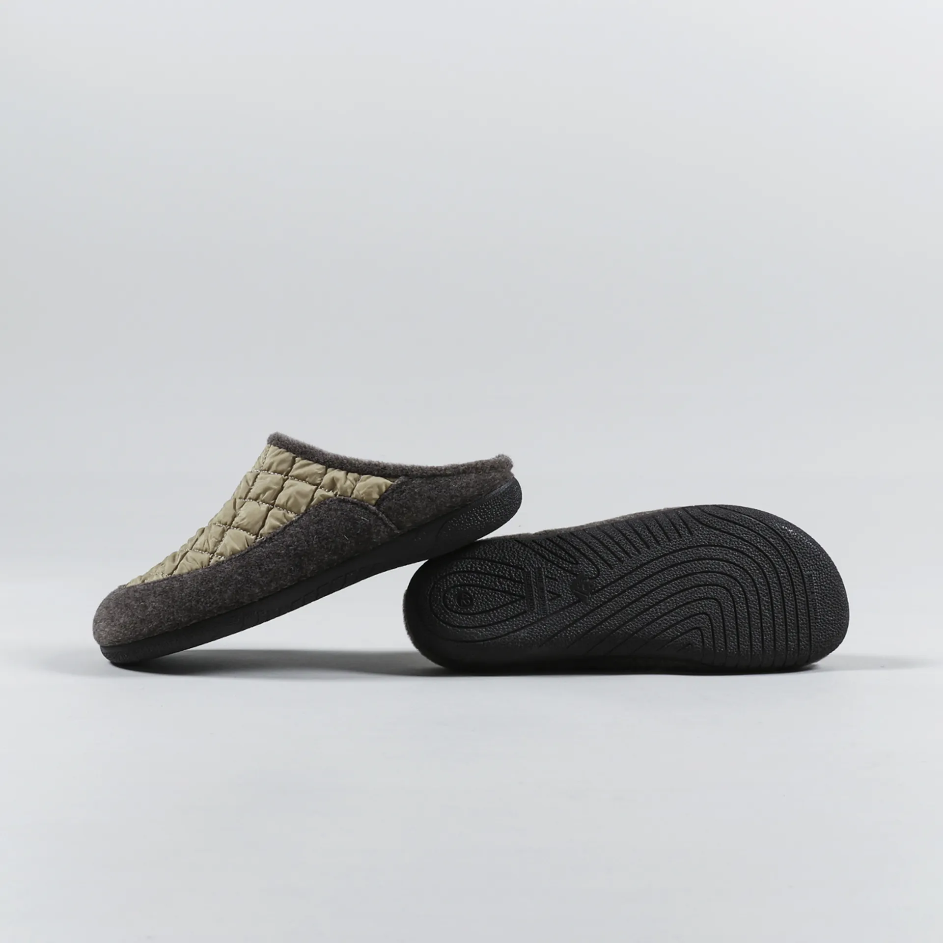 A pair of slippers from Spanish footwear label Gurus, made from an upper of quilted nylon with a brushed felt foxing tape and a microfleece lining, sitting on a durable and grippy rubber tread.