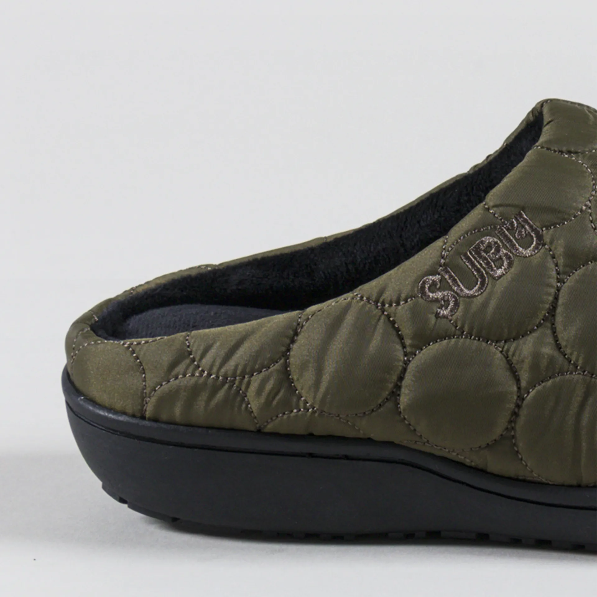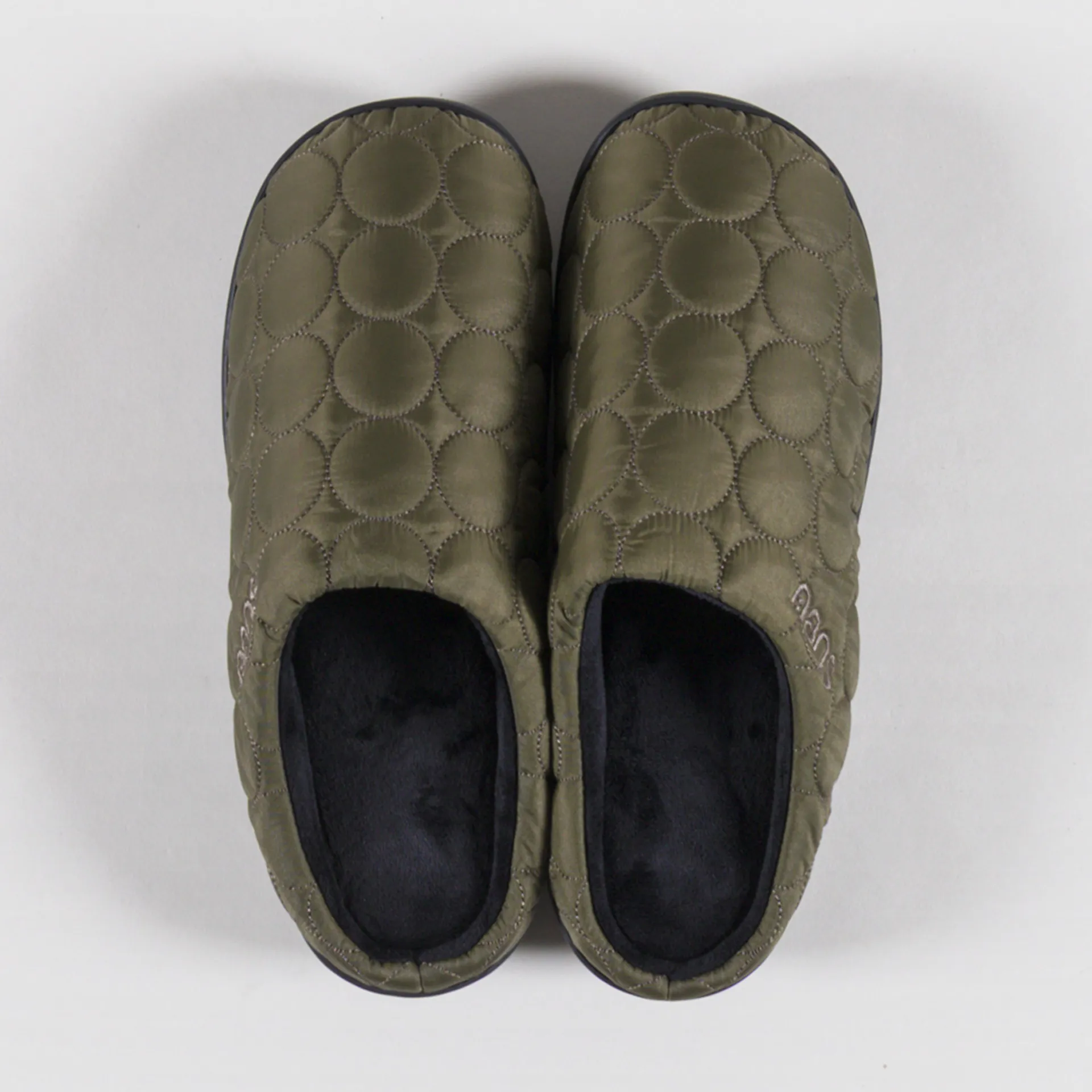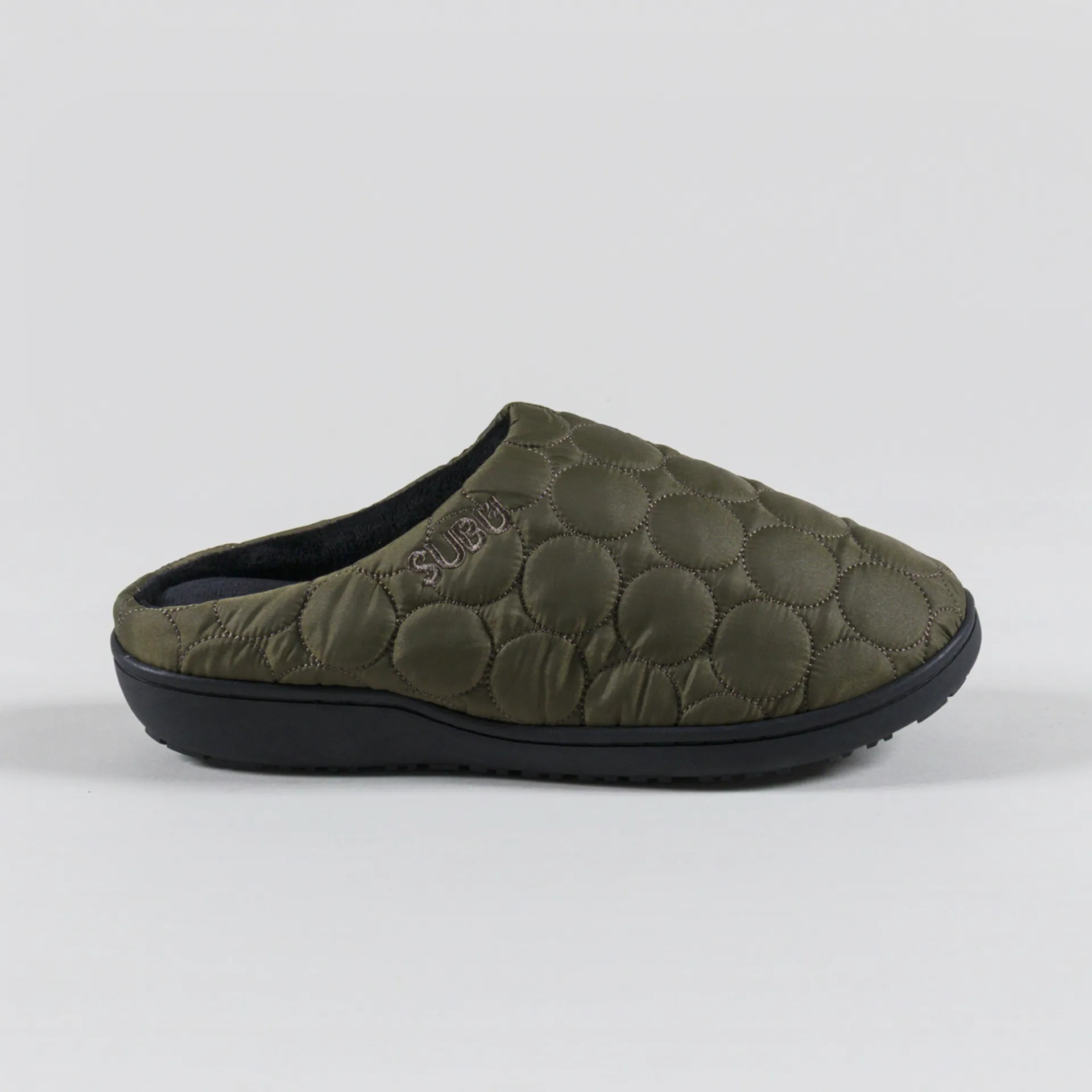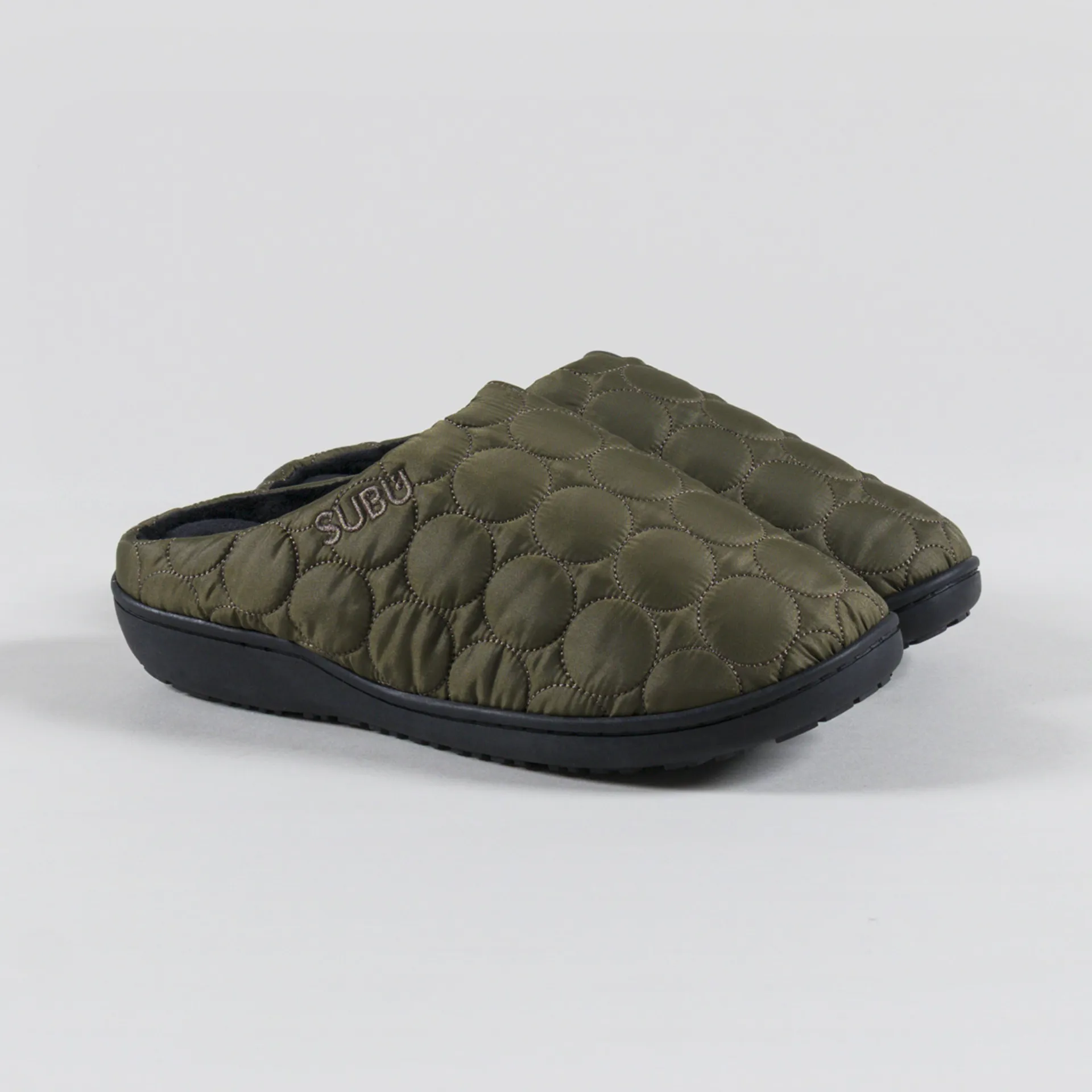 A pair of warm winter slippers from Subu Tokyo, made from a water-resistant Teflon coated shell, which is padded for extra warmth, and sits upon a durable and grippy rubber outsole/tread.