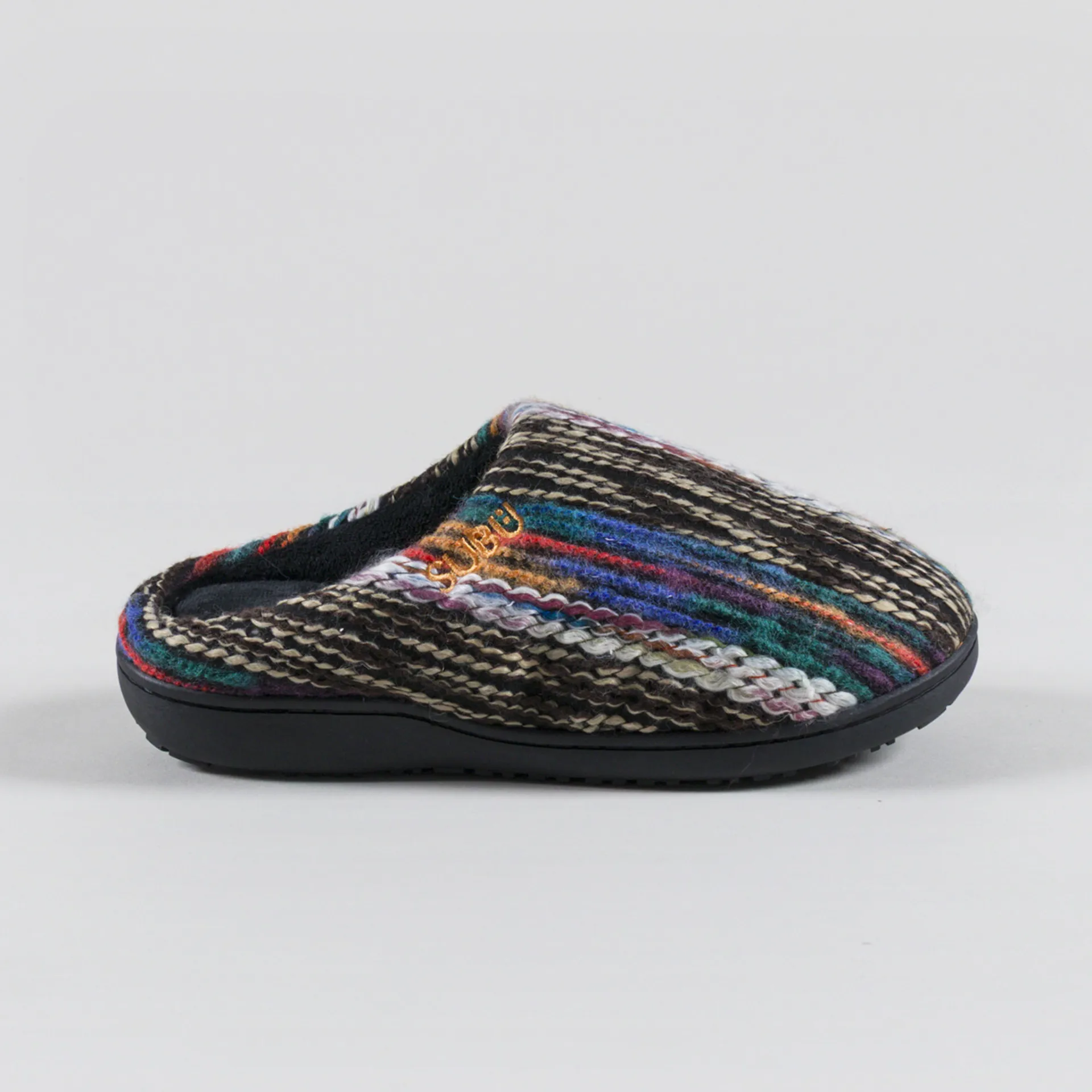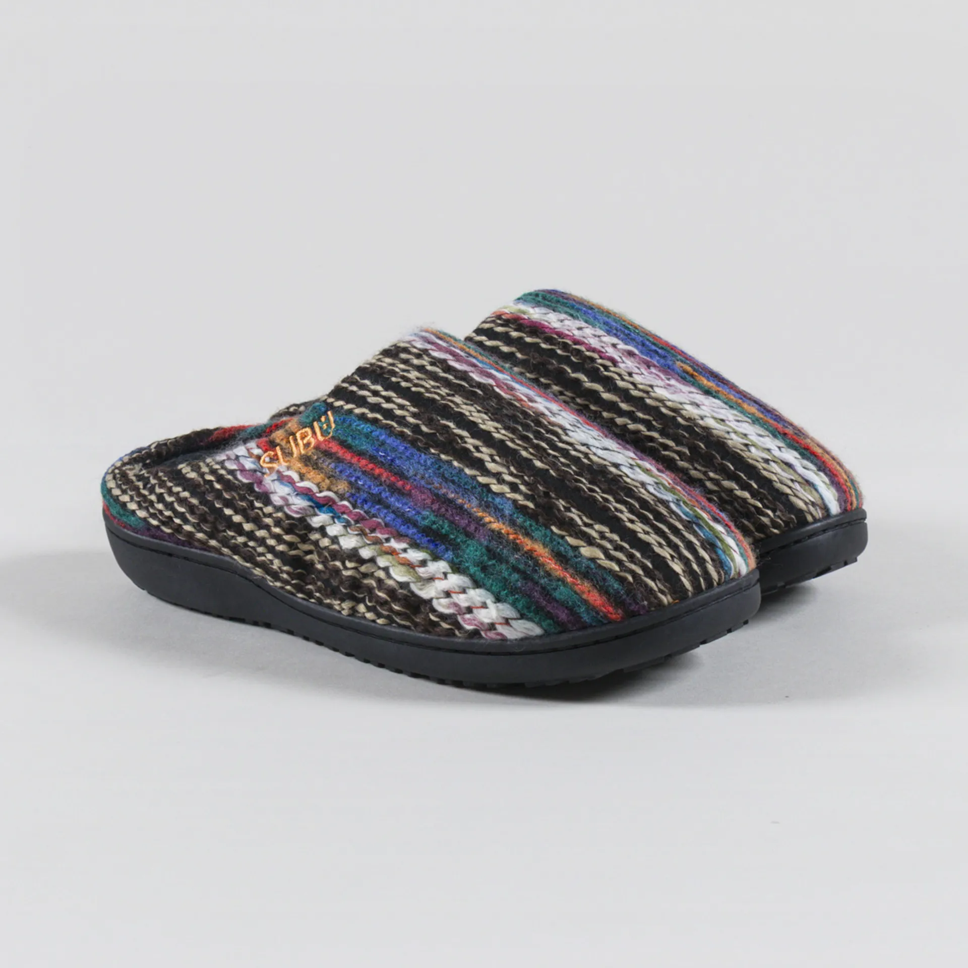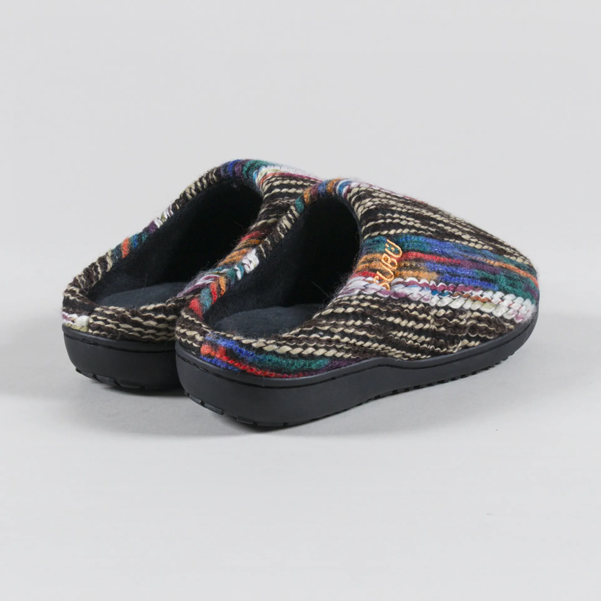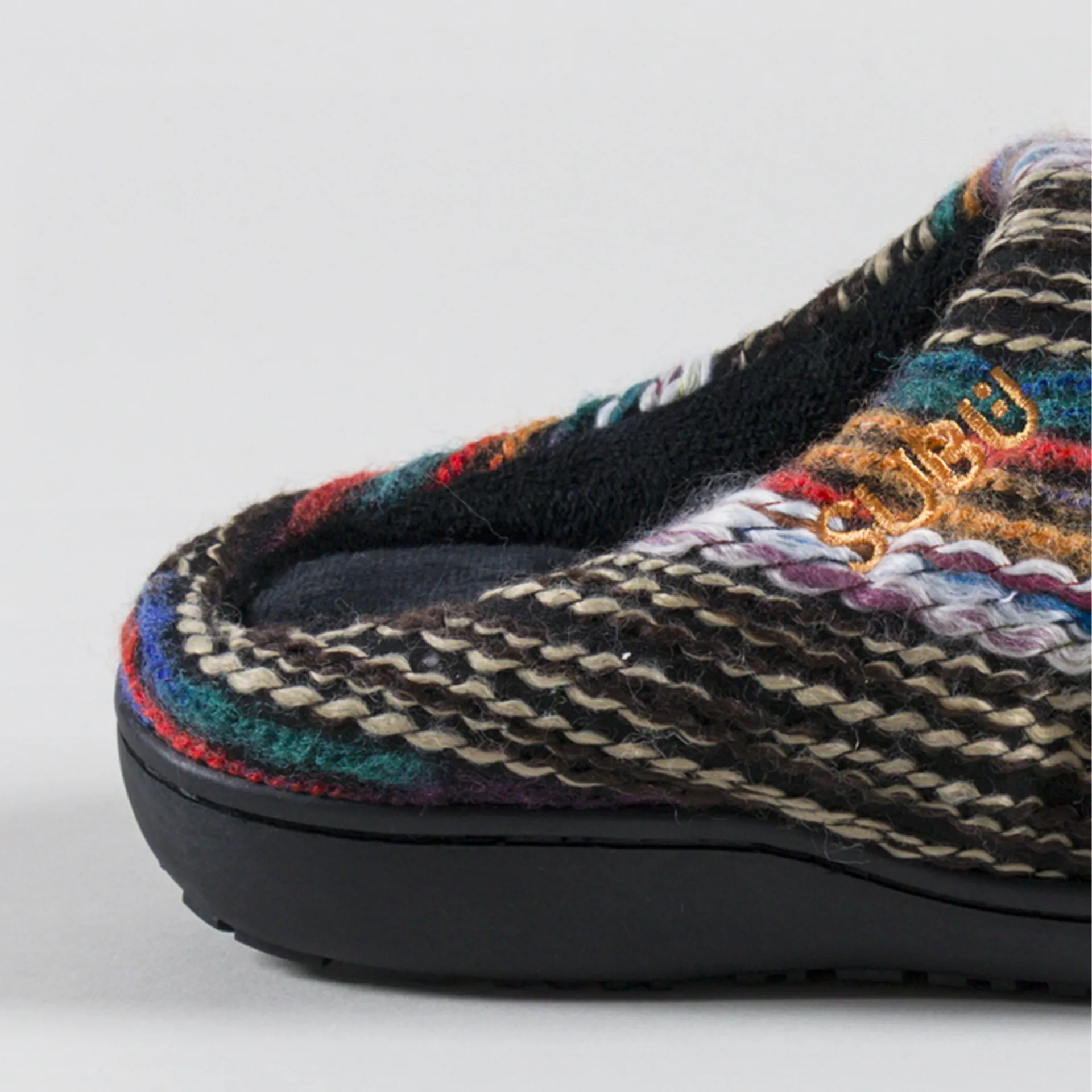 A pair of winter slippers from Subu Tokyo, made with a Kaleidoscopedesign with a knit-like texture and sits upon a durable and grippy rubber outsole and tread.