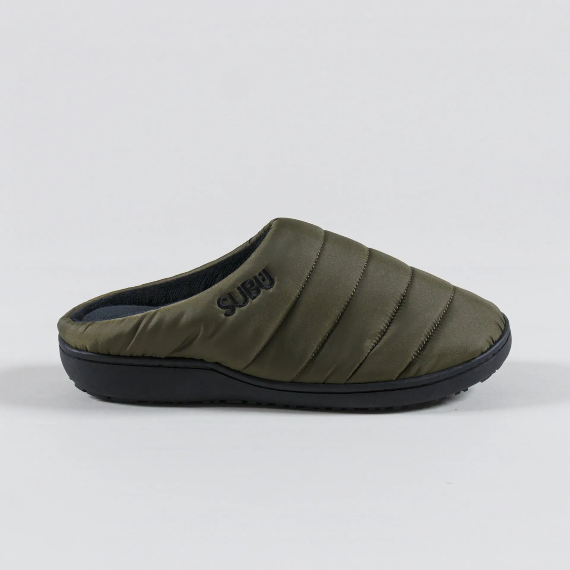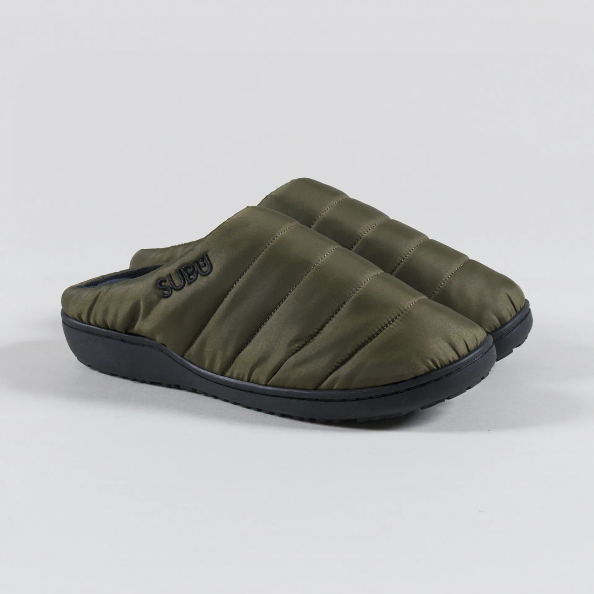 A pair of warm winter slippers from Subu Tokyo, made from a water-resistant Teflon coated shell, which is padded for extra warmth, and sits upon a durable and grippy rubber outsole/tread.