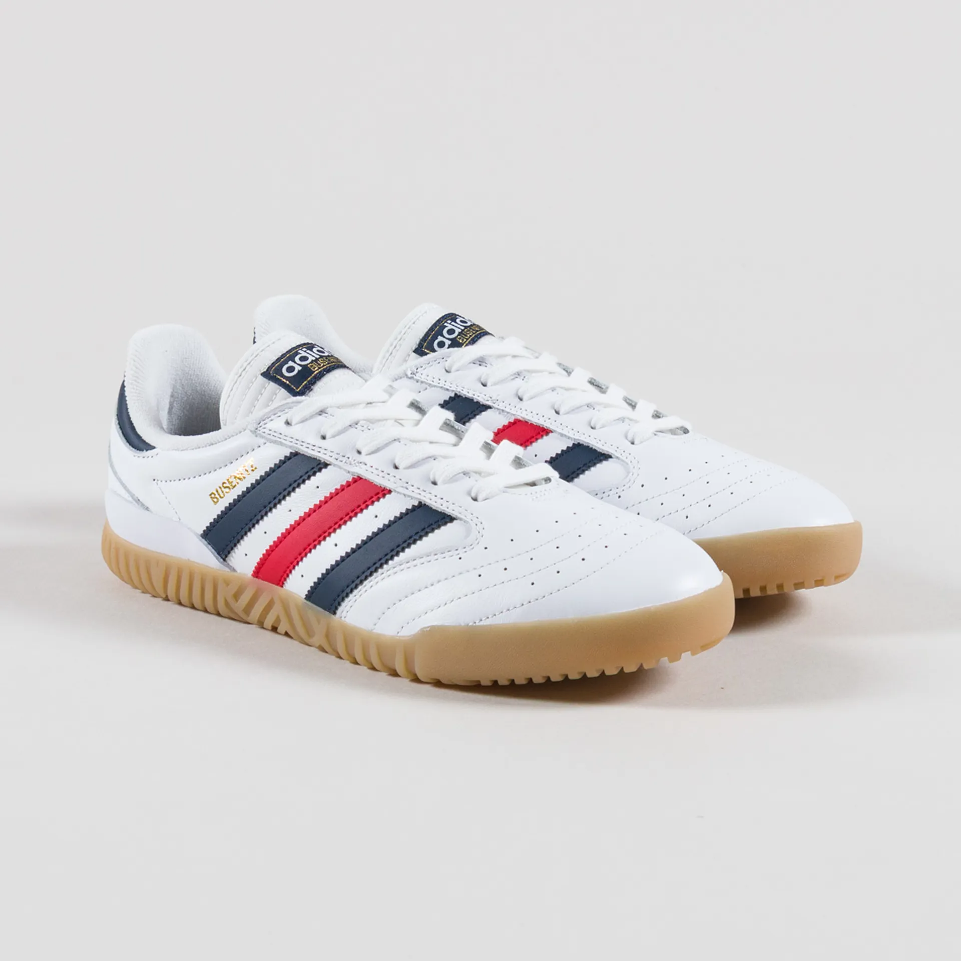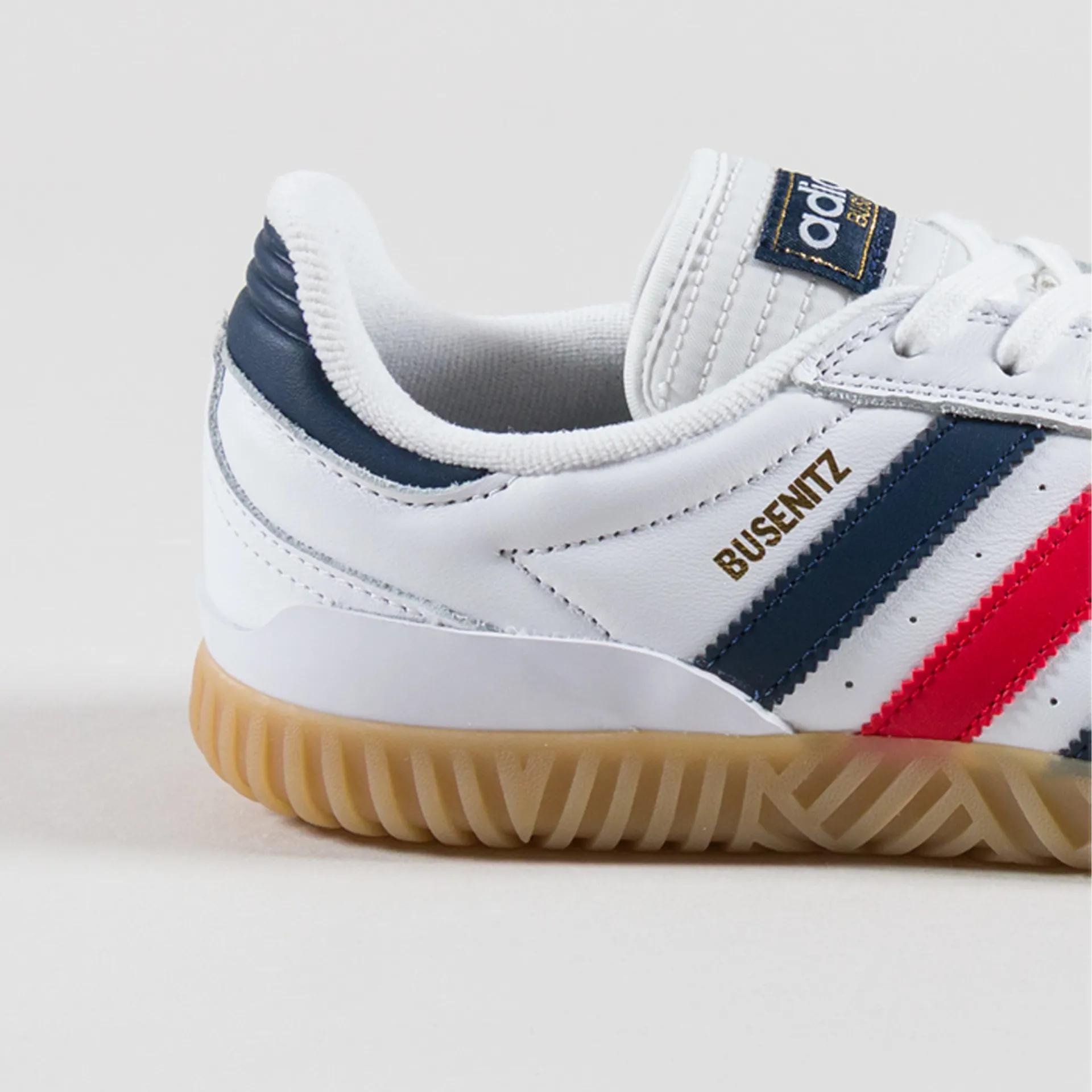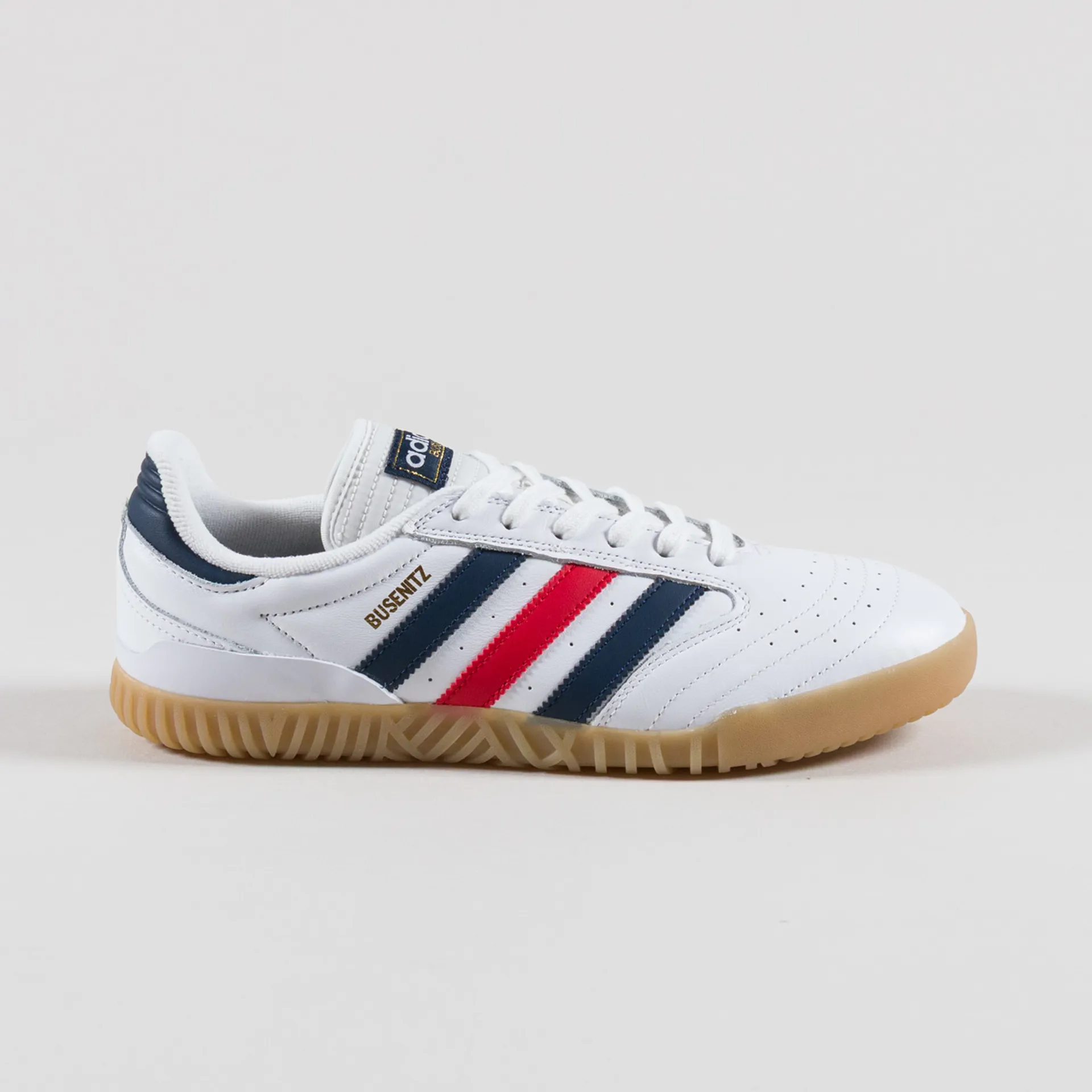 A new variation of Adidas Skateboarding's Busenitz silhouette, made from an upper of leather with a padded mesh lining, canvas tongue and an expanded PU sockliner. It has a rubber outsole which takes inspiration from Adidas' Indoor collection with a new grippy side and tread. Branding is pretty classic with a woven logo patch to the tongue and golden script to the side.