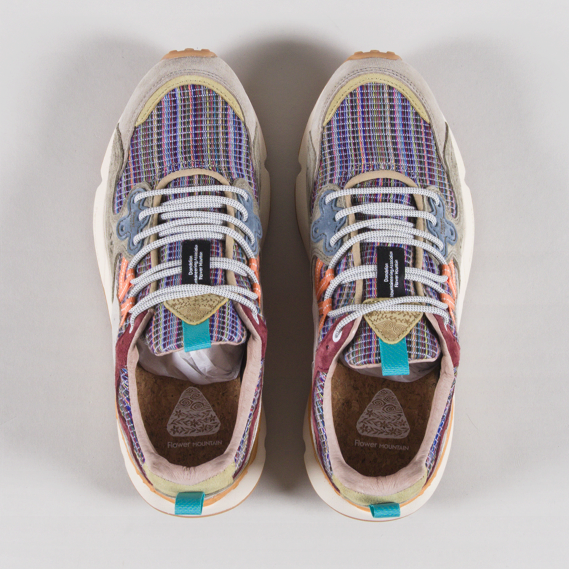 The Yamano 3 Shoe from Flower Mountain is built from a tough mix of cotton stripe fabric through the toe, tongue and collar, reinforced with leather and suede around the foxing and heel for durability and structure. Inside, you get a soft, pre-broken leather lining and a lightly padded collar, plus a cork insole that keeps things comfortable underfoot.