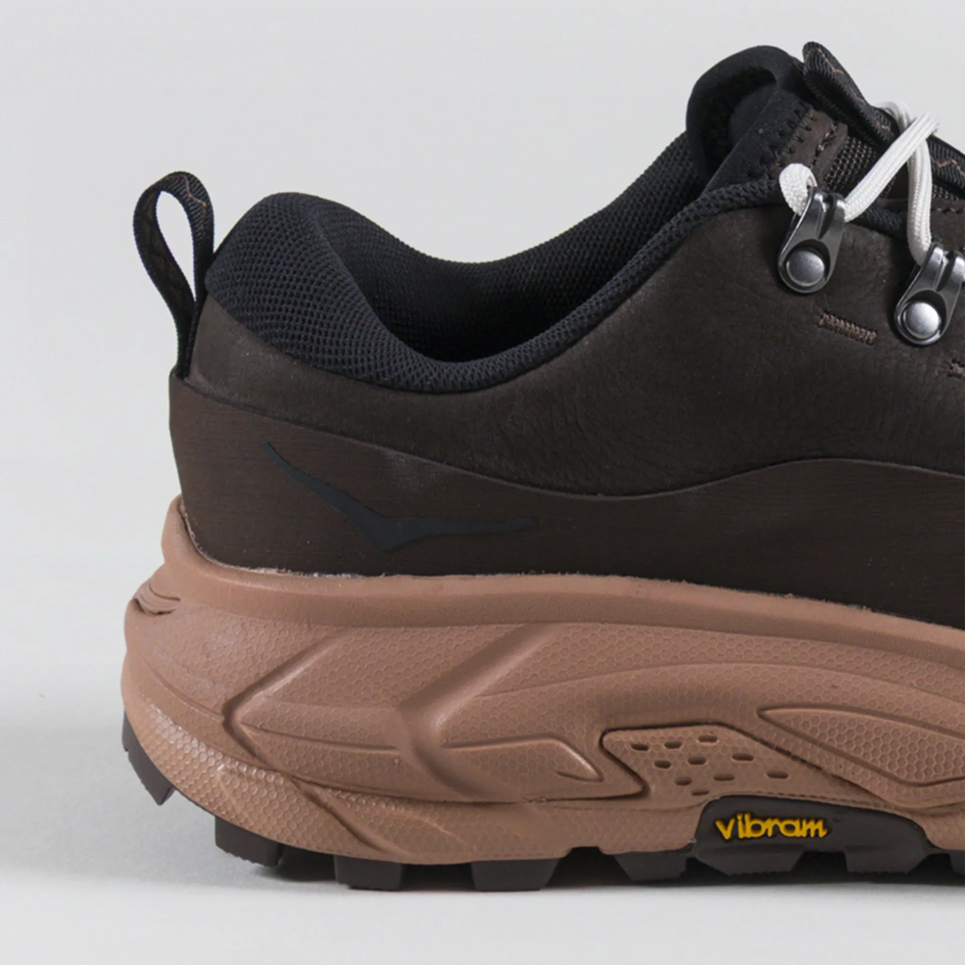 The Tor Summit Shoes are an alpine-inspired silhouette that pays homage to the classic hiker, featuring premium nubuck leather uppers with metal eyelet hardware and zig-zag stitching on the heel and tongue webbing. The Vibram megagrip outsole is constructed from a high-performance rubber compound that provides grip on both dry and wet terrains, and the rubber mud guard prevents the uppers from getting mucky. Branding consists of the HOKA symbol on the uppers and a Vibram logo to the outsole.