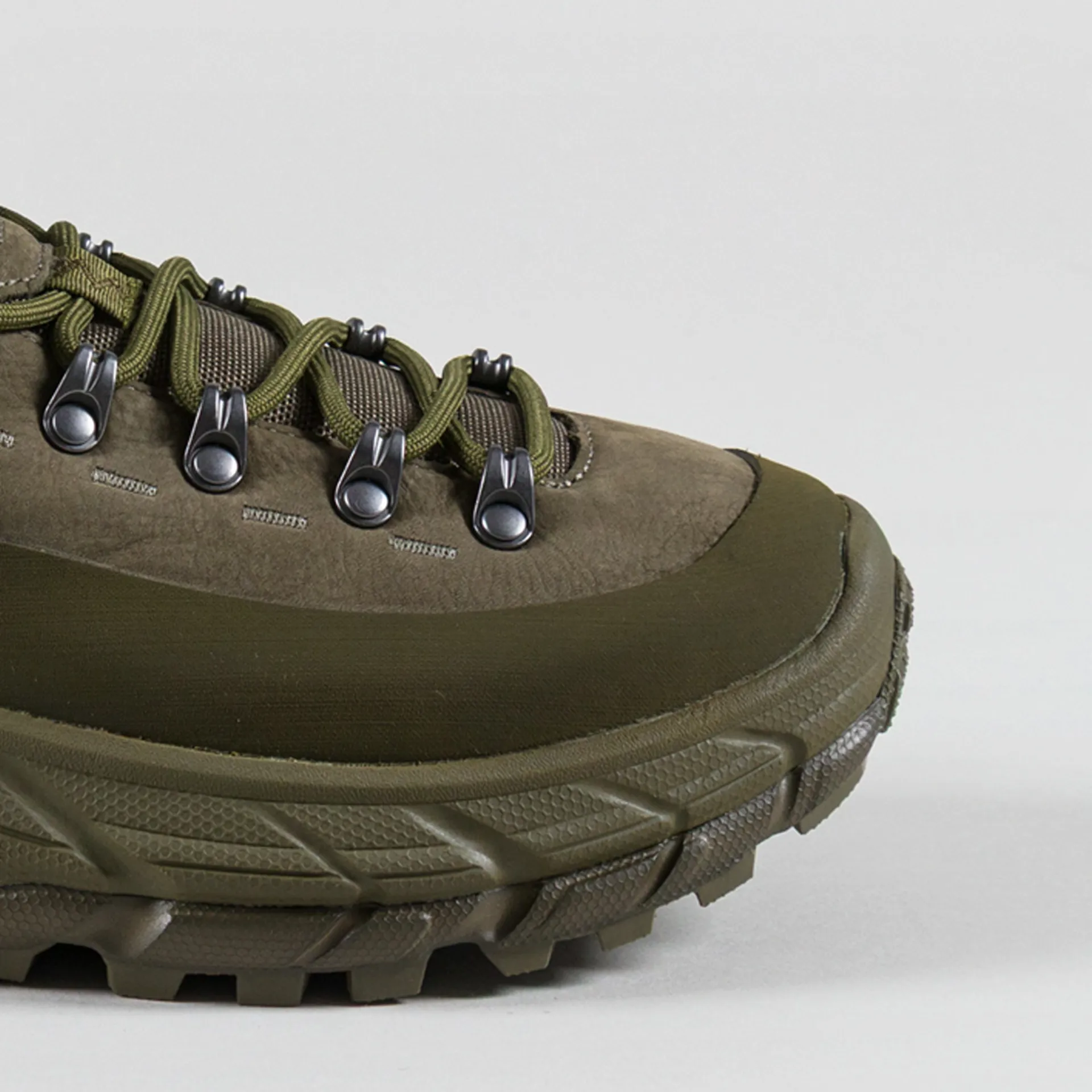 The Tor Summit Shoes are an alpine-inspired silhouette that pays homage to the classic hiker, featuring premium nubuck leather uppers with metal eyelet hardware and zig-zag stitching on the heel and tongue webbing. The Vibram megagrip outsole is constructed from a high-performance rubber compound that provides grip on both dry and wet terrains, and the rubber mud guard prevents the uppers from getting mucky. Branding consists of the HOKA symbol on the uppers and a Vibram logo to the outsole.